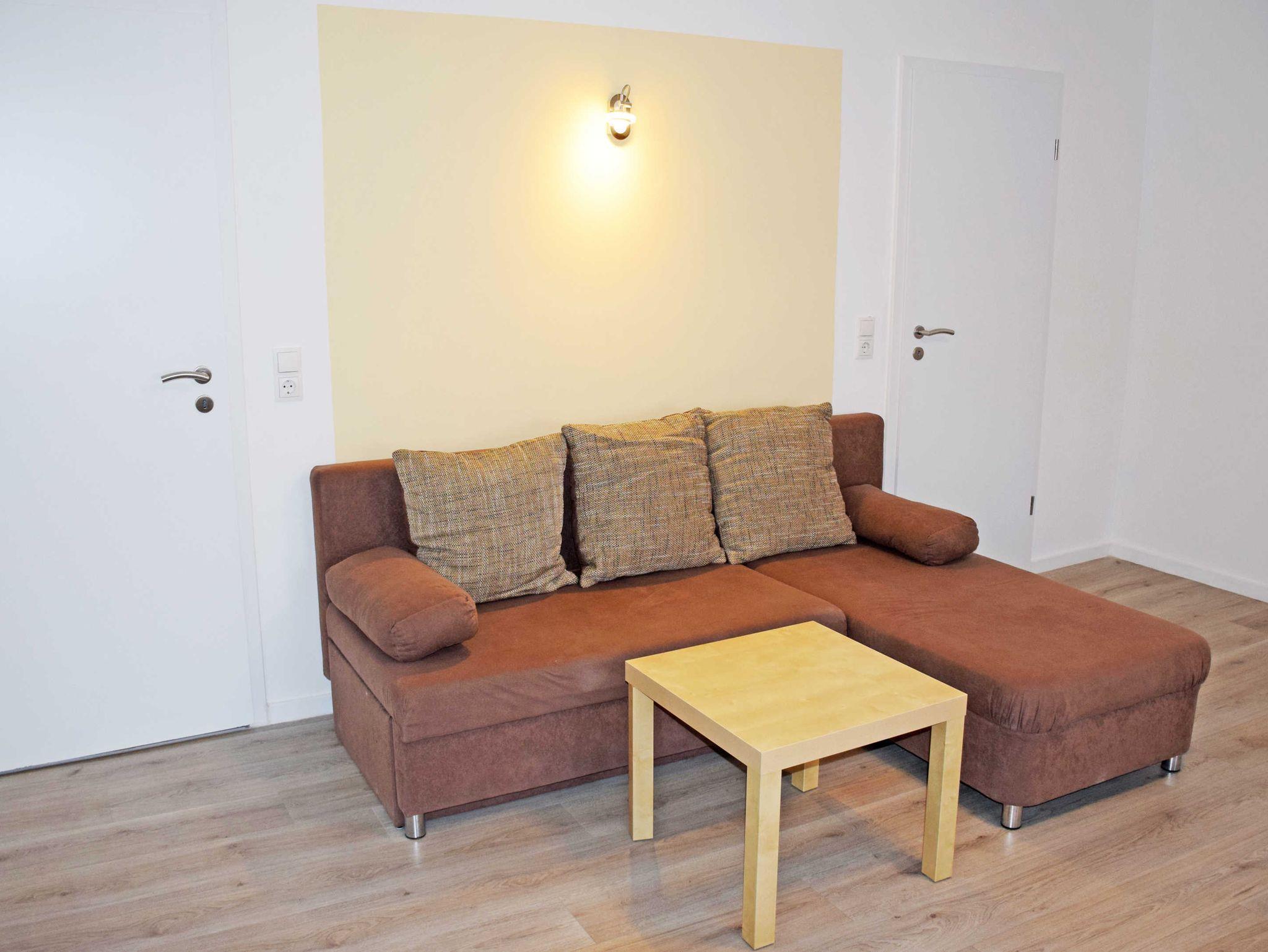 Im Wohnzimmer gibt es eine Sitzcouch mit Tisch, eine Lesestehlampe und ein Flachbild-TV. Hier steht auch ein Esstisch mit Stühlen. Die moderne Küche verfügt über eine Spüle, einen 2-Cerankochfeldherd, Kaffeemaschine und Wasserkocher sowie einen Kühlschrank.