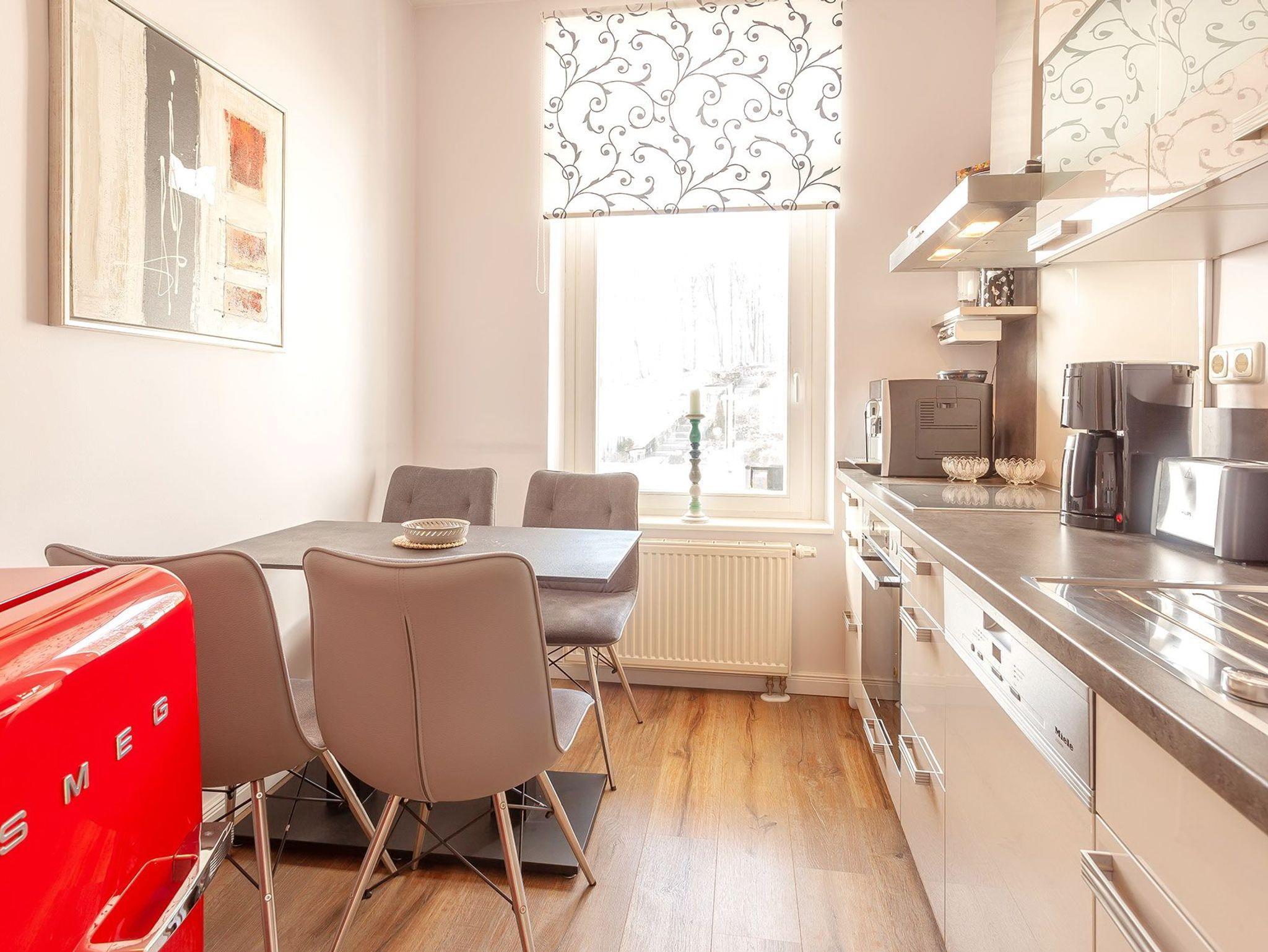 Die separate Küche mit Ess- [&] Kochbereich enthält eine moderne Einbauküche ausgestattet mit neuen, modernen MIELE-Geräten, wie Backofen, Cerankochfeld und Spülmaschine. Dazu kommen eine Kaffeemaschine und/oder für den Genießer ein Kaffeeautomat sowie ein moderner Kühlschrank mit Gefrierfach. Toaster, Wasserkocher, einer Vielzahl von Küchenhelfern vervollständigen die Ausstattung. Hier können Sie Ihre Köstlichkeiten selbst kreieren. Im Essbereich ist für 4 Personen Platz. Ein Hochstuhl für die Kleinen ist selbstverständlich auch vorhanden.