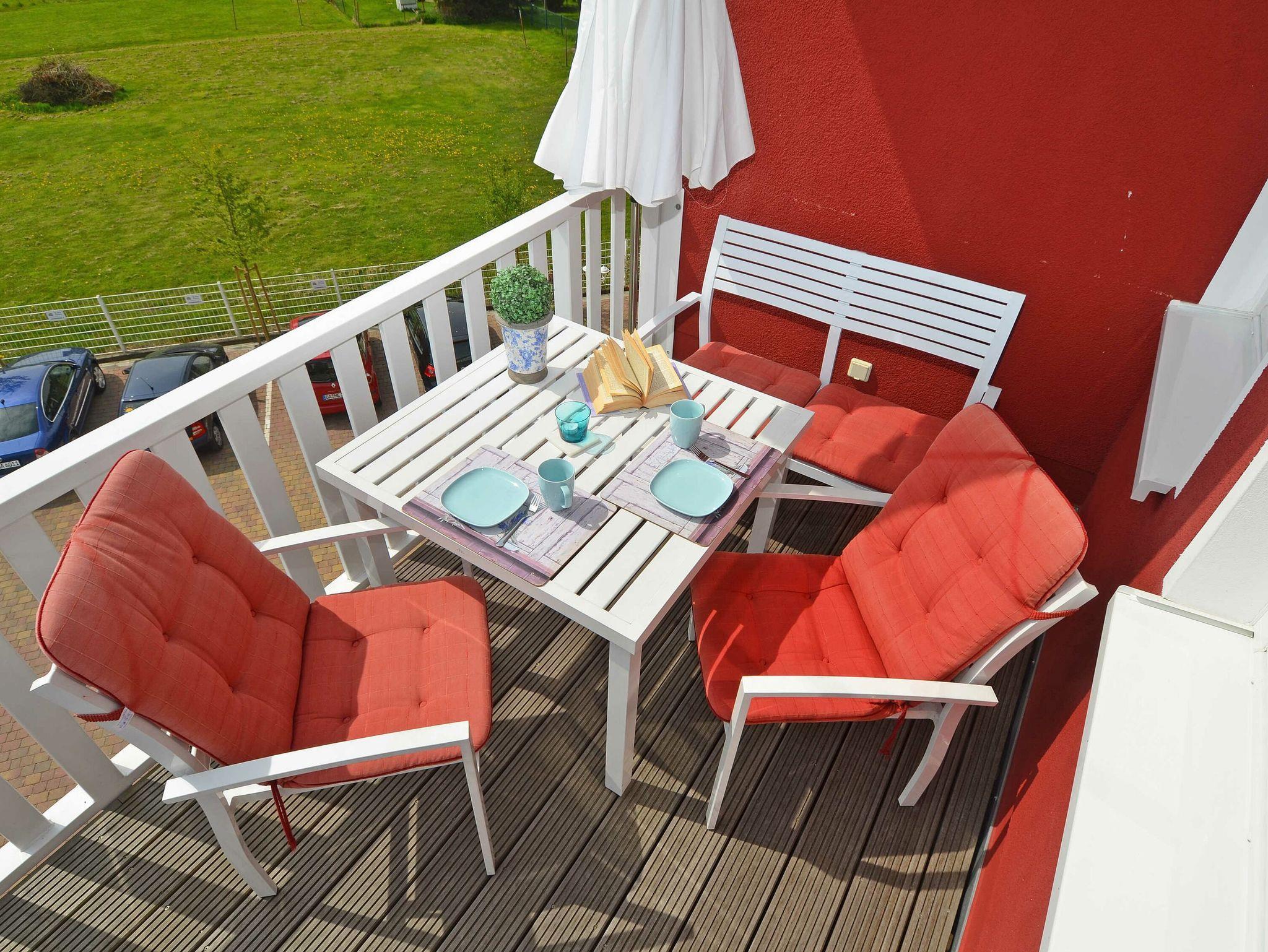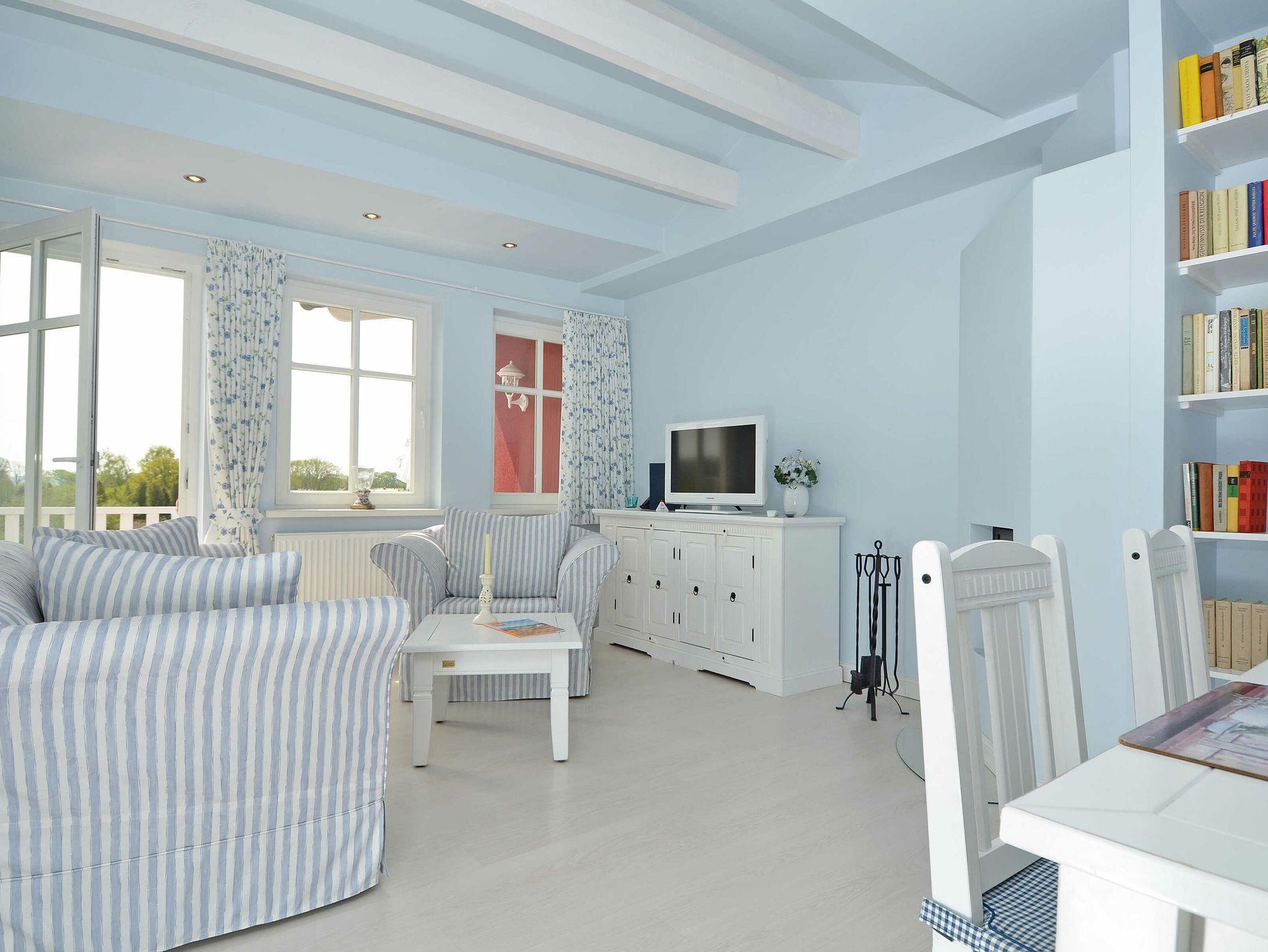 Wohnung 7: Dieses besondere 3-Raum-Appartement im Dachgeschoss ist im weißen Landhausstil eingerichtet und hat eine Wohnfläche von ca. 64 m² sowie einen großen möblierten Balkon (ca. 11 m²) zur sonnigen Südseite.