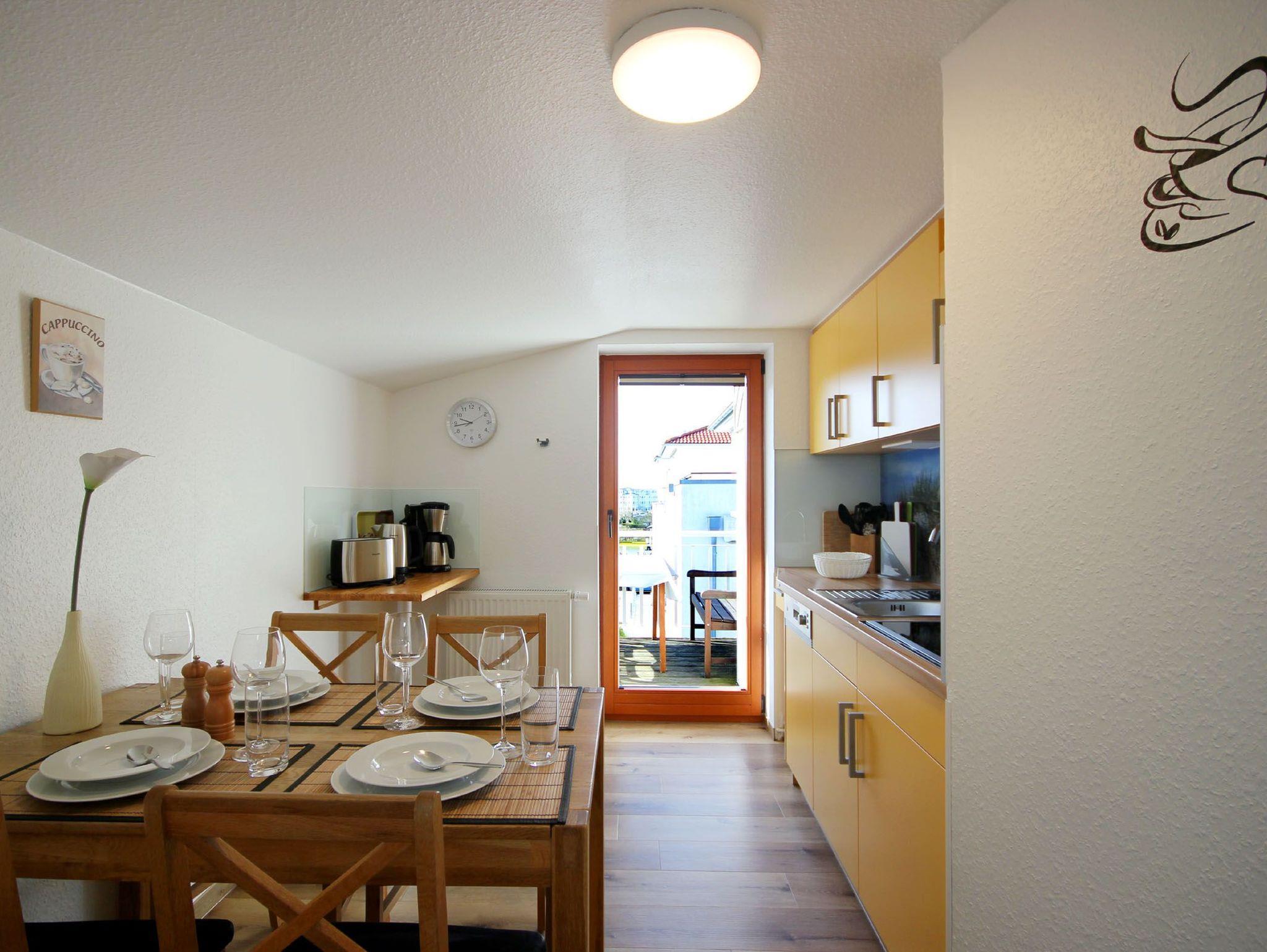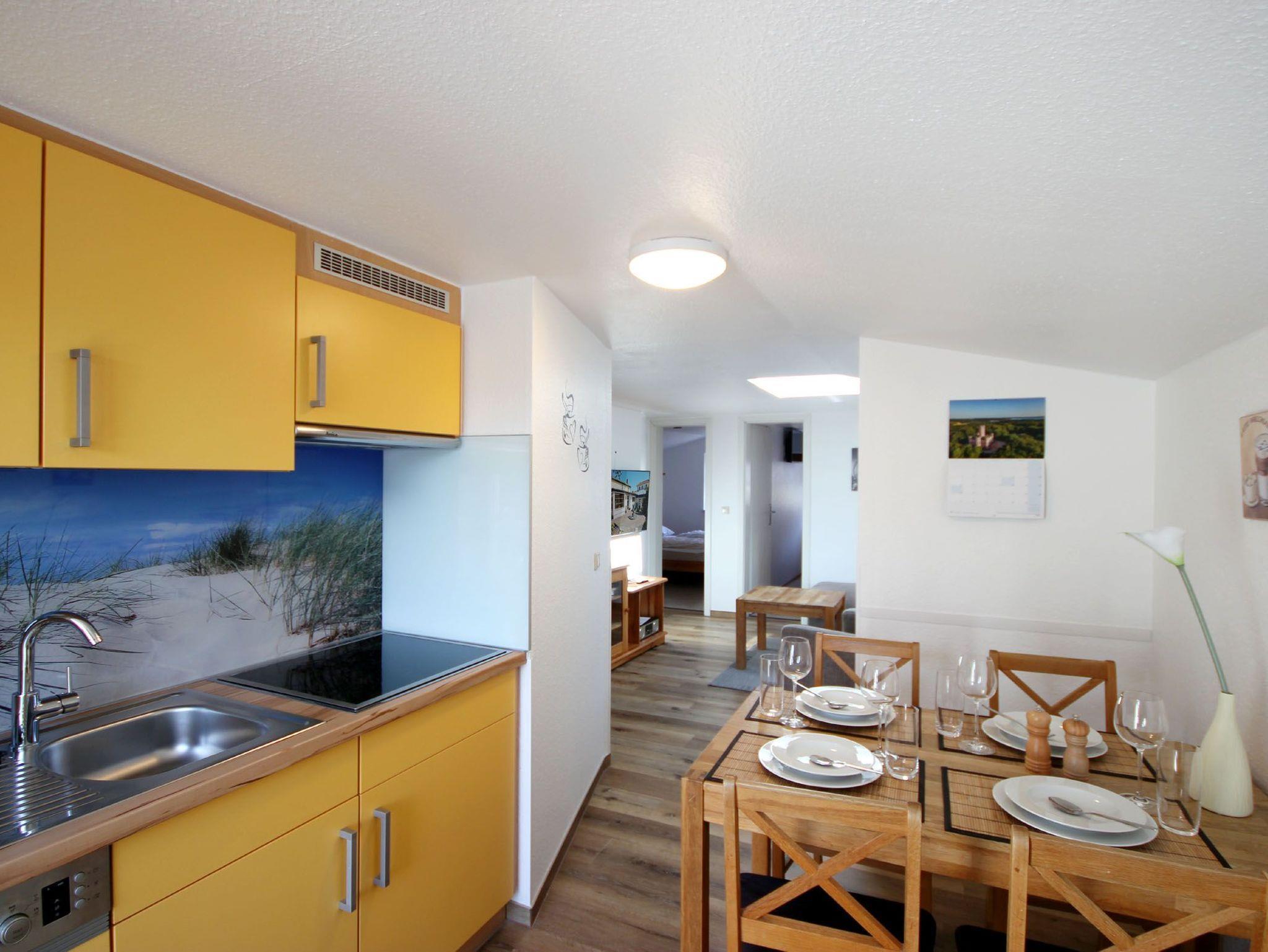 Ihre 3-Raum Nichtraucherwohnung 64RB1 befindet sich im 1. Obergeschoss des Hauses und somit in der Endetage. Sie besitzt eine Größe von ca. 55 qm und ist für max. 4 Personen belegbar sowie komplett eingerichtet. Das Appartement teilt sich auf in einen gemütlichen Wohnbereich mit bequemer Sitzecke, separate Küche mit Zugang zum sonnigen Balkon, zwei separate Schlafzimmer und ein Tageslichtbad. Neben dem schönen Wohnraum mit Flachbildfernseher, WLAN und Radio mit CD-Player sind beide Schlafräume mit je einem Doppelbett, Kleiderschrank und Verdunklungsmöglichkeit ausgestattet. Ein Schlafzimmer verfügt über ein zusätzliches TV-Gerät. Die Küche mit Essplatz für 4 Personen ist komplett mit Cerankochfeld, Dunstabzugshaube, Kühlschrank, Geschirrspüler, Kaffeemaschine, Wasserkocher, Toaster und weiteren diversen Küchenhelfern eingerichtet. Im modernen Badezimmer erwartet Sie eine Dusche, WC, fest installierter Fön und ein Waschbecken. Als weiteres Highlight steht Ihnen im gemeinschaftlichen Gartenbereich eine extra Grillecke zum Verweilen sowie ein Spielturm mit Rutsche und Schaukeln zur Verfügung. Ein wohnungseigener PKW ? Stellplatz sowie Unterstellmöglichkeiten für Ihre Fahrräder sind direkt am Haus vorhanden. Eine hauseigene Waschmaschine steht Ihnen gegen Gebühr zur Verfügung.