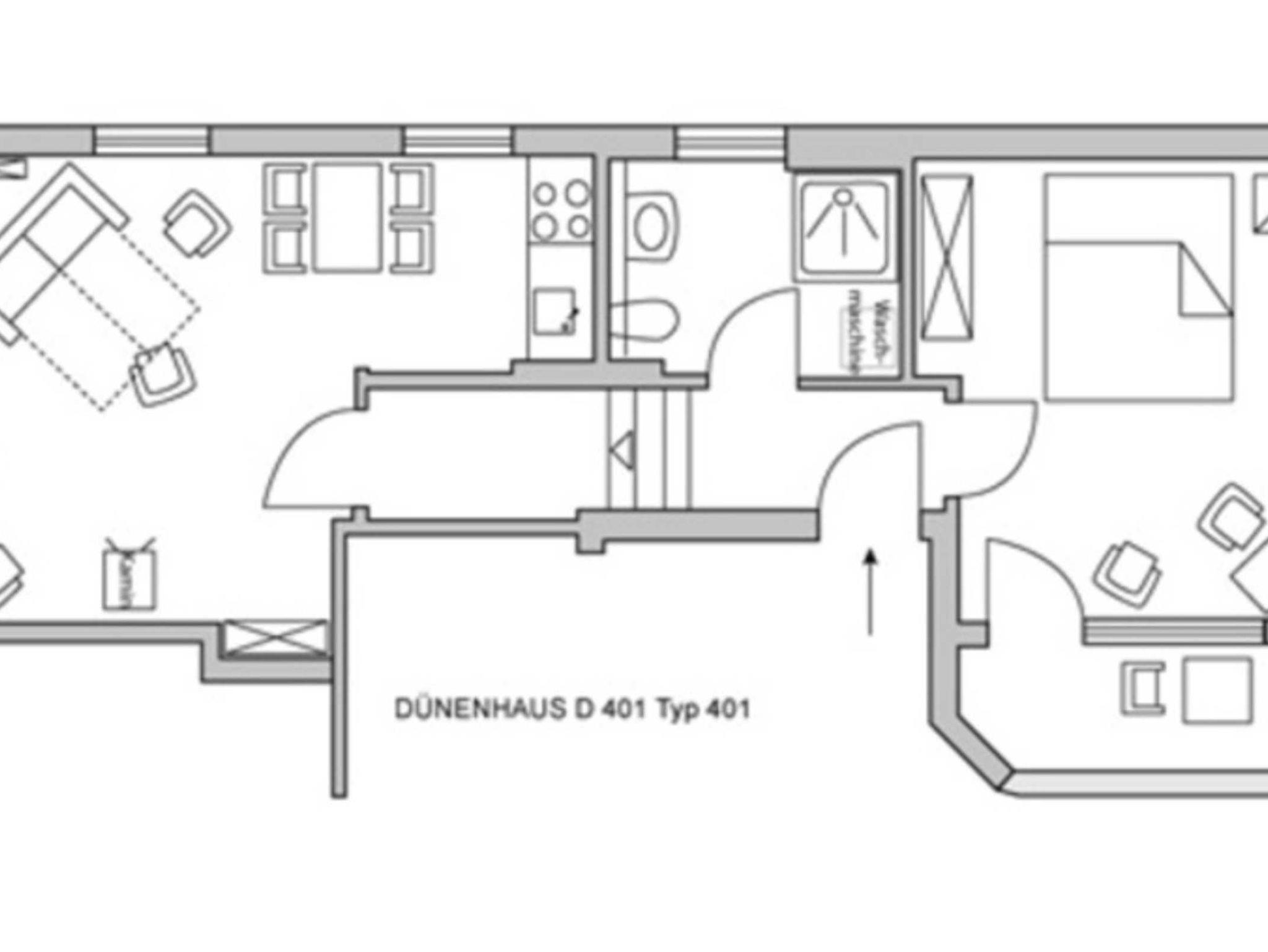Die gradlinig-nordisch ausgestattete großzügige Zweizimmer-Ferienwohnung (D401) mit Balkon liegt im Dachgeschoss (3.OG) des restaurierten DÜNENHAUS und umfasst gut 50 qm. Sie hat ein Wohnzimmer mit Kaminofen und Schlafsofa sowie eine zum Wohnraum offene Küche mit Essplatz für vier Personen. Das Schlafzimmer mit Doppelbett verfügt über einen kleinen Balkon mit Blick zum Selliner See (Bodden). Das Wohnzimmer liegt zur Wilhelmstraße.