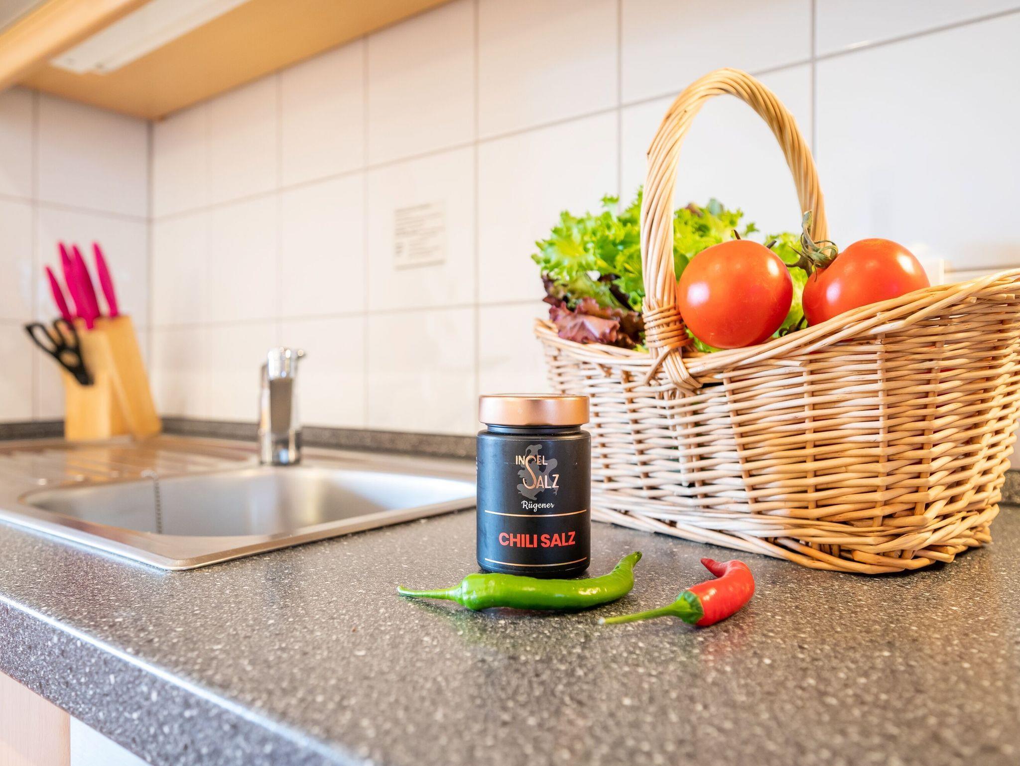 Die Küchenzeile ist mit einem Kühlschrank, einem Ceranfeld mit Backofen, einer Spülmaschine und einer Mikrowelle ausgestattet. Ebenso finden sich hier alle nötigen Küchenkleingeräte (Wasserkocher, Kaffeemaschine, Toaster..).