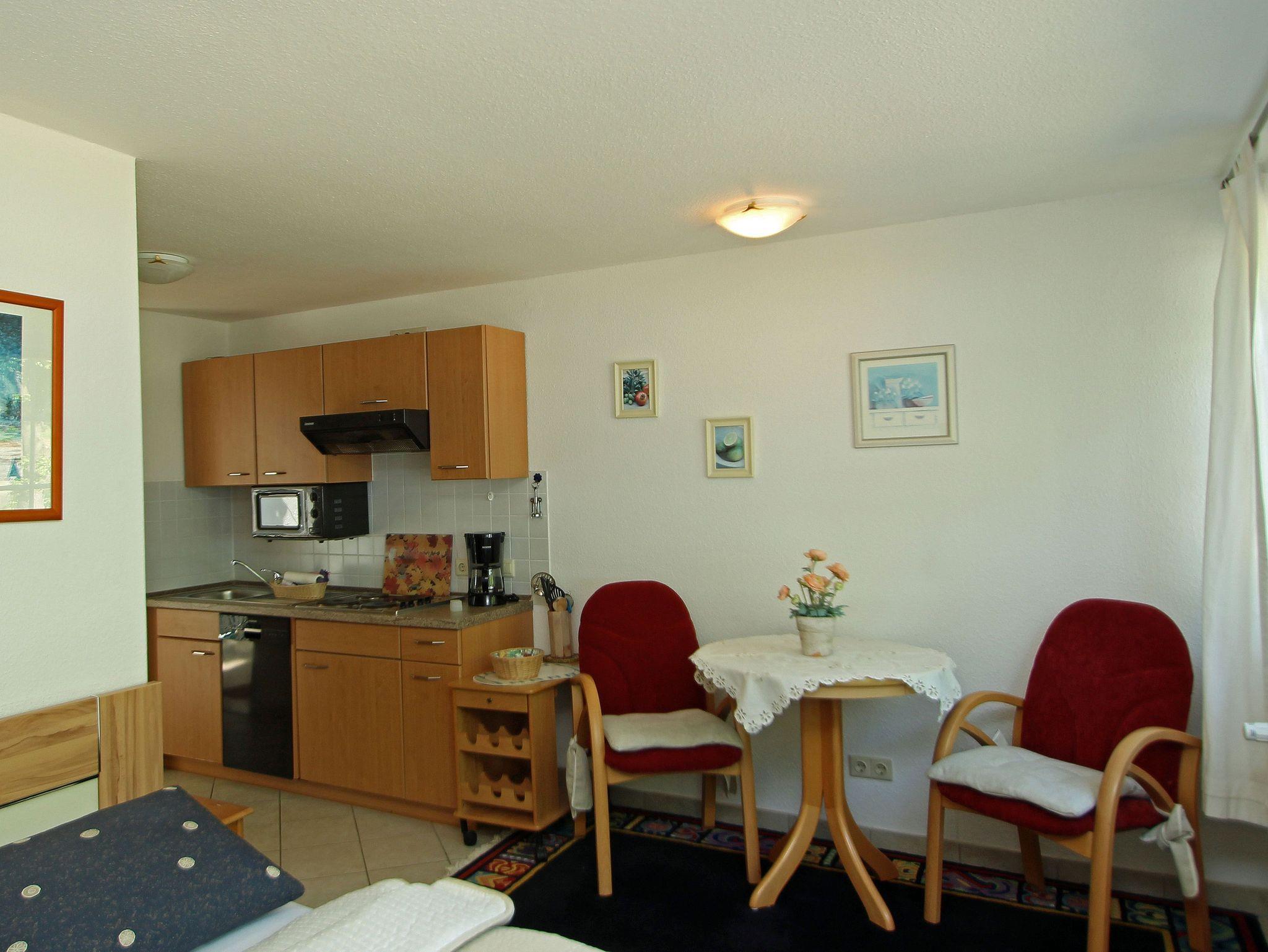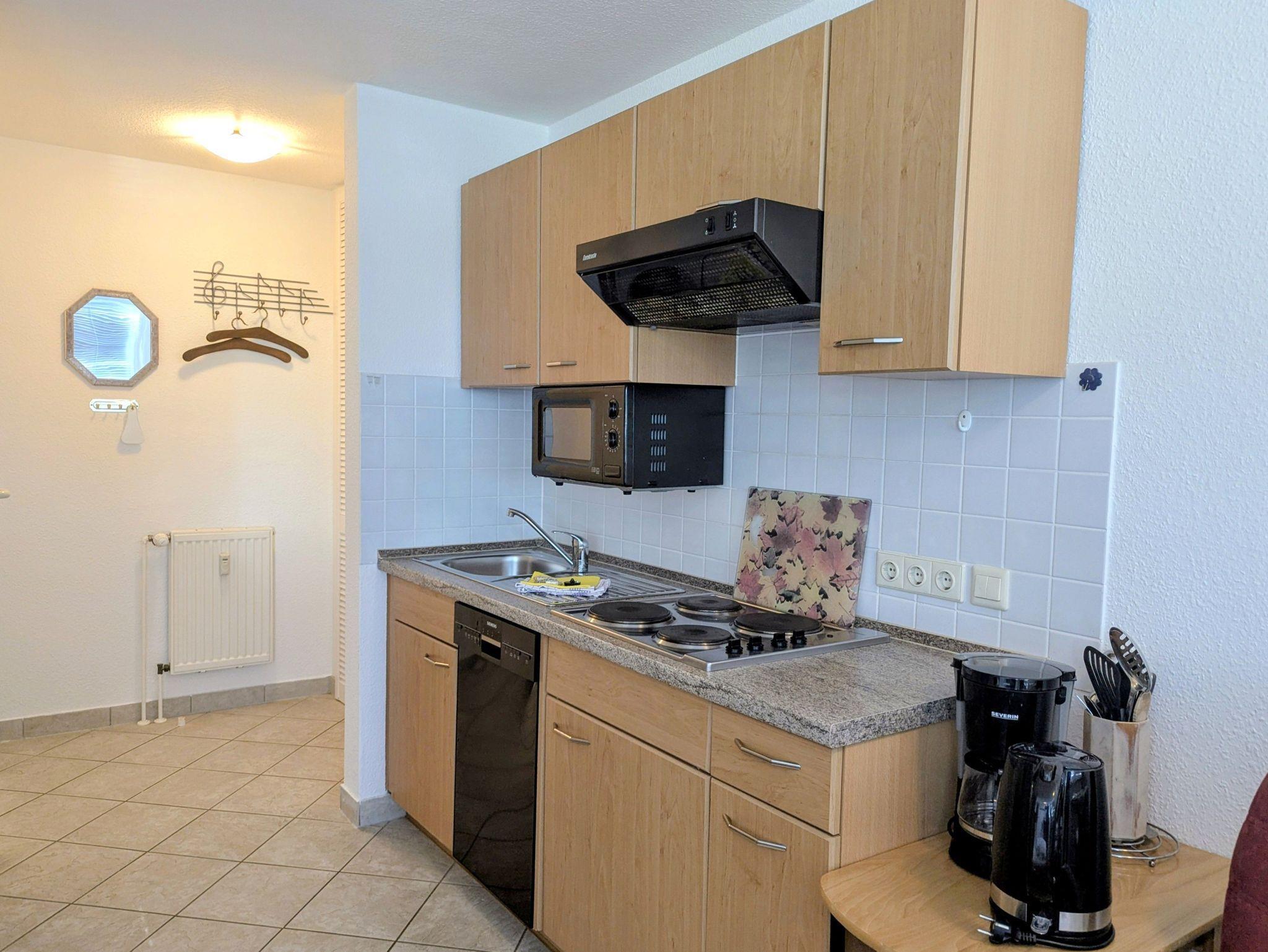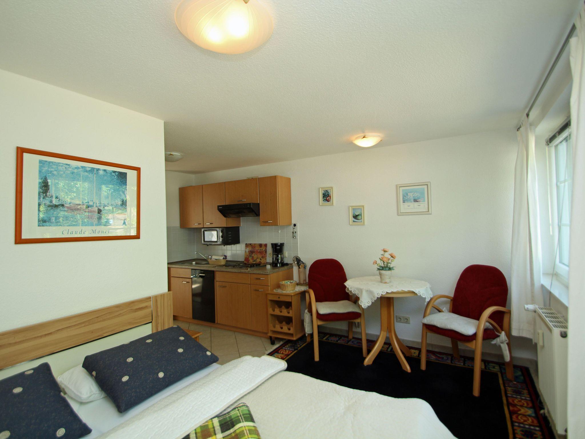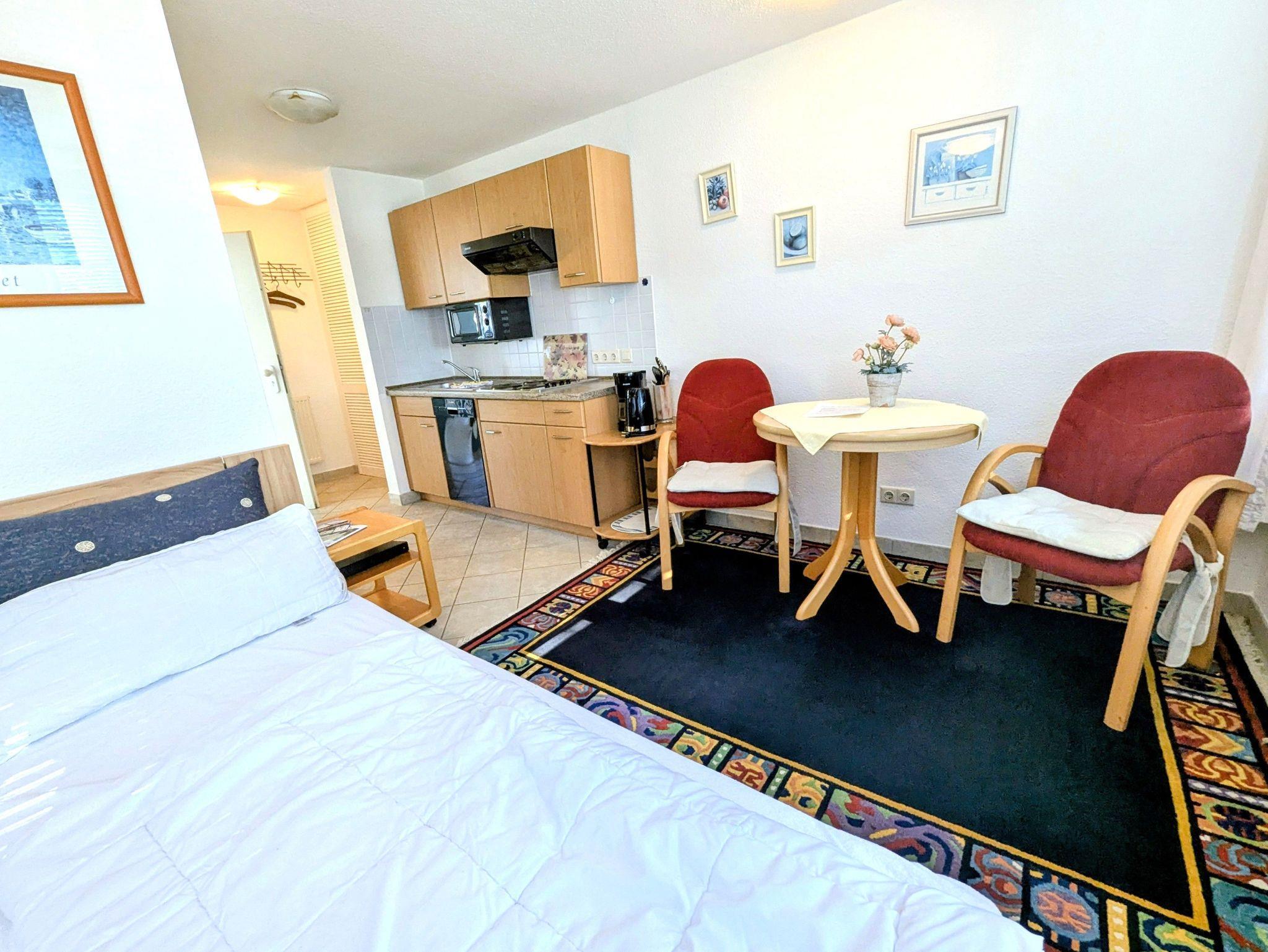 Das Studio ist ideal für 2 Personen und bietet zusätzliche Aufbettung für ein Kleinkind.. Es besteht aus einem Wohn- Esszimmer mit Doppelbett, komplett ausgestatteter Küchenzeile und einem Bad mit Dusche und WC. Aus dem Fenster haben Sie einen Blick über den Neuensiener See zum Jagdschloss Granitz.