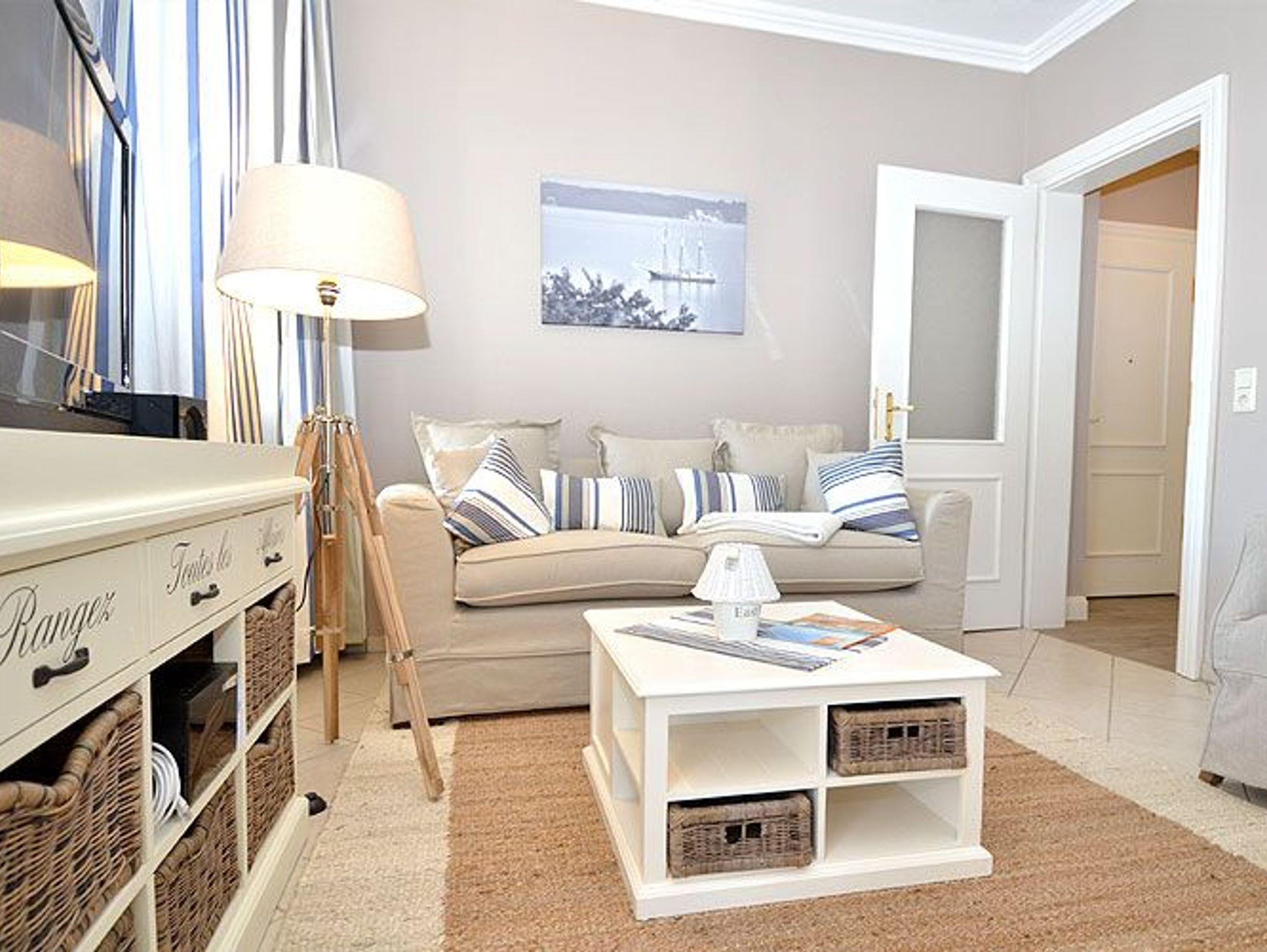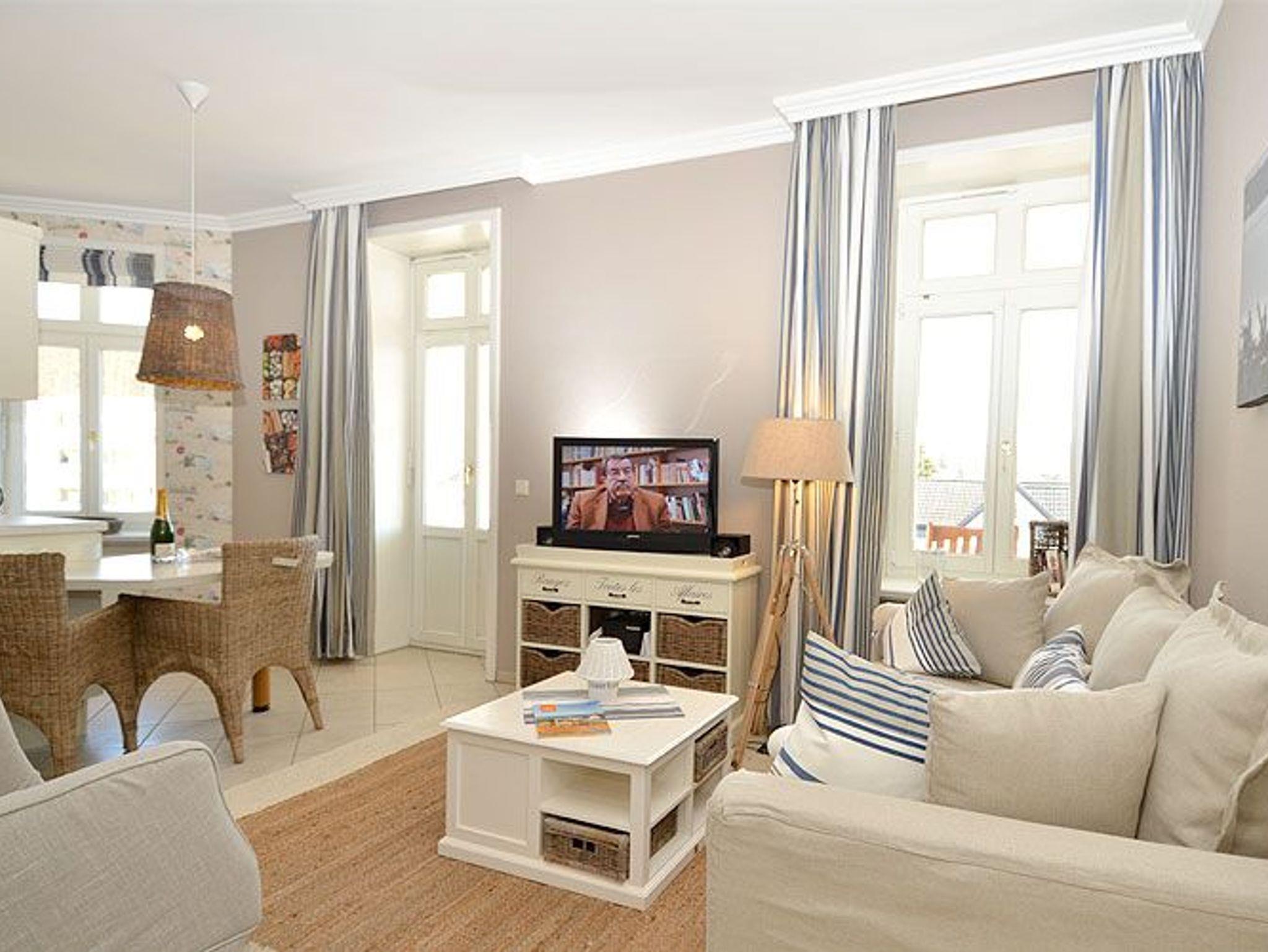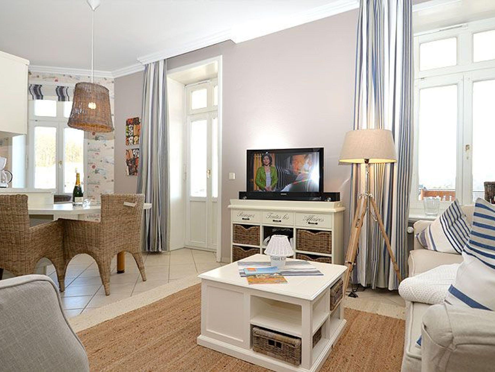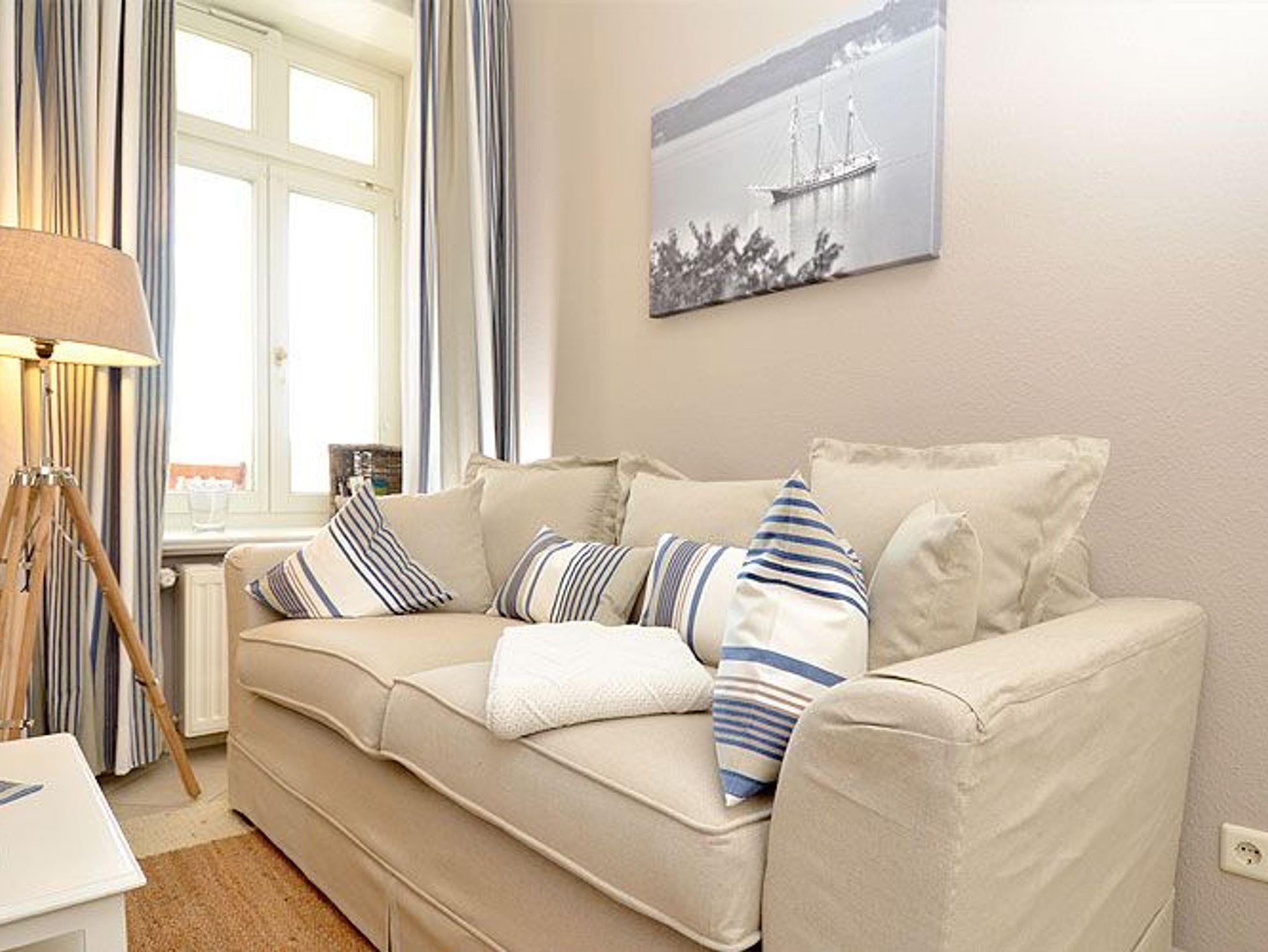 Dieses gut 40m² große und sehr stilvoll eingerichtete 2-Raum-Appartement erwartet Sie im 2. Obergeschoss und bietet u.a. einen 11m² möblierten Holzbalkon im Bäderstil zur Morgensonne mit Blick auf die Wilhelmstrasse. Die wunderschönen Landhausmöbel, ausgesuchte Stoffe und die warmen Erdtöne schaffen mit den leicht maritimen Akzenten ein ganz einzigartiges Wohlfühlambiente. Die gesamte Nichtraucherwohnung ist gefliest bzw. mit Designerboden in Vintage-Oak-Optik versehen.
