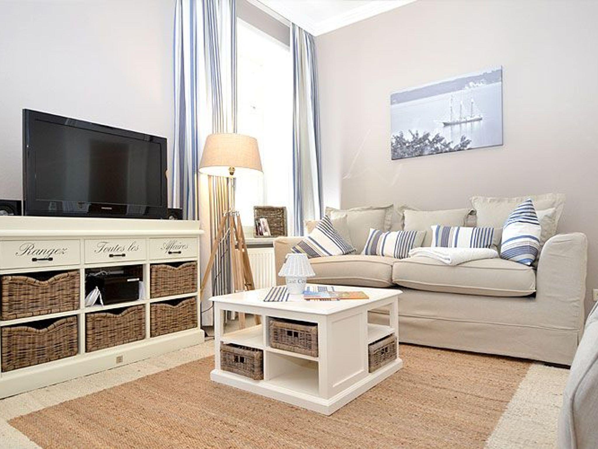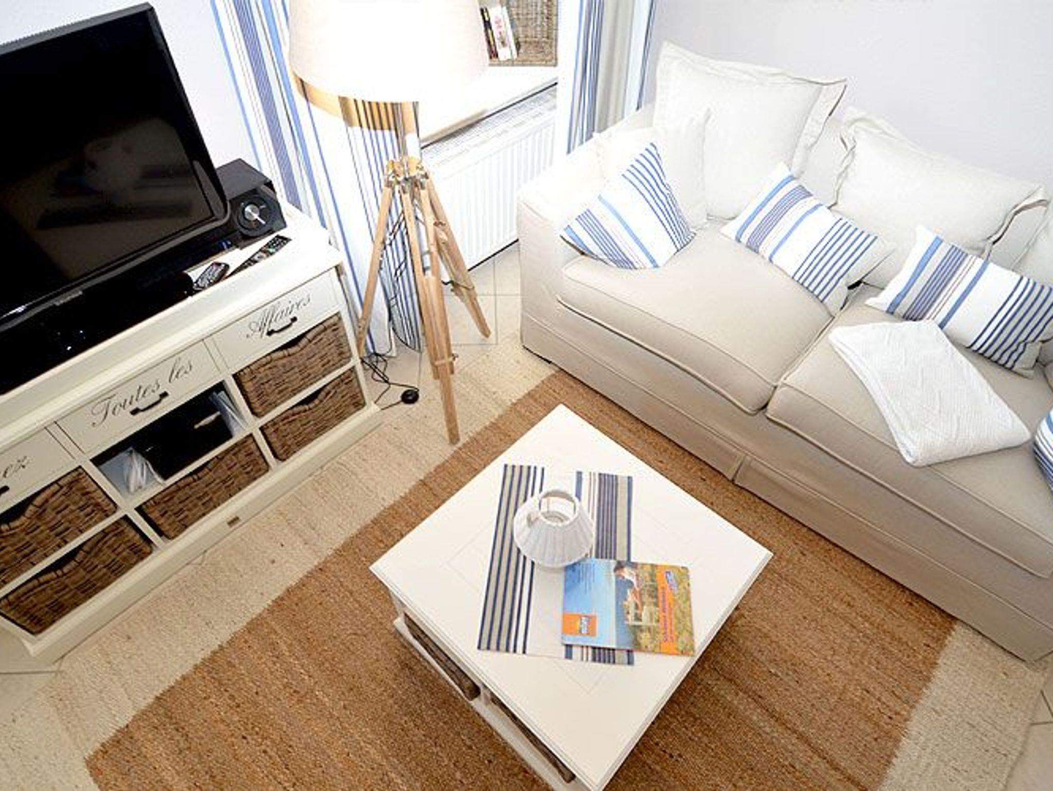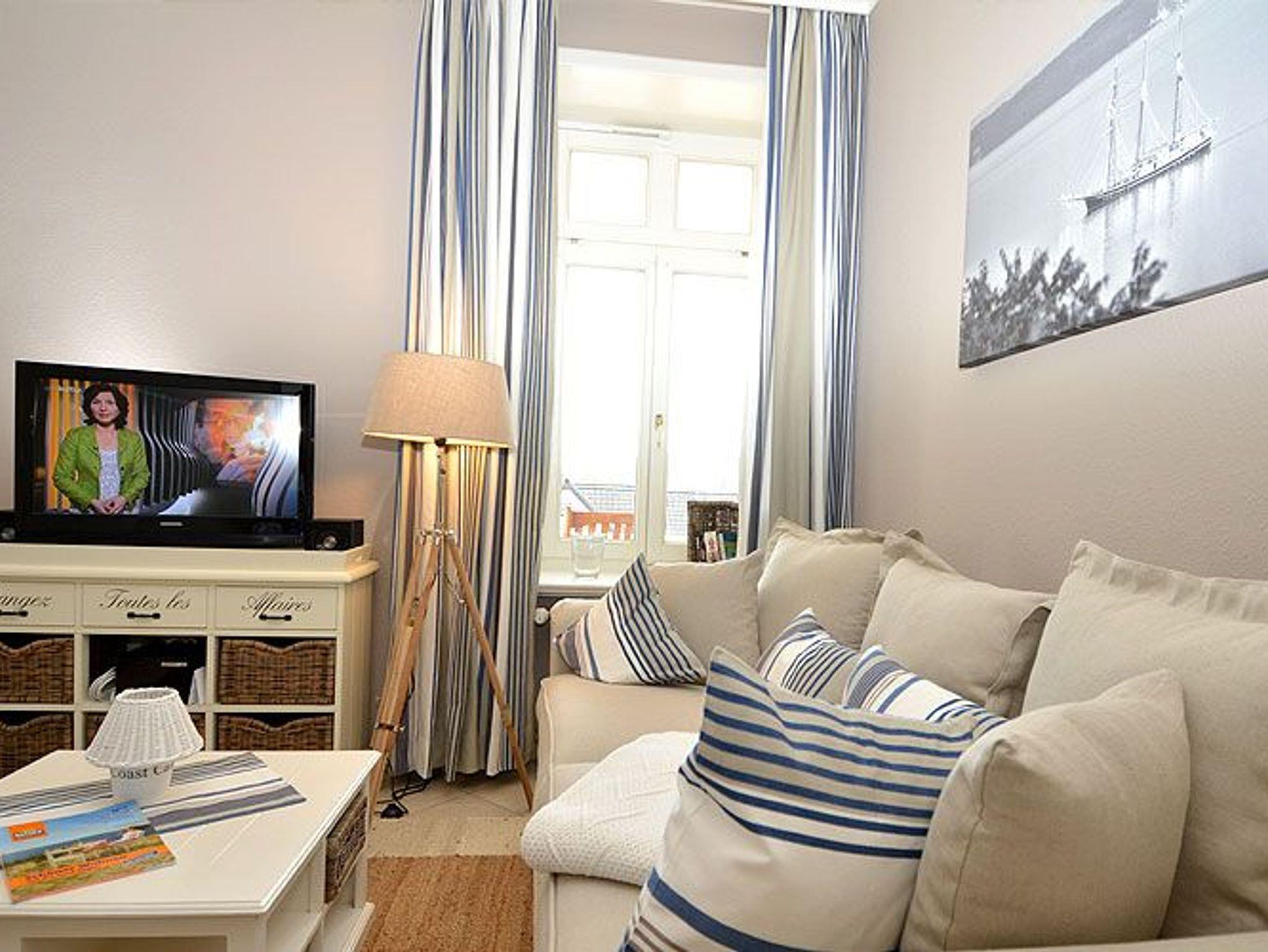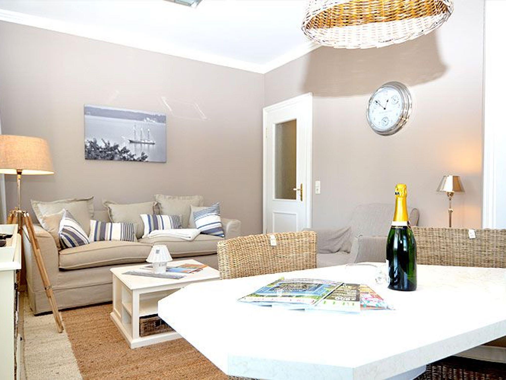 Dieses gut 40m² große und sehr stilvoll eingerichtete 2-Raum-Appartement erwartet Sie im 2. Obergeschoss und bietet u.a. einen 11m² möblierten Holzbalkon im Bäderstil zur Morgensonne mit Blick auf die Wilhelmstrasse. Die wunderschönen Landhausmöbel, ausgesuchte Stoffe und die warmen Erdtöne schaffen mit den leicht maritimen Akzenten ein ganz einzigartiges Wohlfühlambiente. Die gesamte Nichtraucherwohnung ist gefliest bzw. mit Designerboden in Vintage-Oak-Optik versehen.