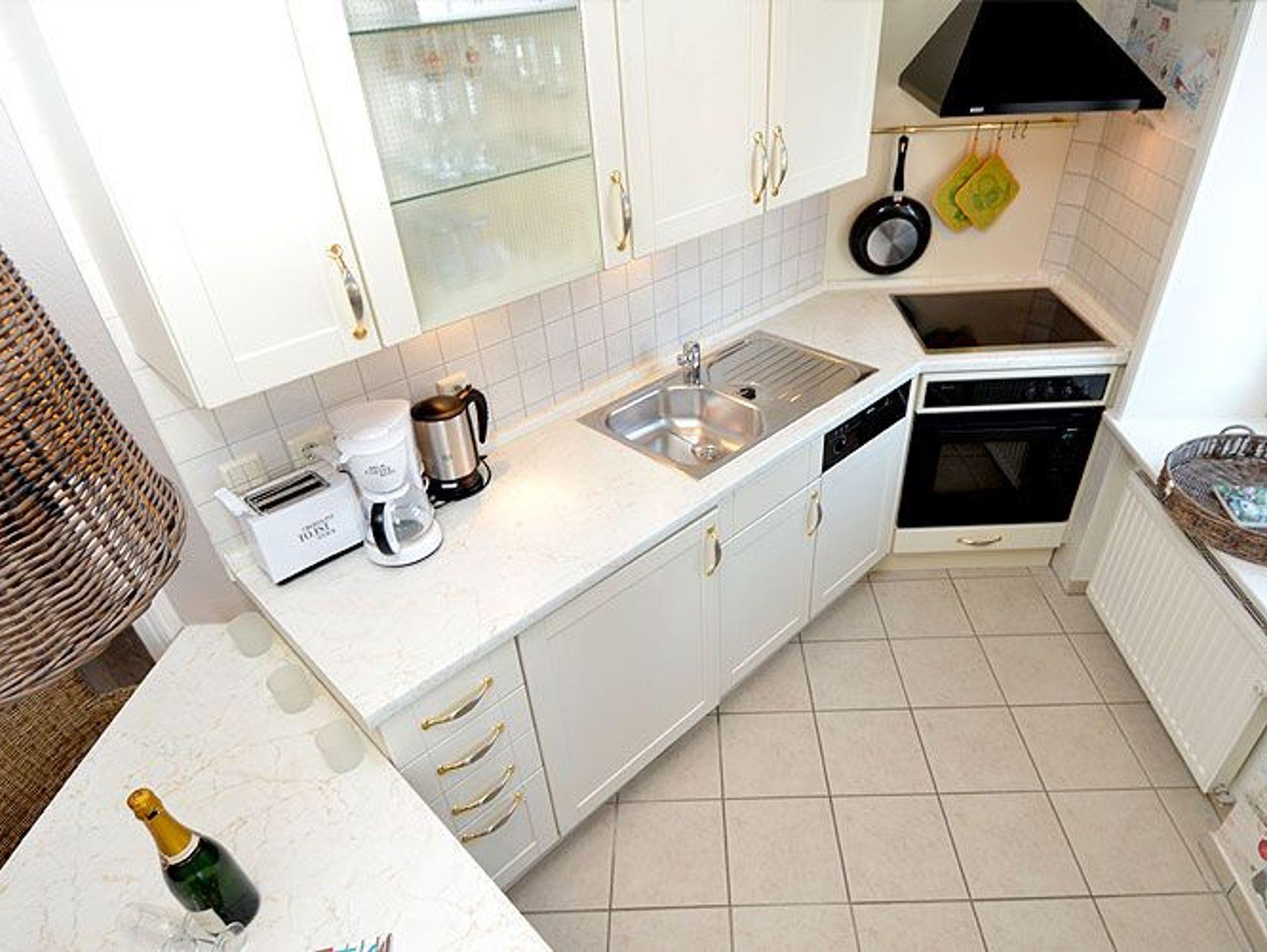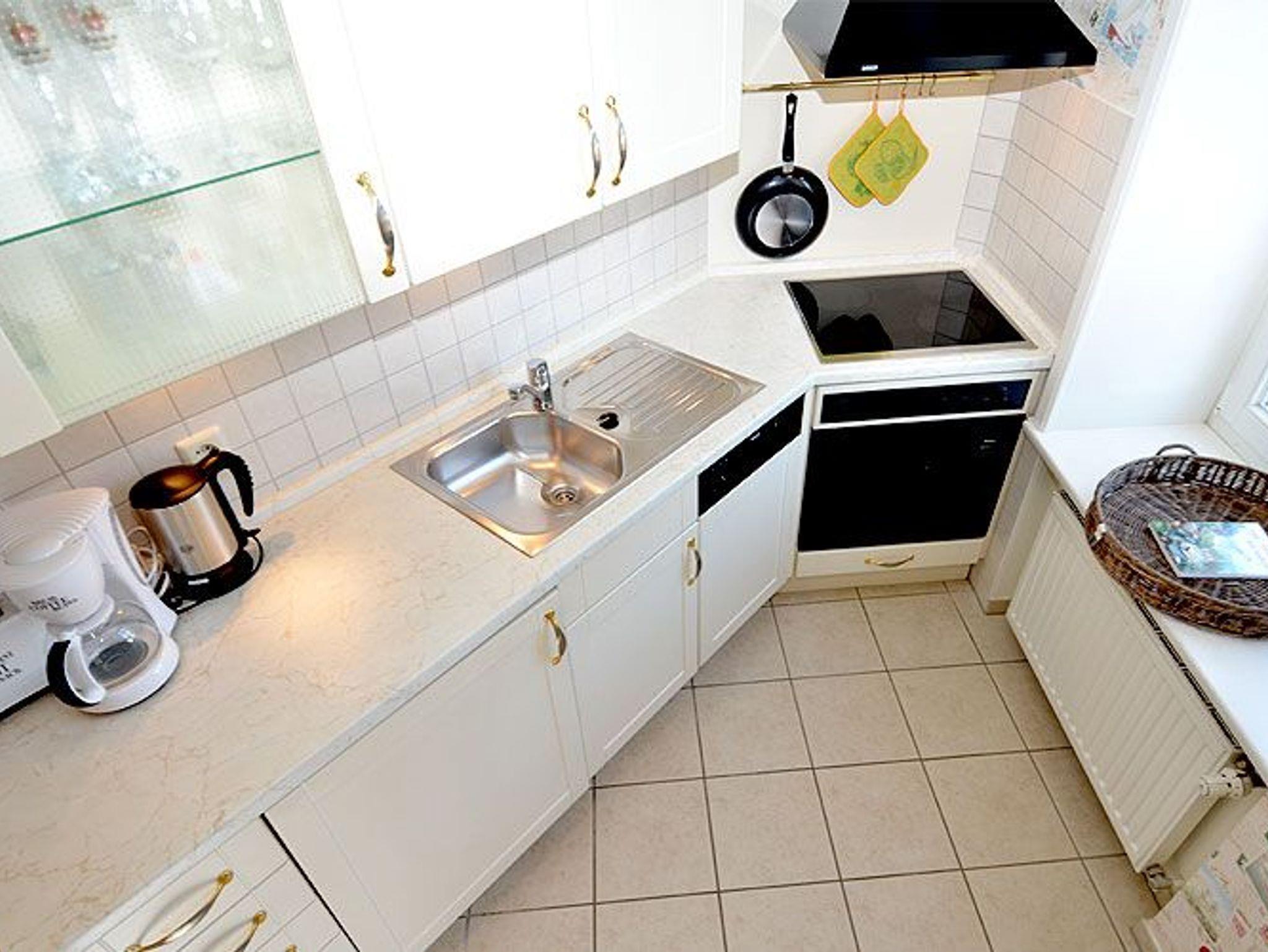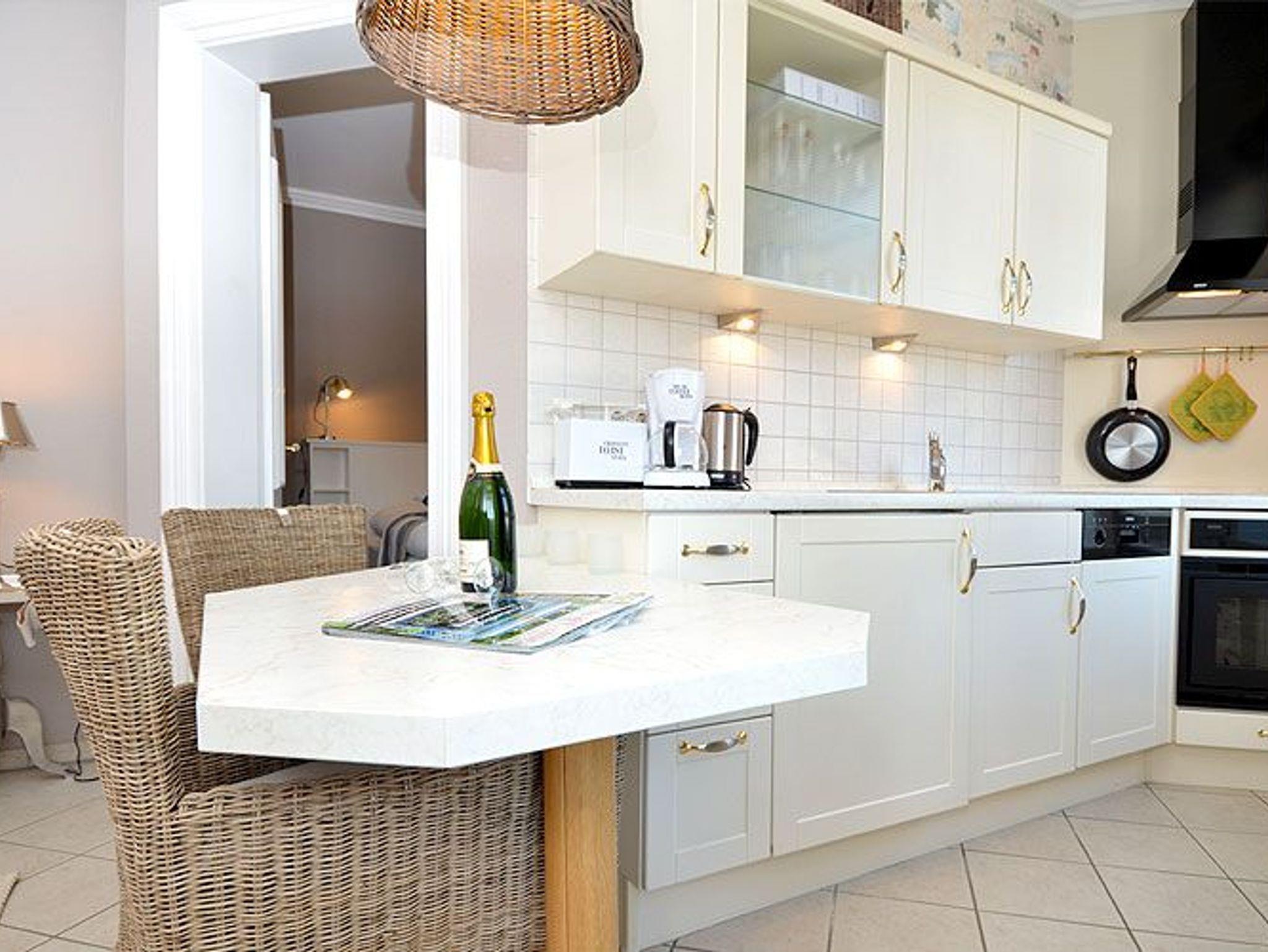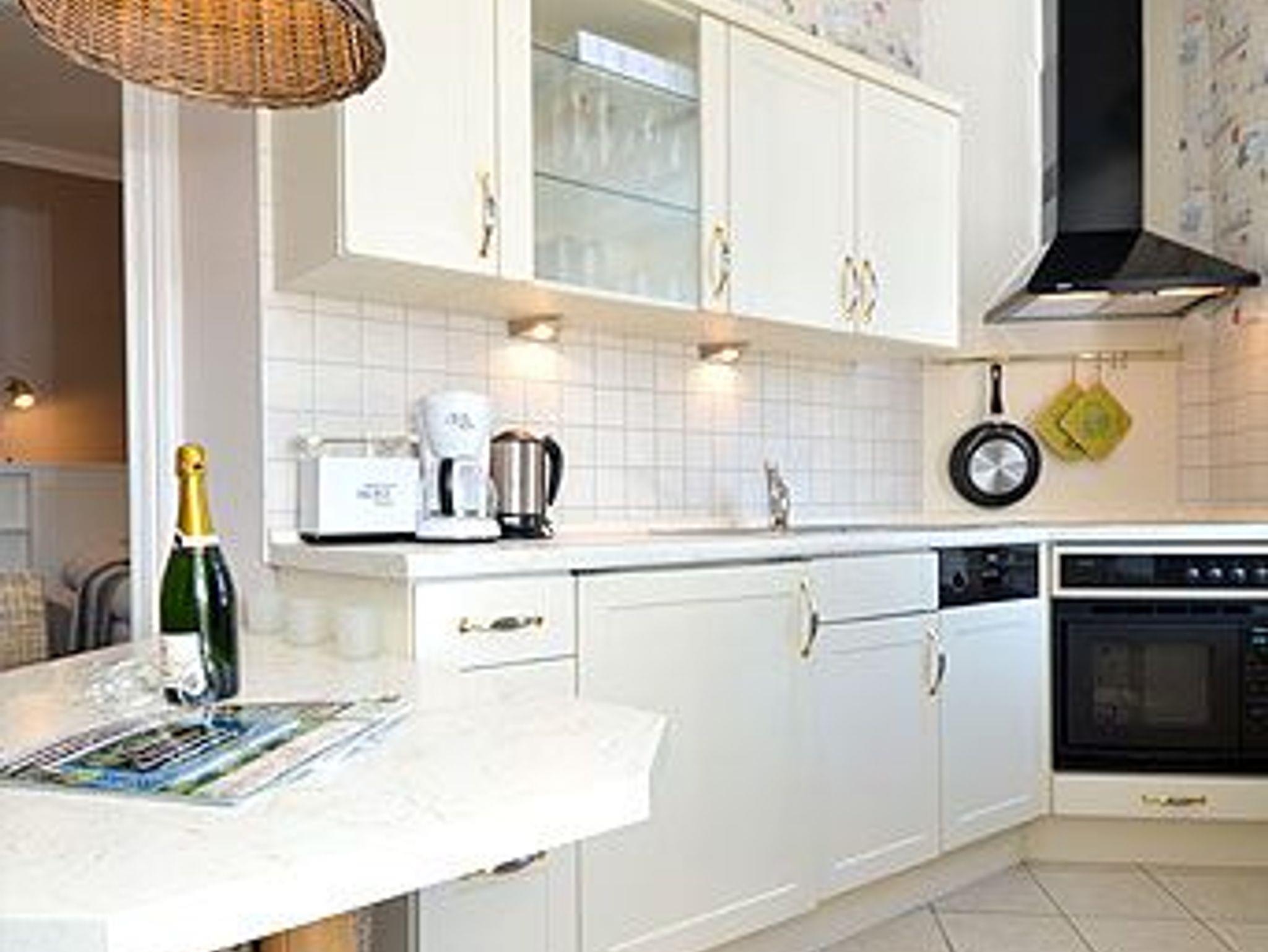 Die harmonisch im Wohnbereich integrierte Küchenzeile ist ausgestattet mit einem Kühlschrank mit Gefrierfach,[nbsp] einem 4-Platten-Ceranfeld, einer Spülmaschine, einer Mikrowelle mit Grillfunktion und diversem Kleininventar, das die Küchenausstattung komplettiert.