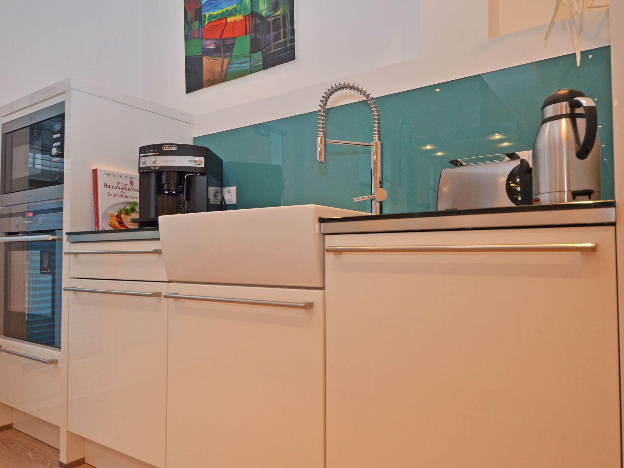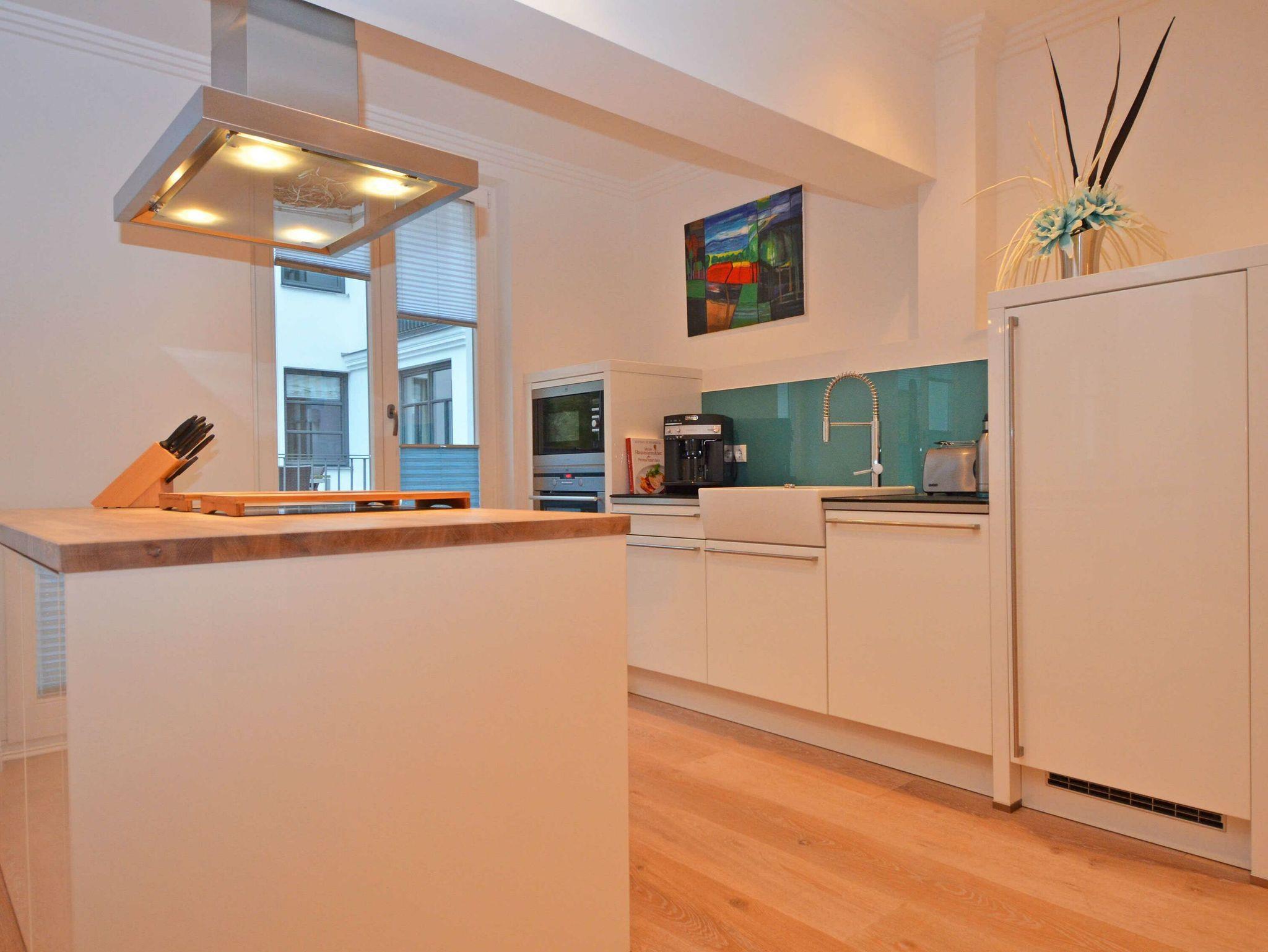 Der in den Wohnraum harmonisch integrierte Kochbereich überzeugt mit hochwertigsten Geräten. Der freistehende Kochblock mit Induktionsherd, Backofen, Mikrowelle, Geschirrspüler, Kühlschrank, Kaffeevollautomat für Kaffeespezialitäten, Toaster, Wasserkocher und diversem Kleininventar lässt das Herz jeden Hobbykochs höher schlagen.