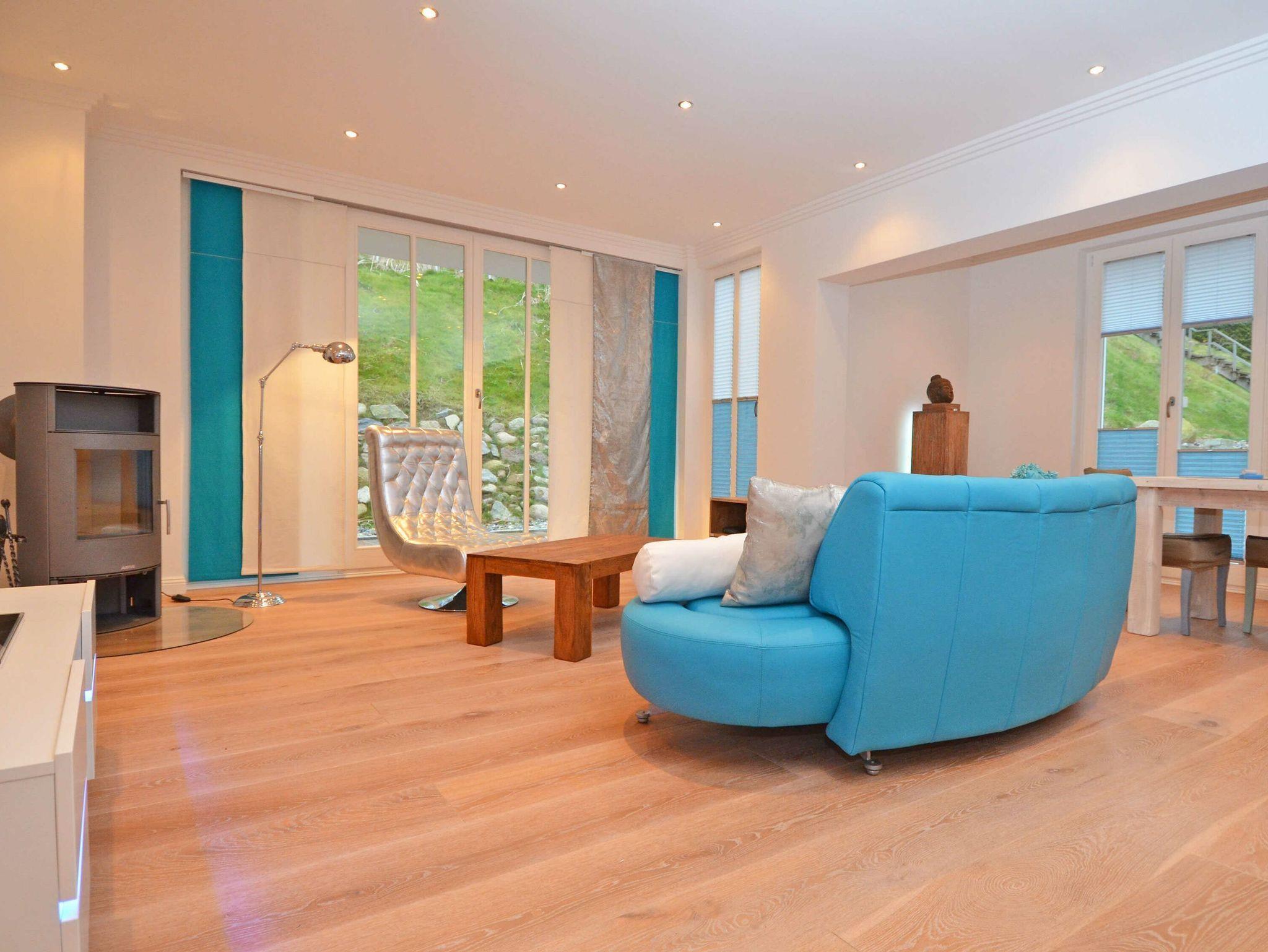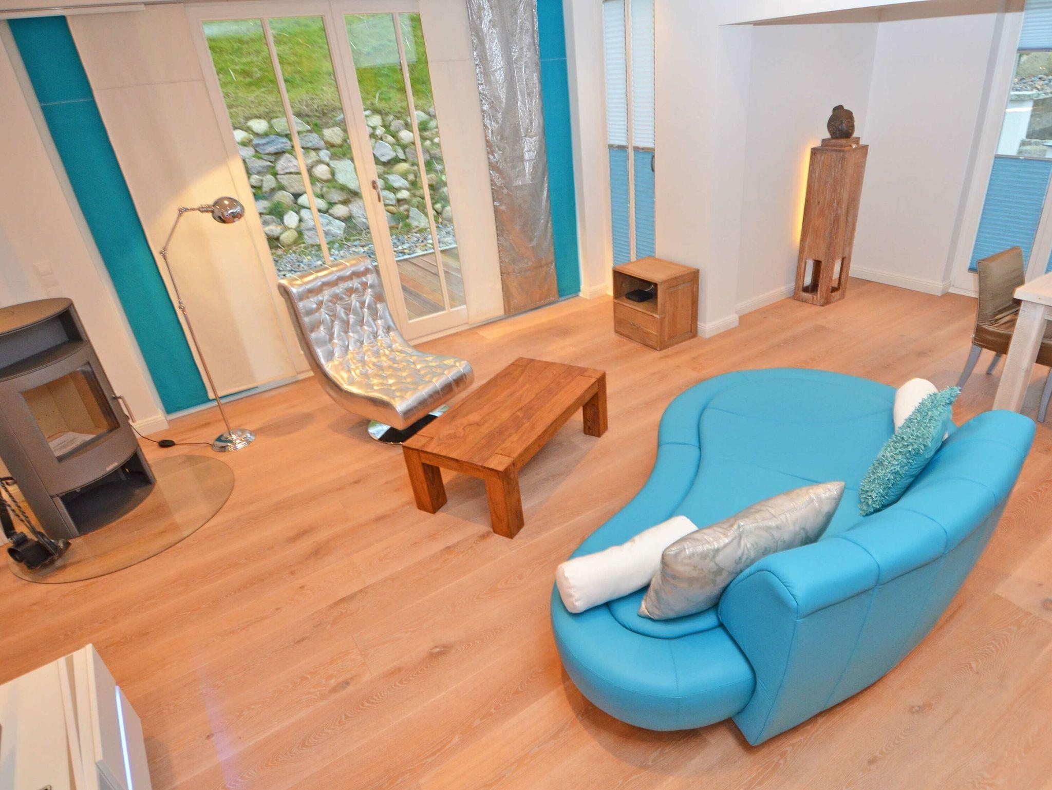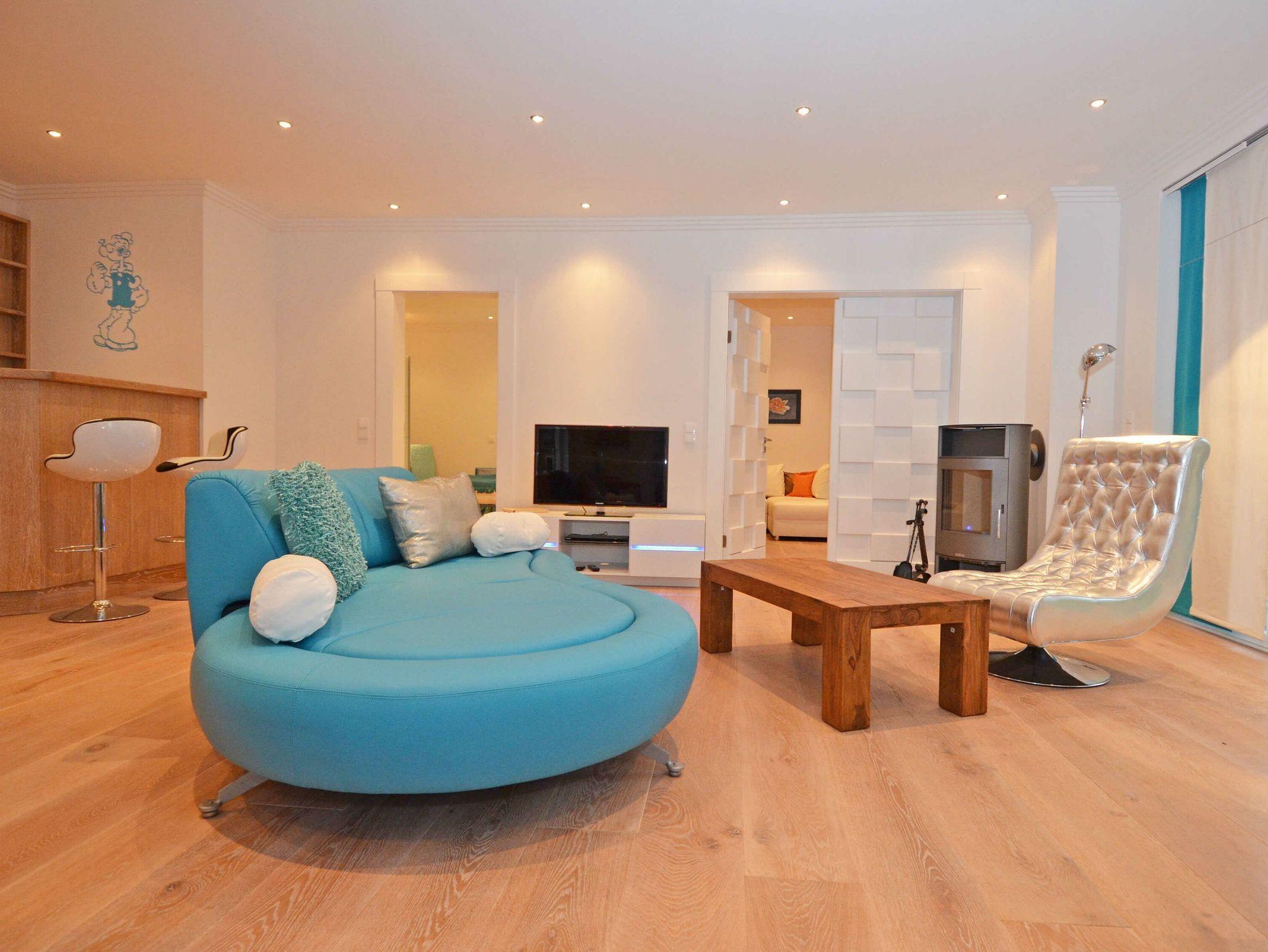 Der ausgedehnte Wohnbereich von ca. 65 m² mit Essbereich ermöglicht entspannte Stunden auf der kuscheligen freistehenden Ledercouch vor dem prasselndem Kaminfeuer oder auch anregende Gespräche an der gemütlichen Bar. Ein TV-Gerät mit DVD-Player und eine Musikanlage stehen natürlich ebenfalls zur Verfügung.