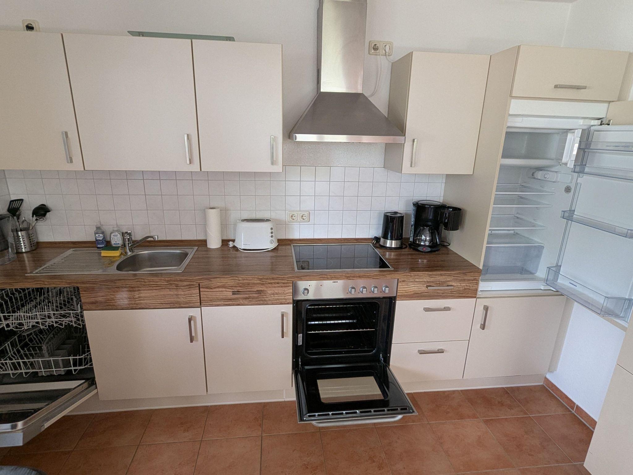 offene Küchenzeile mit Kühl- und Gefrierschrank, Cerankochfeld, Backofen, Geschirrspüler, Kaffeemaschine, Toaster, weitere alltägliche Küchenhelfer
