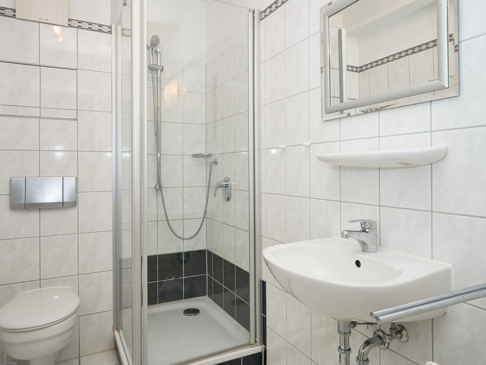 Die Wohnung verfügt über ein gemütliches Schlafzimmer und ein Badezimmer mit Dusche.