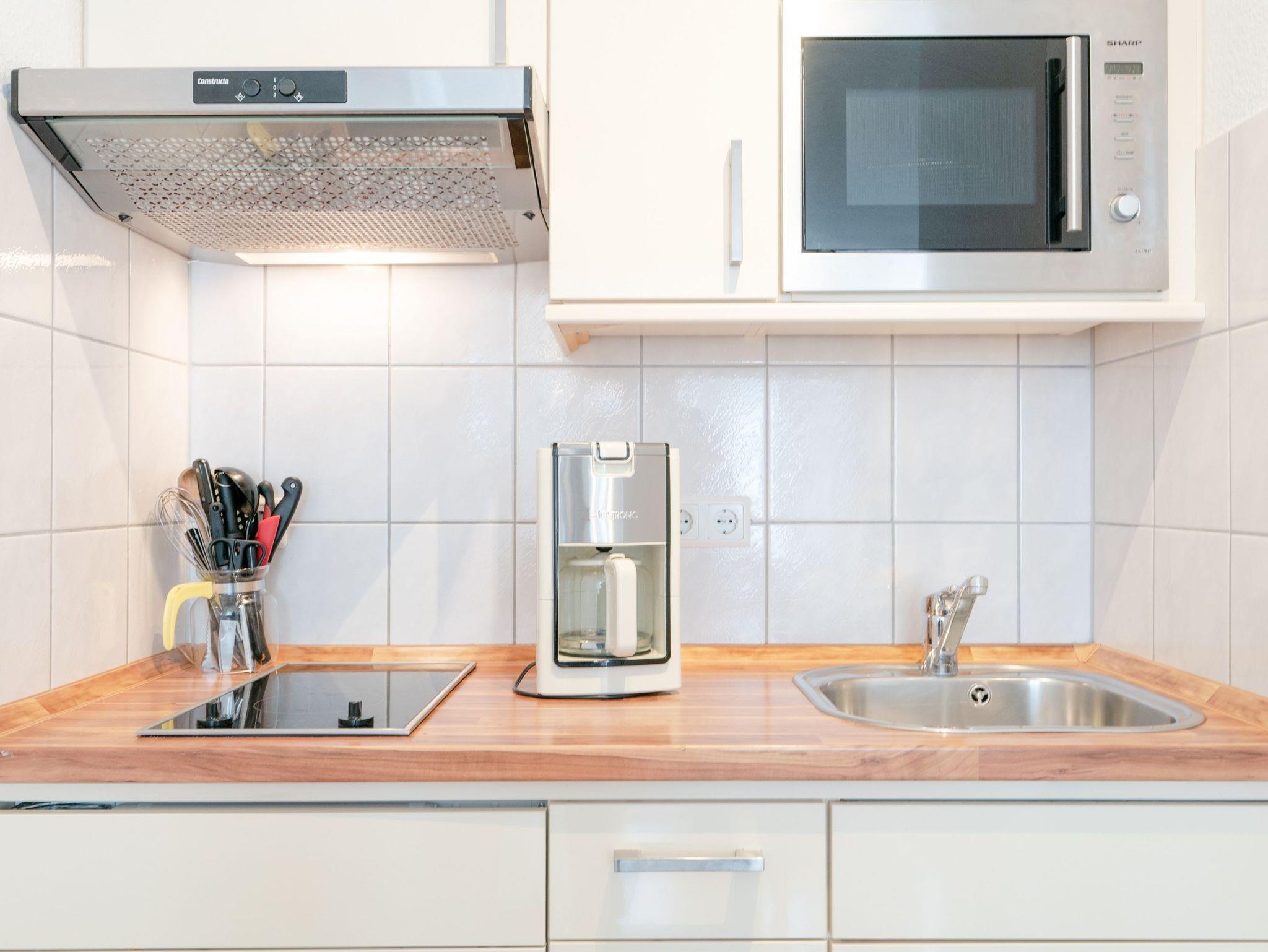 Die Ferienwohnung verfügt über kostenfreies WLAN und die Erstausstattung an Bettwäsche ist inklusive. Das Schlafzimmer mit Verdunklung verfügt über ein Doppelbett, im Wohnzimmer befindet sich zusätzlich eine Doppelschlafcouch. Darüber hinaus verfügt die Ferienwohnung über ein Bad mit Badewanne/WC und einen Föhn. Die voll ausgestattete, offene Küche mit Mikrowelle, Kaffeemaschine und Toaster lässt keine Wünsche offen. Ein Fernseher inkl. 3 Sky-Sender rundet die Einrichtung ab.
