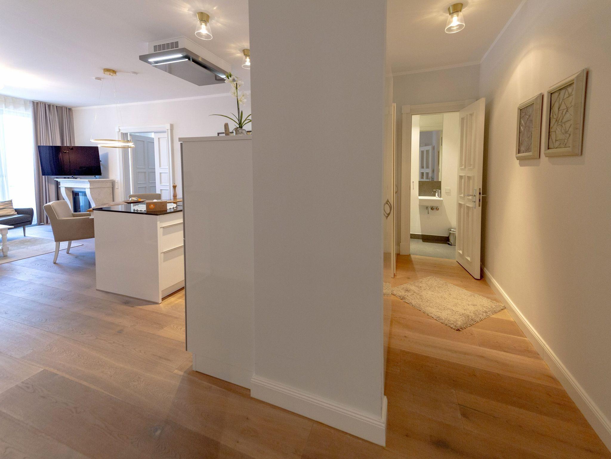 Das Meerblick-Appartement „Kleine Auszeit“ befindet sich im zweiten Obergeschoss des FIRST Sellin, ganz bequem mit dem Aufzug zu erreichen. Auf 90 qm Wohnfläche erwarten Sie purer Luxus, ein elegantes Ambiente und ein Höchstmaß an neuester Technik. Warme Farben, das wunderschöne Eichenparkett und die modernen Möbel sorgen dafür, dass Sie sich auf Anhieb wie zu Hause fühlen.