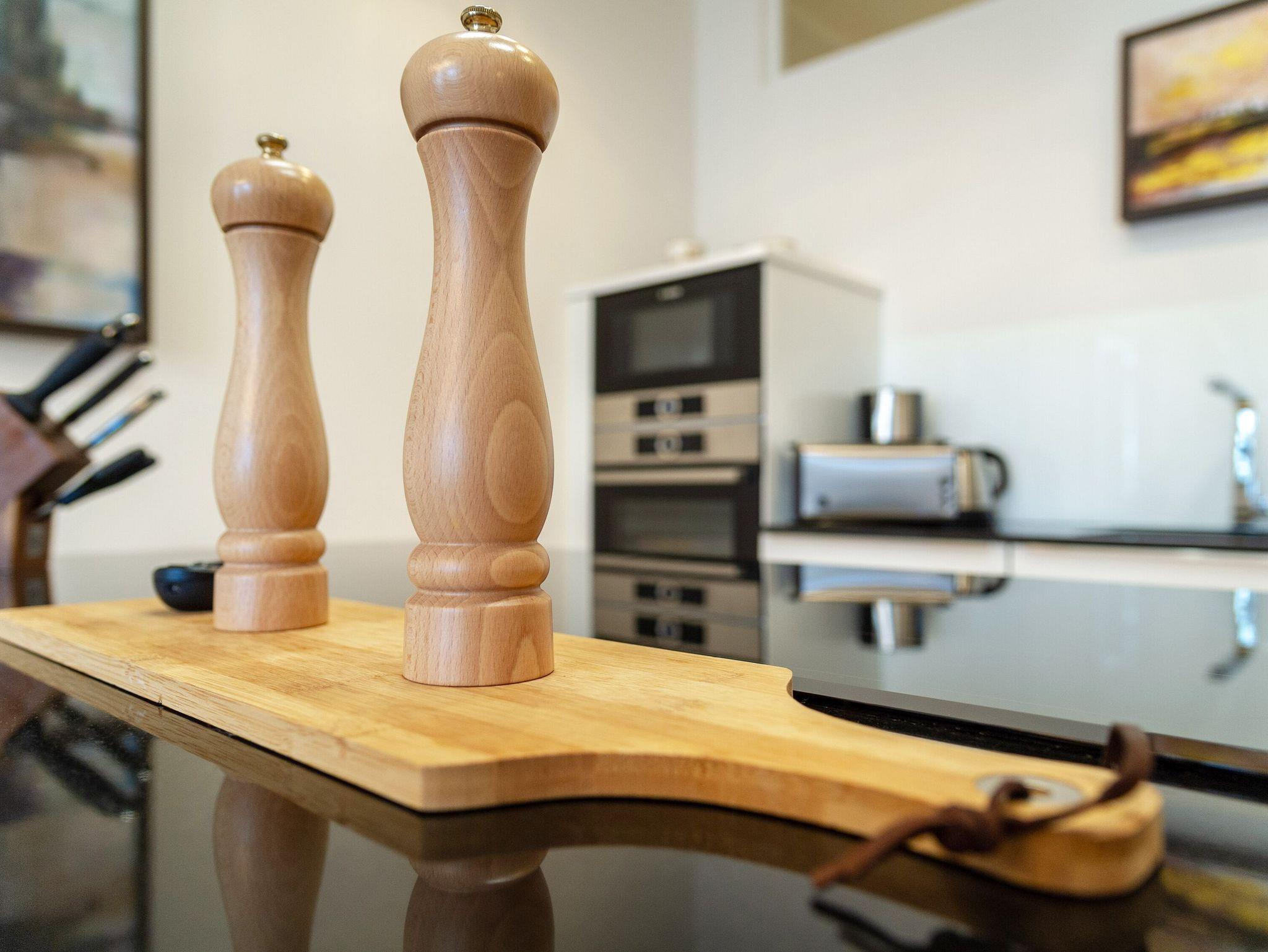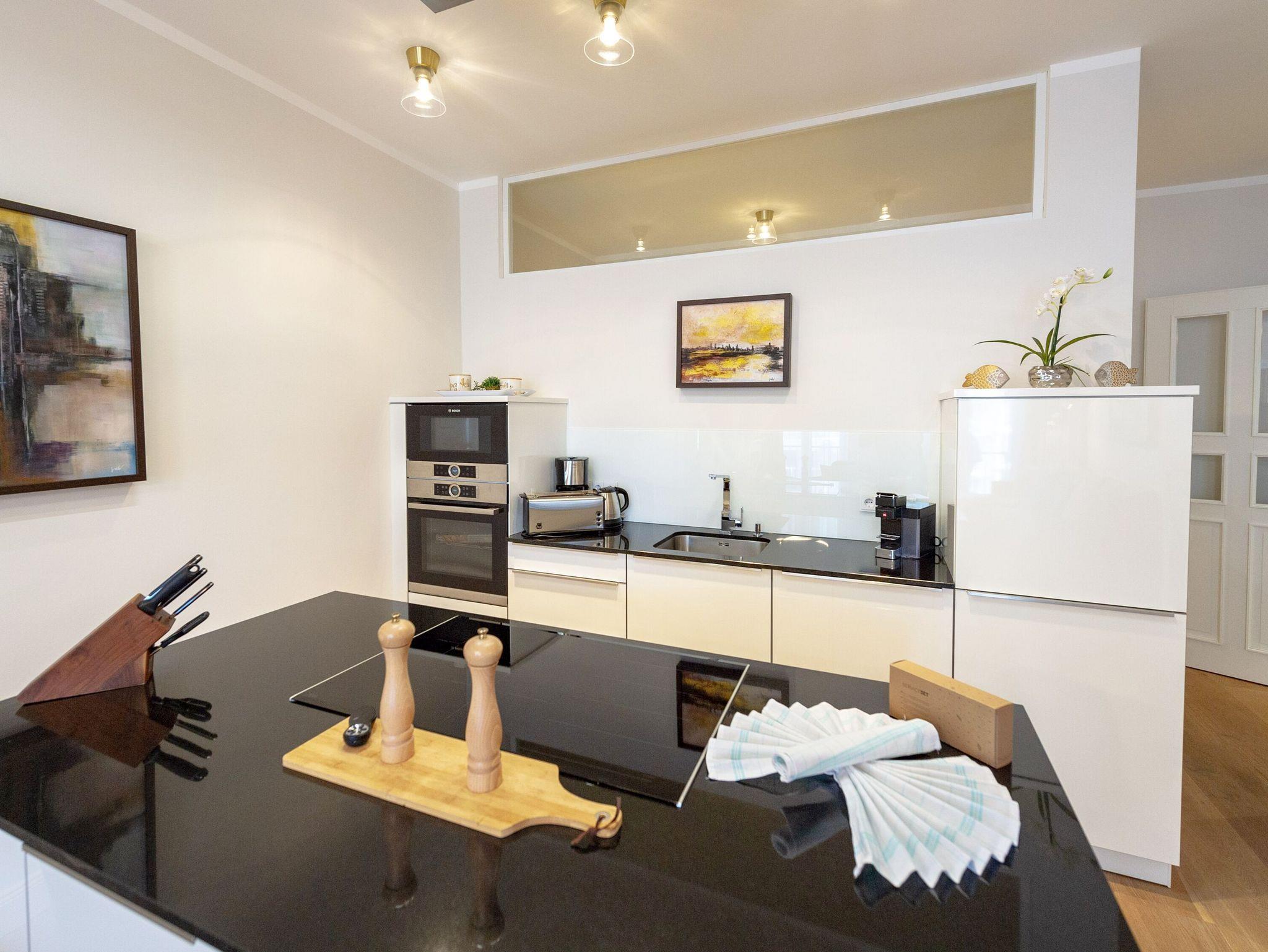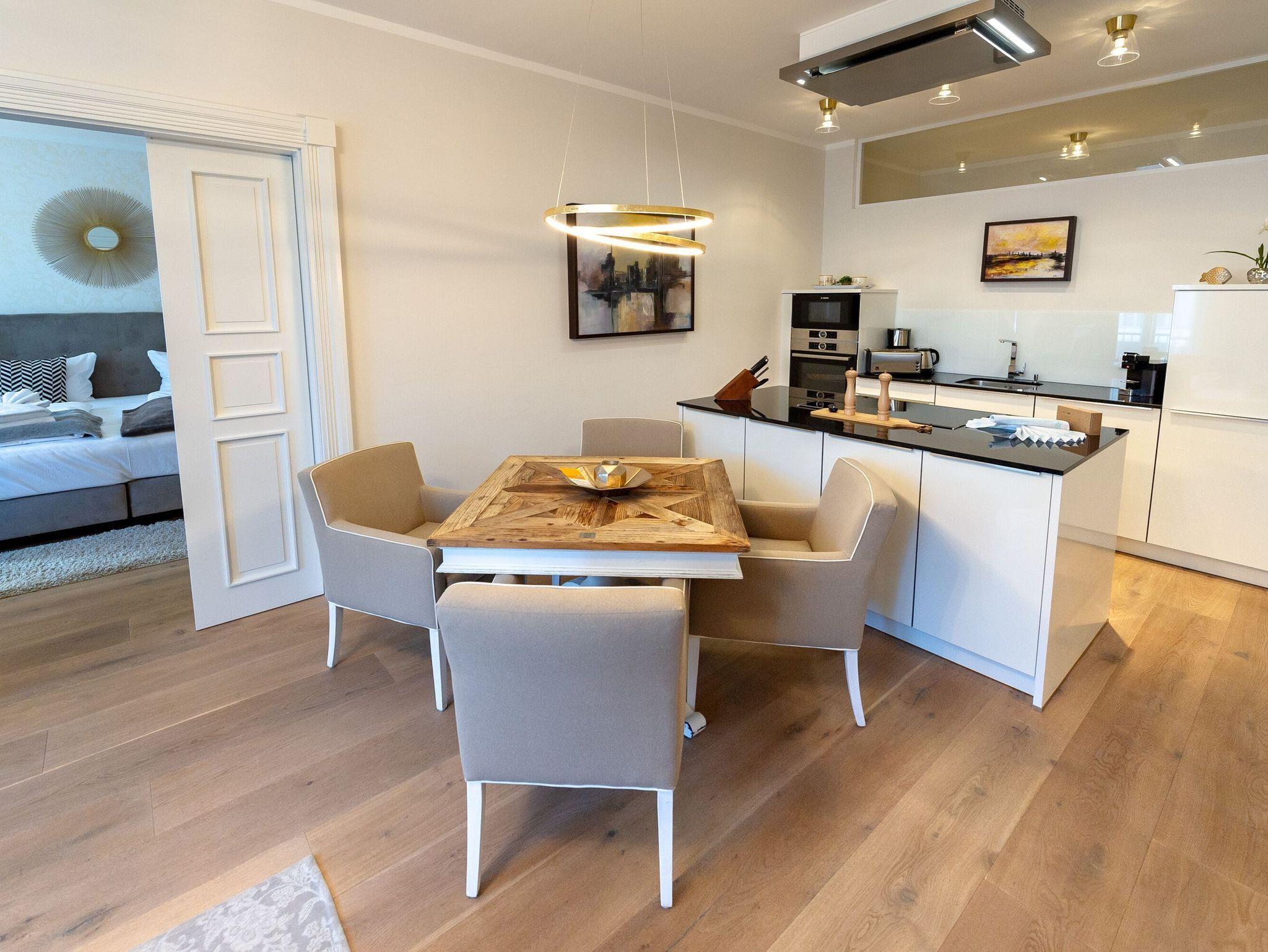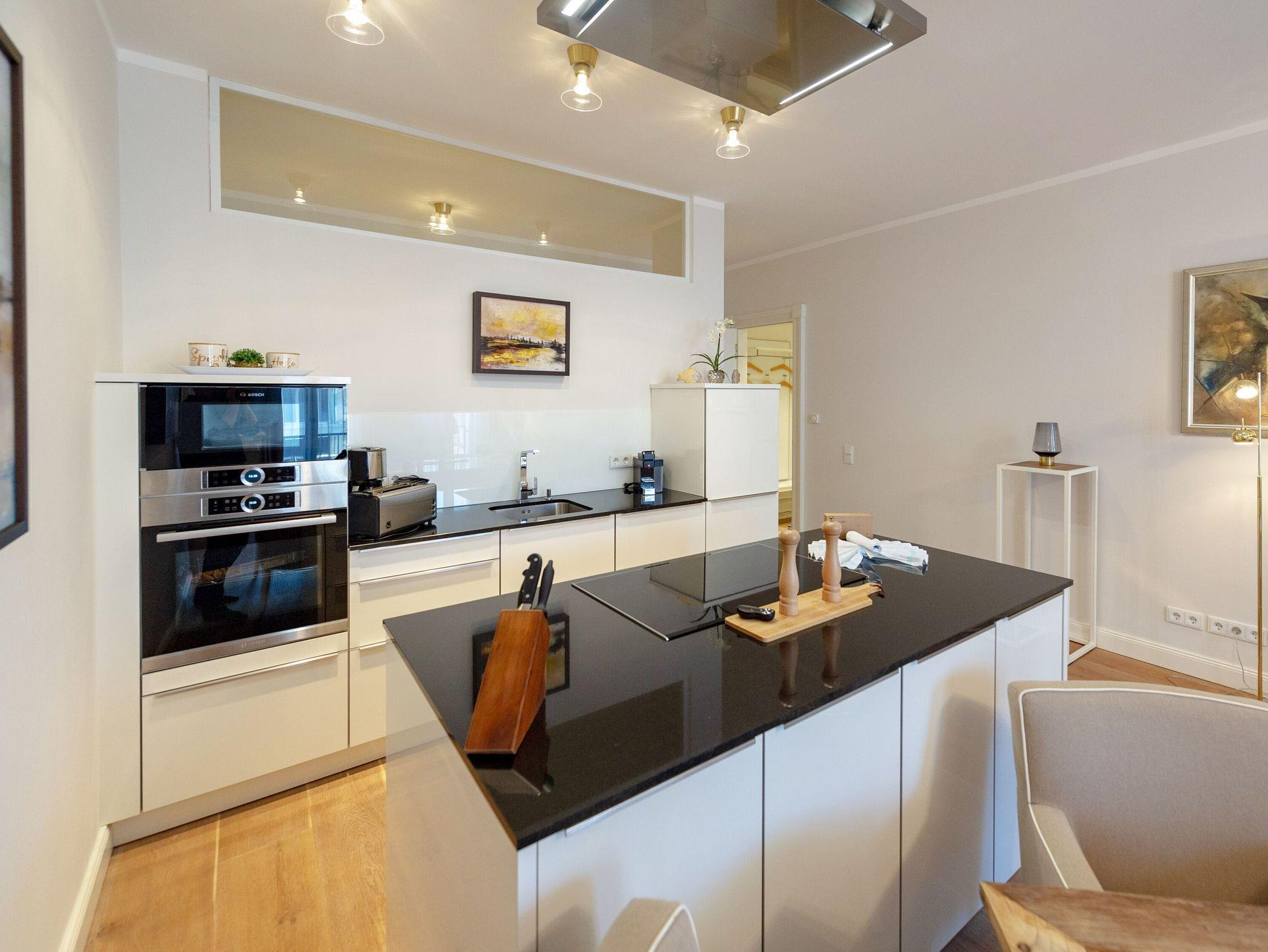 Die Küche sieht nicht nur äußerst elegant aus, sondern überzeugt natürlich auch mit ihrer Ausstattung. Dazu zählen u.a. ein Induktionsherd mit Backofen, ein geräumiger Kühlschrank mit Gefriermöglichkeit, eine Mikrowelle, eine Spülmaschine sowie Kaffeemaschine, Wasserkocher und Toaster. Wenn Sie also nicht unterwegs in einem der wirklich sehr empfehlenswerten Lokale der Insel Rügen einkehren, können Sie sich hier allerbestens selbst versorgen. Der nächste Bäcker für die frischen Frühstücksbrötchen ist nur zwei Gehminuten entfernt.