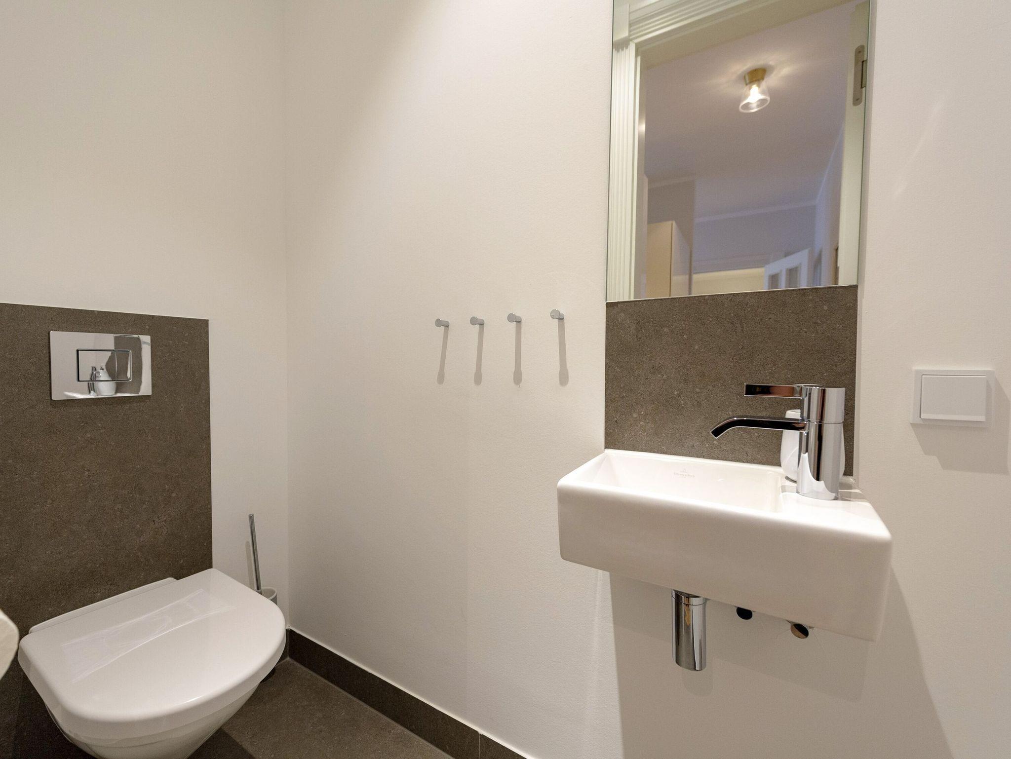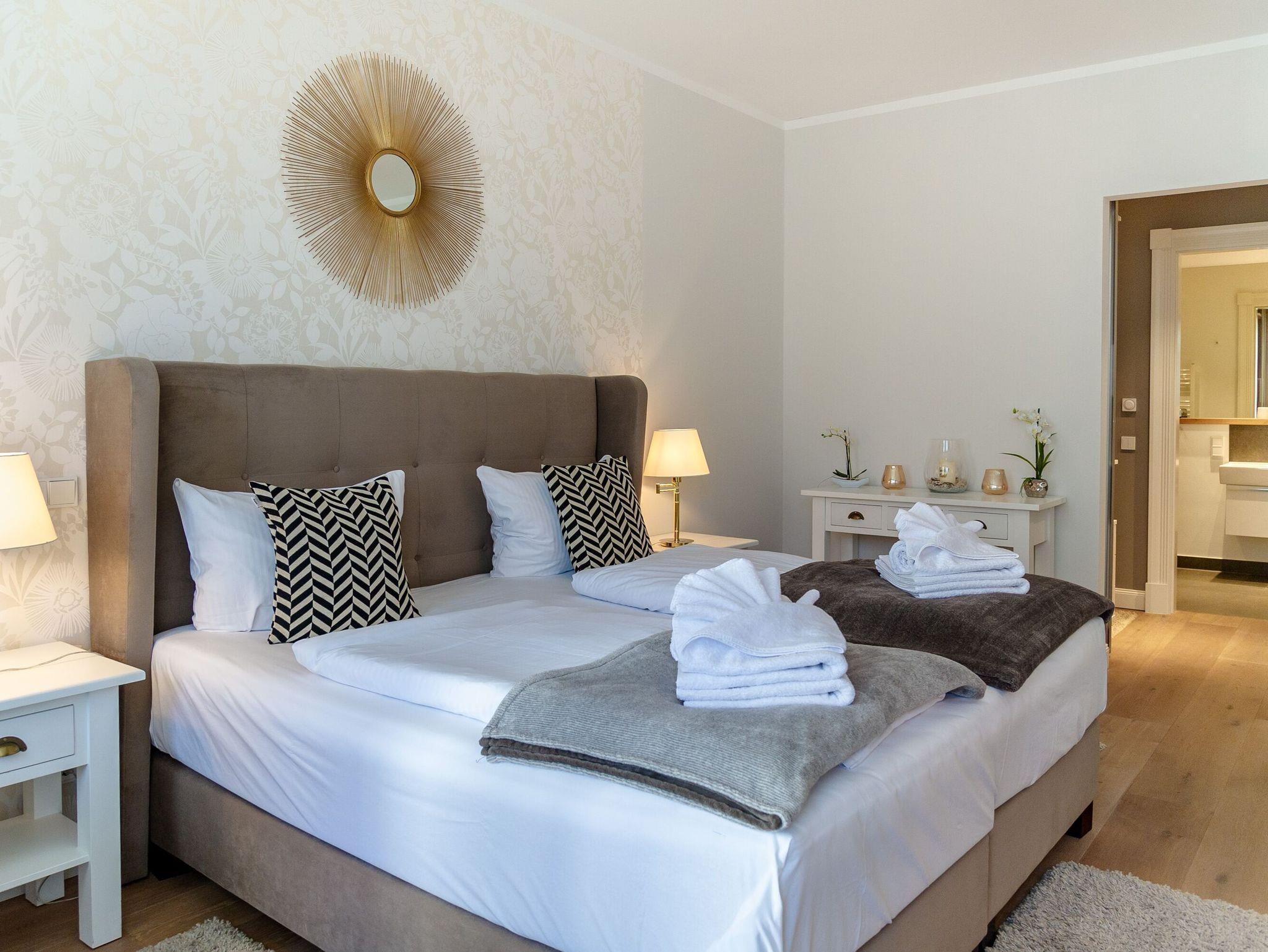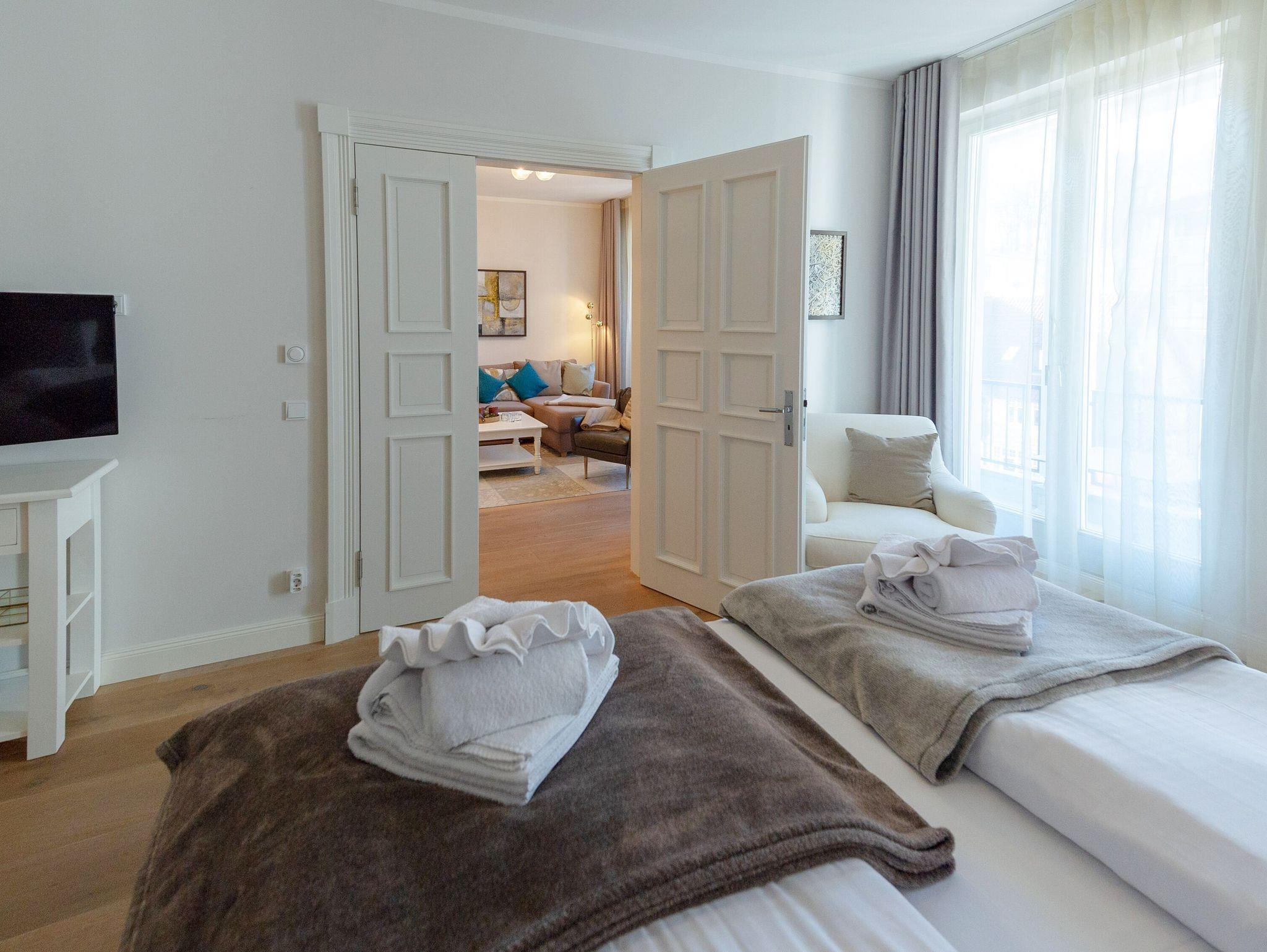 Im rund 22 qm großen Schlafzimmer verspricht ein 2,00 x 2,00 m großes Premium-Boxspringbett süße Träume. Dazu gibt es ein zweites Fernsehgerät. Das angrenzende Ankleidezimmer bietet jede Menge Platz und Stauraum für Ihre gesamte Urlaubsgarderobe. Von hier aus erreichen Sie das Badezimmer mit Dusche/WC, einem beleuchtetem Waschtisch sowie Handtuchheizkörper, Kosmetikspiegel und Fön. Darüber hinaus gibt es in der Wohnung auch noch ein Gäste-WC.