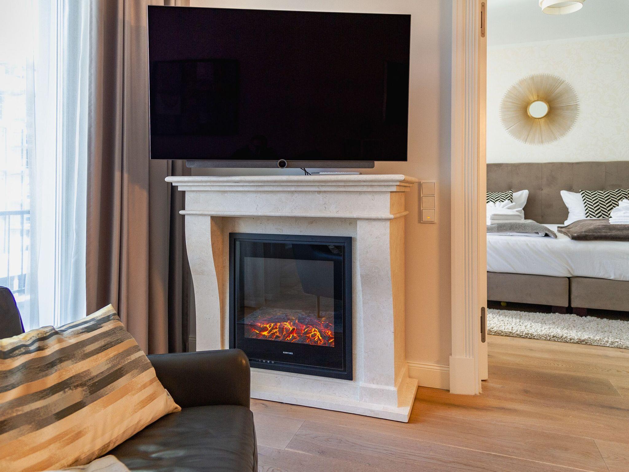 Der mit 43 qm überaus großzügige Wohn- und Essbereich ist mit einer hochwertigen, offenen Küche mit Kochinsel ausgestattet. Die schöne Essecke bietet ausreichend Platz für vier Personen. Das große Wohlfühlsofa lässt sich mit ein paar Handgriffen in ein vollwertiges 1,60 m breites Bett verwandeln. Lassen Sie sich verwöhnen von dem elektrischen Kamin mit Heizfunktion und erleben Sie unterhaltsame Abende auf dem 55 Zoll großen LOEWE-TV mit Internet-Funktion. W-LAN steht Ihnen natürlich kostenfrei zur Verfügung.