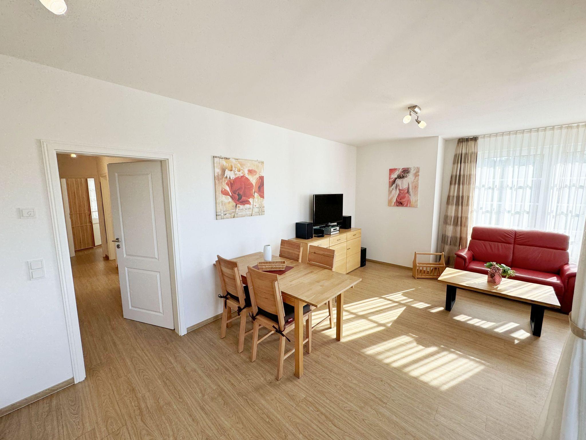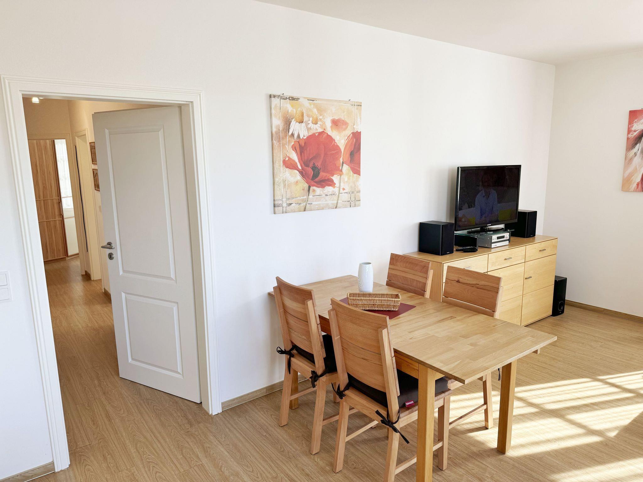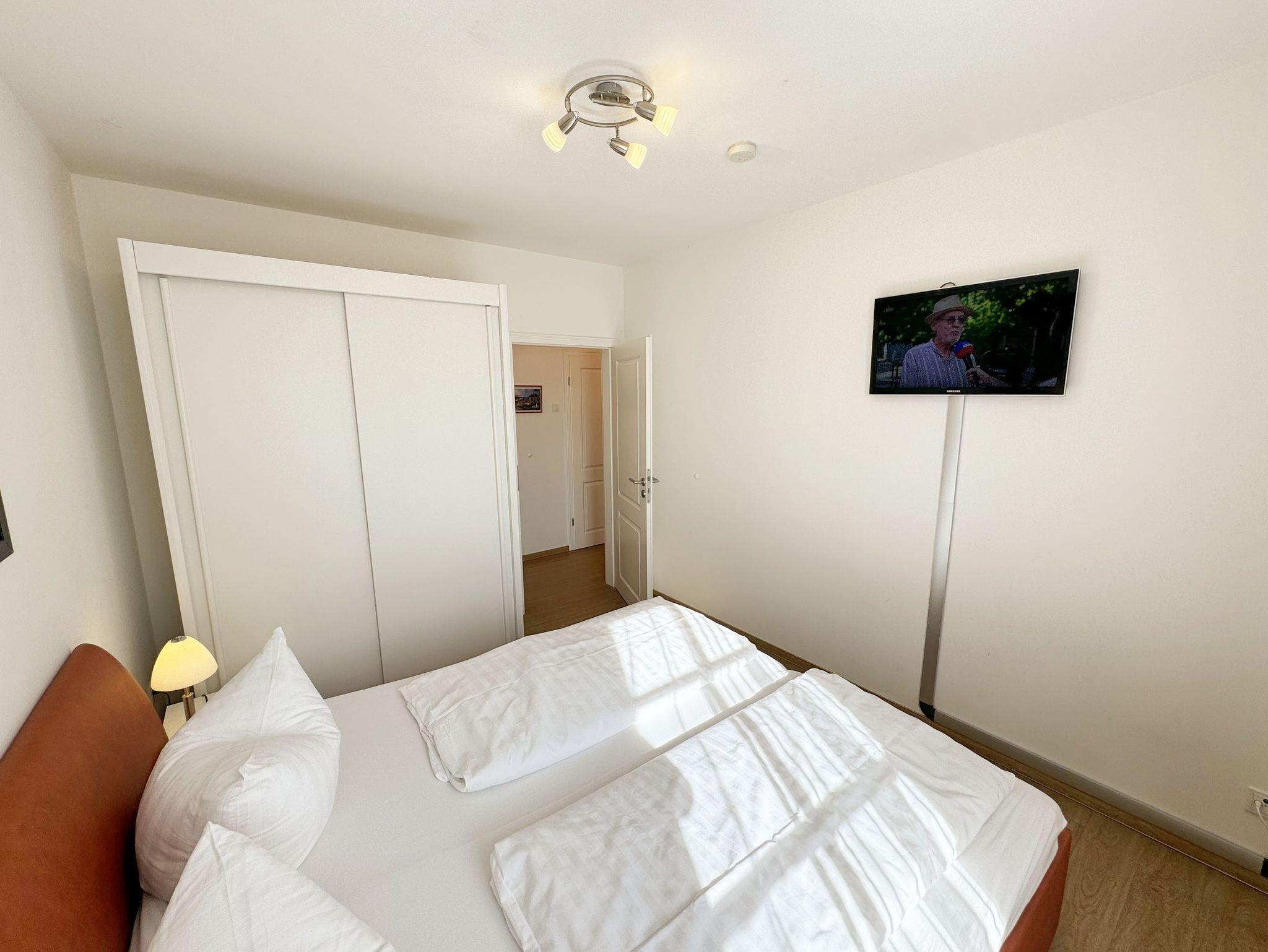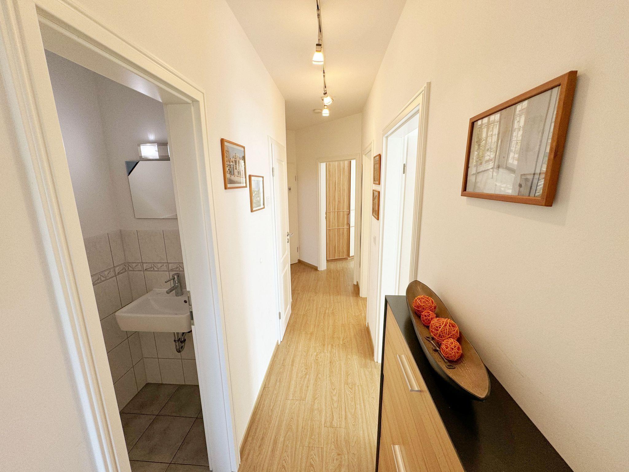 Die gemütlich eingerichtete 3-Raumwohnung Nr. 06 (Nichtraucherwohnung) in der Villa Annika befindet sich in der 1. Etage. Mit Ihren ca. 66 qm bietet Sie Ihnen ausreichend Platz für max. 2 bis 4 Personen. Vom Flurbereich erreichen Sie alle Räumlichkeiten. Der Wohnbereich ist mit einem 2 x 2-Sitzer Couch, einer Leselampe, einem Sideboard mit LCD-TV, WLAN-Zugang, einem DAB-Radio und einer Küchenzeile ausgestattet. Die Küchenzeile ist komplett ausgestattet und beinhaltet ein Cerankochfeld, einen Backofen, einen Geschirrspüler, eine Mikrowelle, einen Kühlschrank mit Gefrierfach, einer Kaffeemaschine, einem Toaster, einem Wasserkocher sowie diversen Küchenutensilien. Angrenzend befindet sich der Essplatz. Vom Wohnbereich gelangen Sie auf Ihren bestuhlten Balkon (Süd/West). Das Tageslicht-Bad verfügt über eine Dusche mit flachem Einstieg, ein WC, einen Waschplatz, Ablageregal, einem Handtuchtrockner, einem beleuchteten Kosmetikspiegel, Insektenschutzgitter und einem Fön. Ein Gäste-WC mit Waschbecken rundet den Sanitärbereich ab. Die beiden Schlafzimmer bestehen jeweils aus einem Doppelbett (2 x 0,90m x 2,00m), verstellbaren Lattenrosten, Nachttischablagen und Beleuchtung, einer Kleiderablage, einem Kleiderschrank sowie Insektenschutzgitter. Eines der Schlafzimmer verfügt zusätzlich über einen TV. In allen Räumen sorgt eine Fußbodenheizung für angenehme Wärme. Im kleinen Abstellraum befinden sich Reinigungsutensilien, ein Wäscheständer mit Wäscheklammern sowie ein Staubsauger. Ein eigener PKW-Stellplatz (Nr.06) ist für Sie in der hauseigenen Tiefgarage (Einfahrtshöhe 1,90m) vorhanden, sowie eine Fahrradabstellmöglichkeit auf dem Grundstück. 1 gut erzogenes Haustier ist gegen eine Gebühr in der Wohnung ein gern gesehener Gast. Die Erstausstattung eines Wäschepaketes (komplette Bettwäsche, 1 Duschhandtuch, 1 kleines Handtuch) können Sie bis 14 Tage vor Anreise gegen einen Aufpreis dazu buchen oder durch eigene ergänzen. Ab 2 gebuchten Paketen erhalten Sie einmalig 1 Geschirrhandtuch und 1 Duschvorleger hinzu.