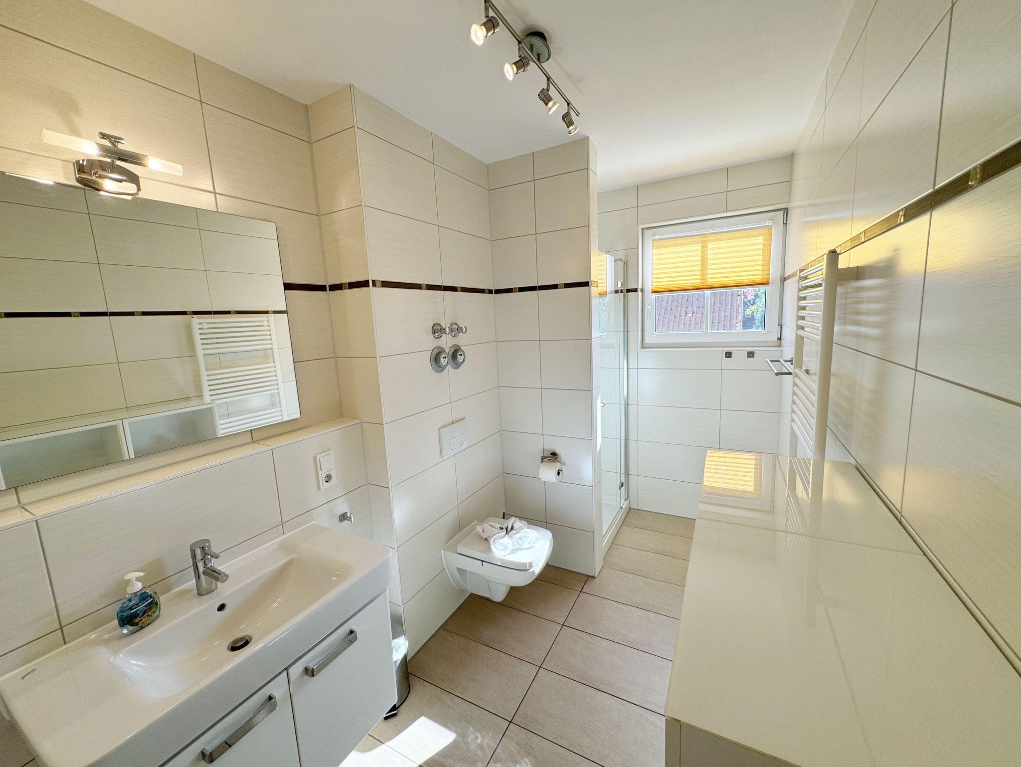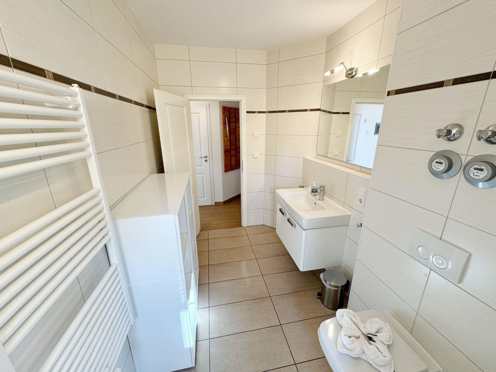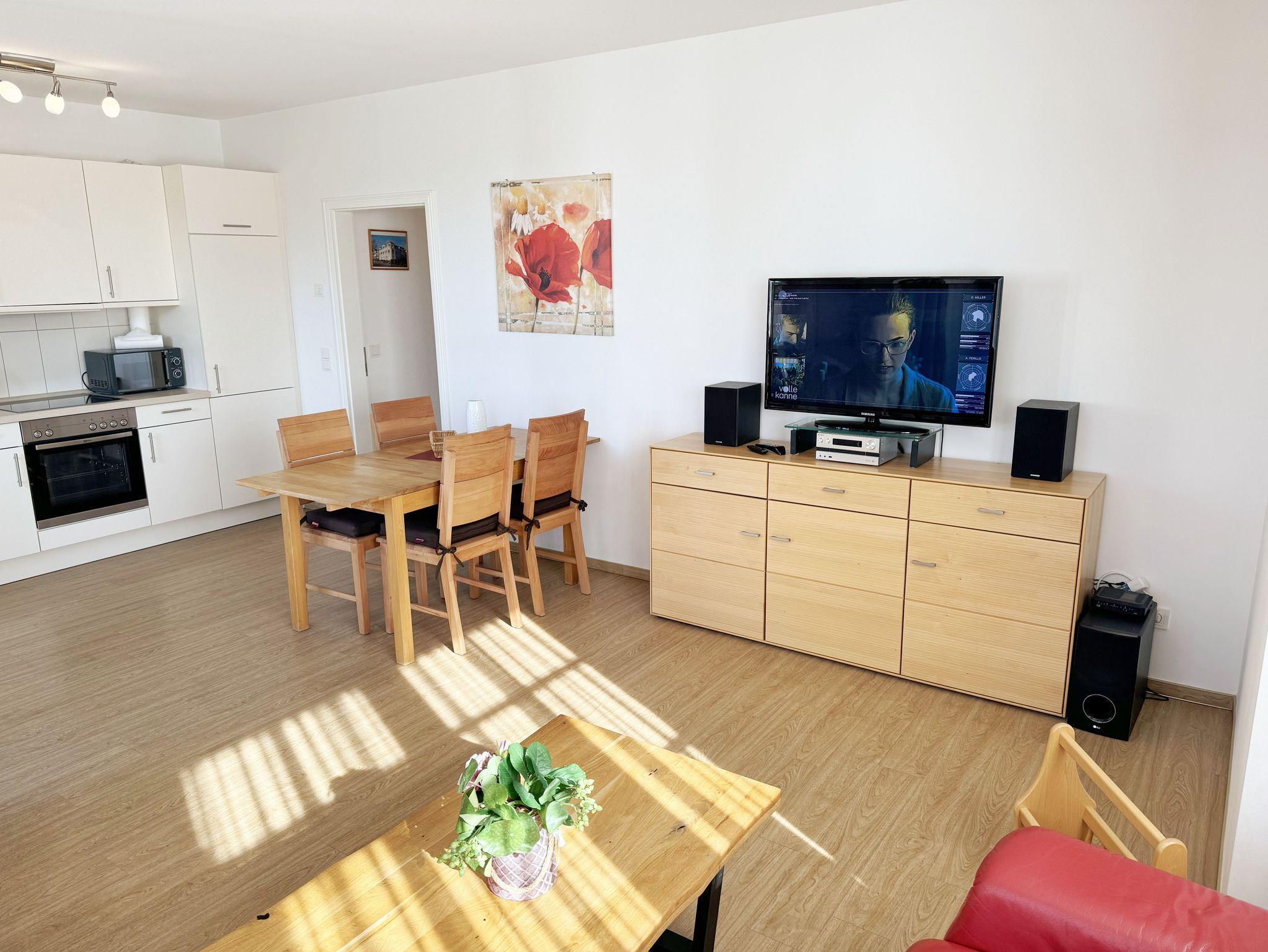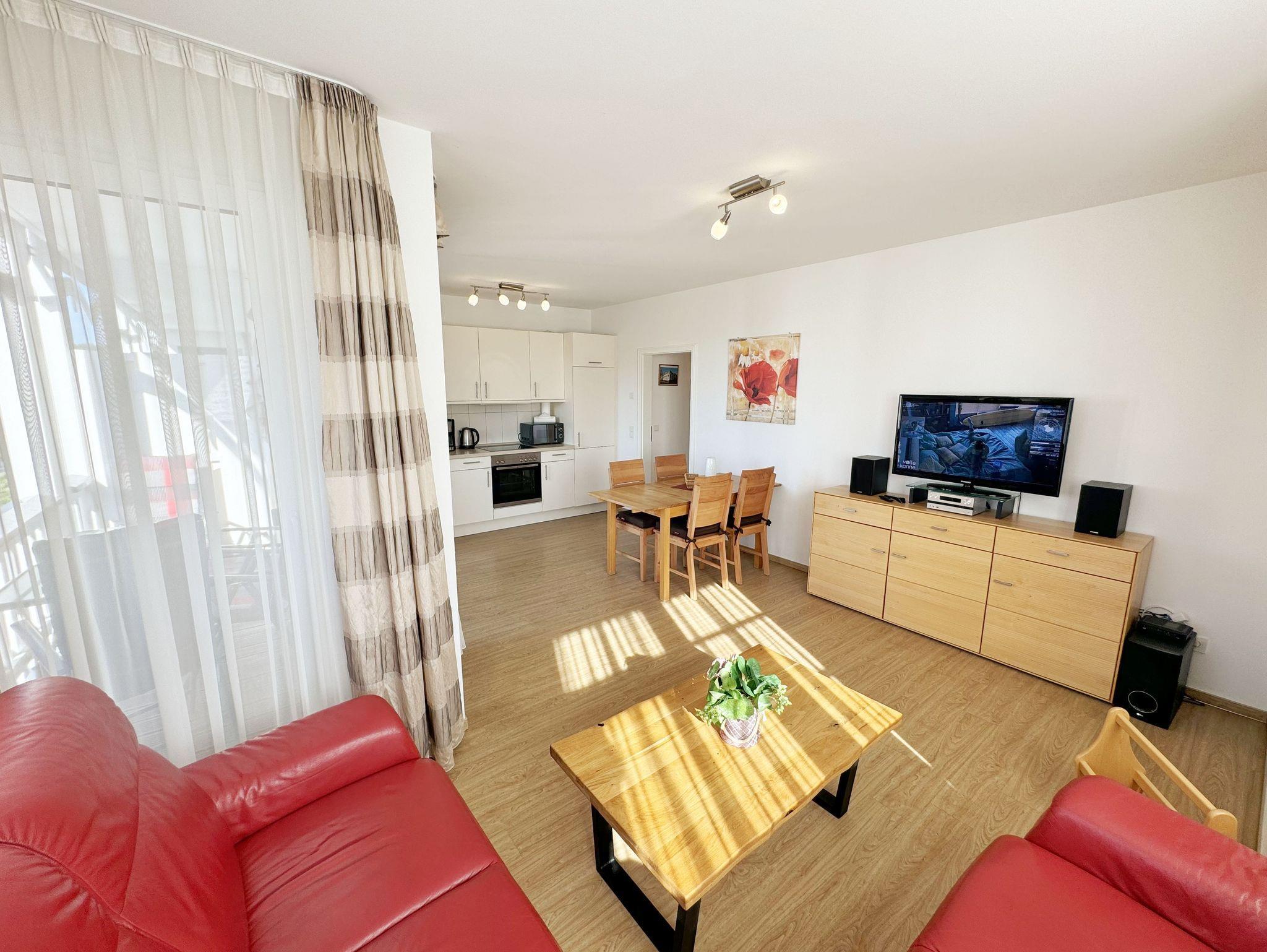Die gemütlich eingerichtete 3-Raumwohnung Nr. 06 (Nichtraucherwohnung) in der Villa Annika befindet sich in der 1. Etage. Mit Ihren ca. 66 qm bietet Sie Ihnen ausreichend Platz für max. 2 bis 4 Personen. Vom Flurbereich erreichen Sie alle Räumlichkeiten. Der Wohnbereich ist mit einem 2 x 2-Sitzer Couch, einer Leselampe, einem Sideboard mit LCD-TV, WLAN-Zugang, einem DAB-Radio und einer Küchenzeile ausgestattet. Die Küchenzeile ist komplett ausgestattet und beinhaltet ein Cerankochfeld, einen Backofen, einen Geschirrspüler, eine Mikrowelle, einen Kühlschrank mit Gefrierfach, einer Kaffeemaschine, einem Toaster, einem Wasserkocher sowie diversen Küchenutensilien. Angrenzend befindet sich der Essplatz. Vom Wohnbereich gelangen Sie auf Ihren bestuhlten Balkon (Süd/West). Das Tageslicht-Bad verfügt über eine Dusche mit flachem Einstieg, ein WC, einen Waschplatz, Ablageregal, einem Handtuchtrockner, einem beleuchteten Kosmetikspiegel, Insektenschutzgitter und einem Fön. Ein Gäste-WC mit Waschbecken rundet den Sanitärbereich ab. Die beiden Schlafzimmer bestehen jeweils aus einem Doppelbett (2 x 0,90m x 2,00m), verstellbaren Lattenrosten, Nachttischablagen und Beleuchtung, einer Kleiderablage, einem Kleiderschrank sowie Insektenschutzgitter. Eines der Schlafzimmer verfügt zusätzlich über einen TV. In allen Räumen sorgt eine Fußbodenheizung für angenehme Wärme. Im kleinen Abstellraum befinden sich Reinigungsutensilien, ein Wäscheständer mit Wäscheklammern sowie ein Staubsauger. Ein eigener PKW-Stellplatz (Nr.06) ist für Sie in der hauseigenen Tiefgarage (Einfahrtshöhe 1,90m) vorhanden, sowie eine Fahrradabstellmöglichkeit auf dem Grundstück. 1 gut erzogenes Haustier ist gegen eine Gebühr in der Wohnung ein gern gesehener Gast. Die Erstausstattung eines Wäschepaketes (komplette Bettwäsche, 1 Duschhandtuch, 1 kleines Handtuch) können Sie bis 14 Tage vor Anreise gegen einen Aufpreis dazu buchen oder durch eigene ergänzen. Ab 2 gebuchten Paketen erhalten Sie einmalig 1 Geschirrhandtuch und 1 Duschvorleger hinzu.