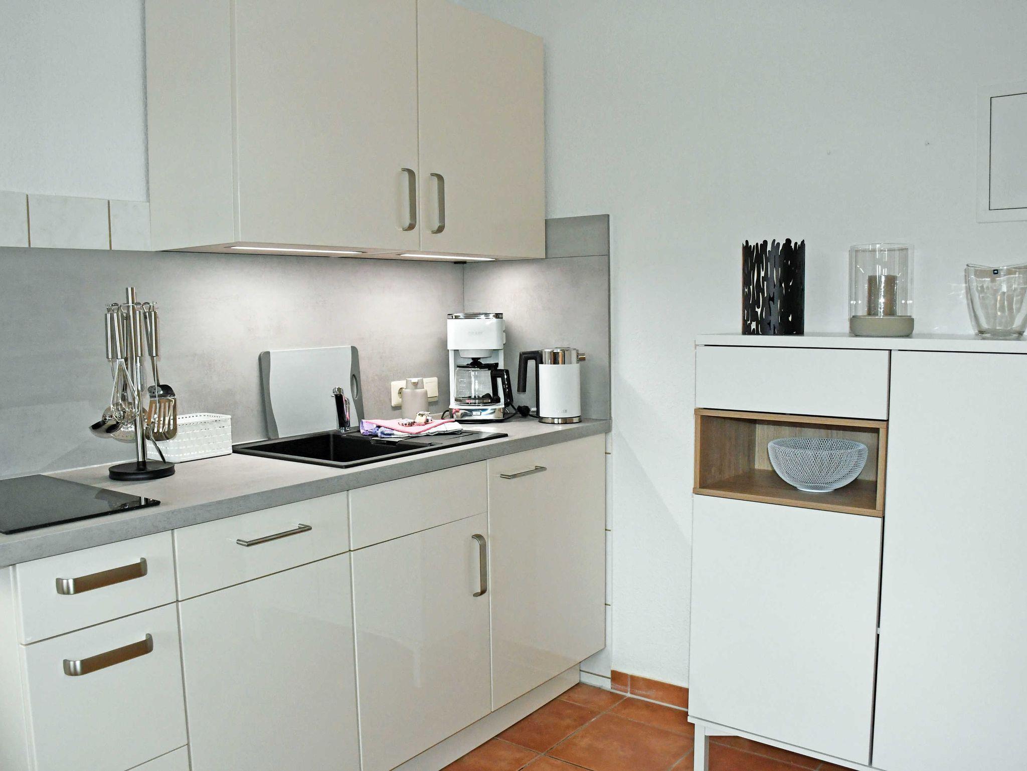 Im kombinierten Wohn-/Schlafraum befinden sich ein bequemes Doppelbett mit Nachttischen und Leselampen sowie einem Kleiderschrank, ein Tisch mit zwei Sesseln und ein modernes Flachbild-TV-Gerät. Die kleine Küchenzeile ist mit Elektroherd mit Ceranfeld, Kühlschrank, Kaffeemaschine, Wasserkocher, Toaster komplett ausgestattet.