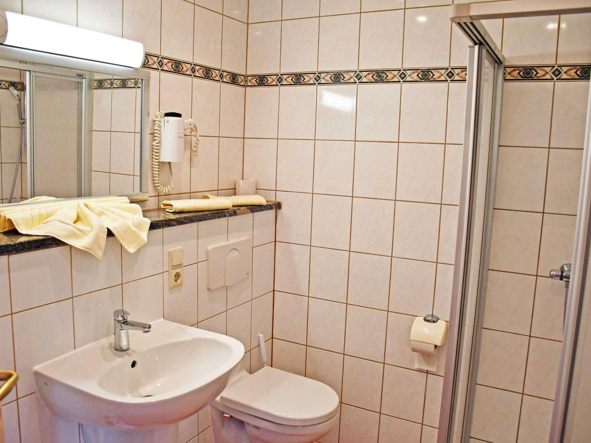 Das Bad ist mit Dusche, WC und Waschtisch ausgestattet.