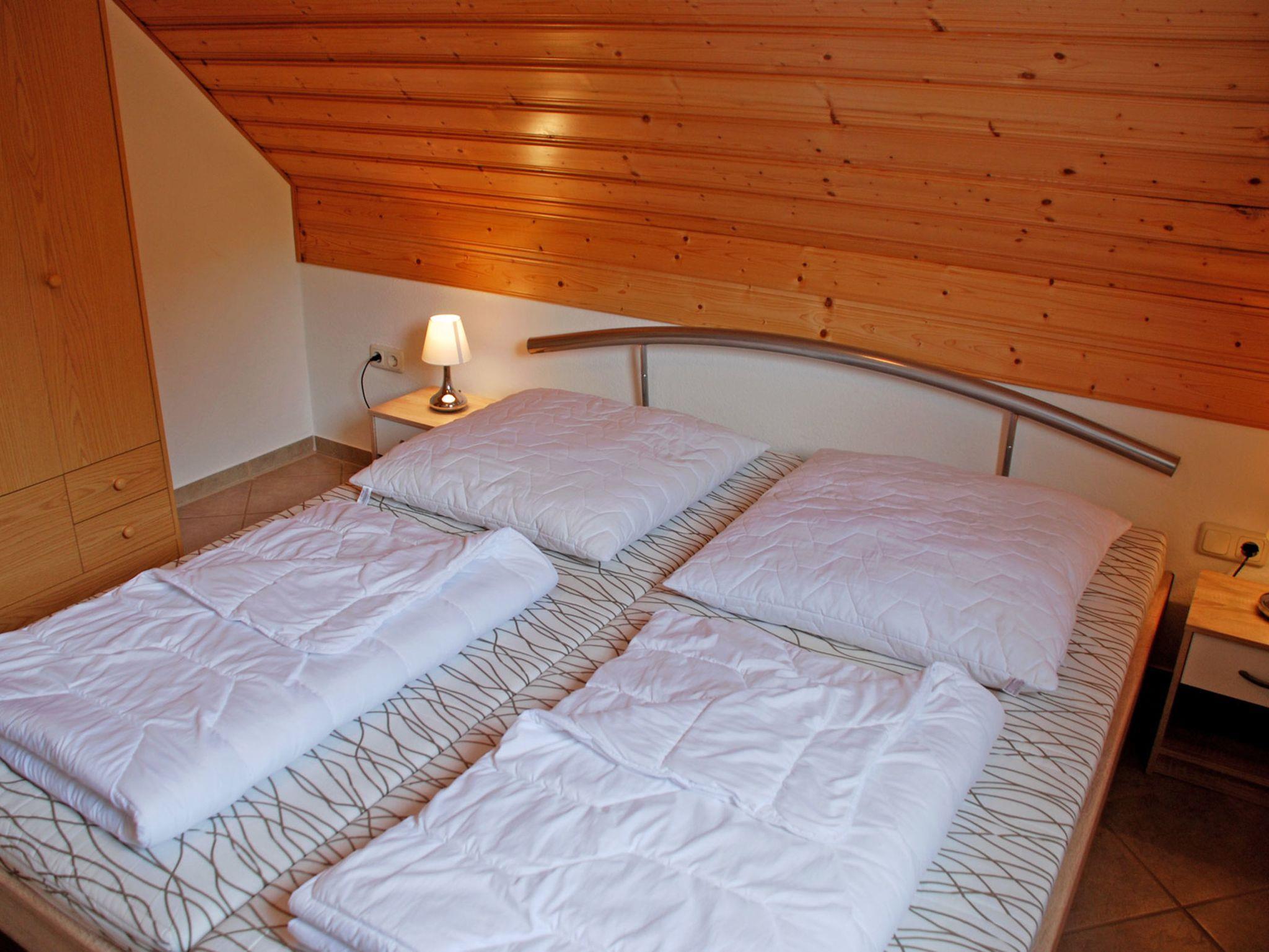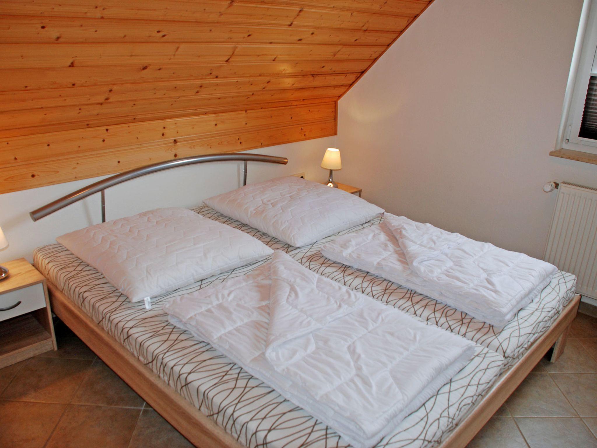 Diese modern eingerichtete Ferienwohnung liegt im Obergeschoss und bietet auf 42 qm Platz für max. 4 Gäste und hat Internet WLAN. Über den separaten Eingang in Hausflur gelangen Sie in den Flur mit Garderobe und Kleiderschrank. Im gemütlichen Wohnzimmer stehen eine Polstersitzgruppe mit Tisch und Sesseln und ein Schrank mit TV - Gerät. Hier steht auch ein Esstisch mit Stühlen. Im ersten Schlafzimmer stehen ein bequemes Doppelbett (durchgehende Matratze) mit Nachttischen und Leselampen sowie ein Kleiderschrank. Über eine Holztreppe im Wohnbereich gelangt man in den ausgebauten Dachboden, hier stehen zwei Einzelbetten mit Leselampen und zwei kleine Schränke.