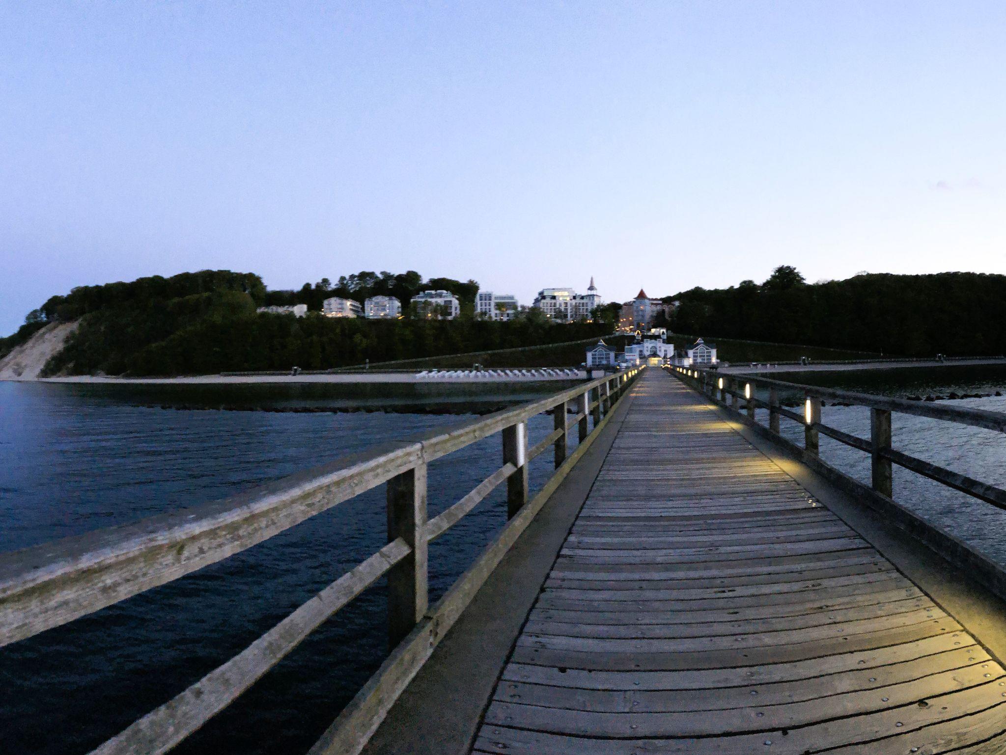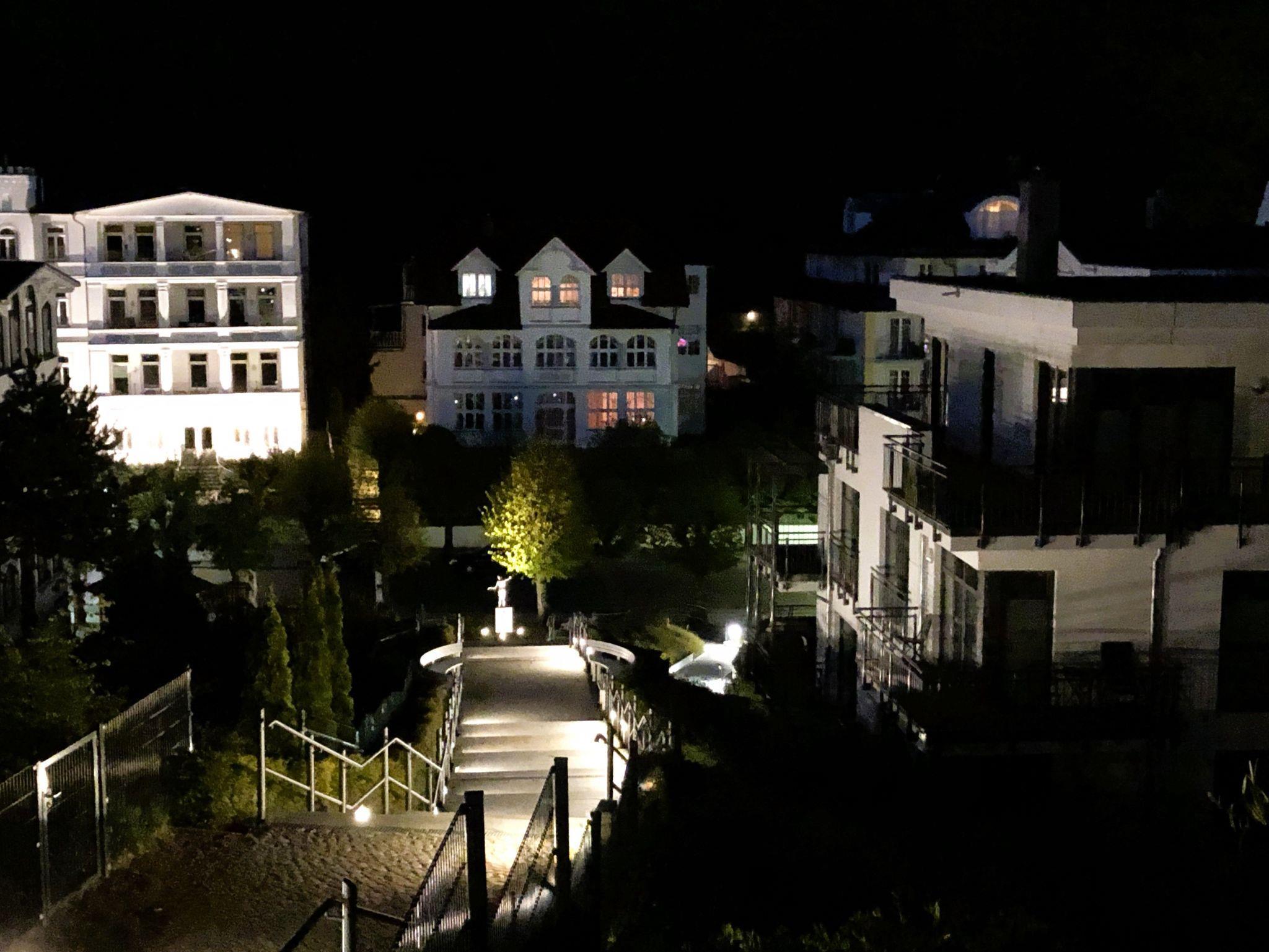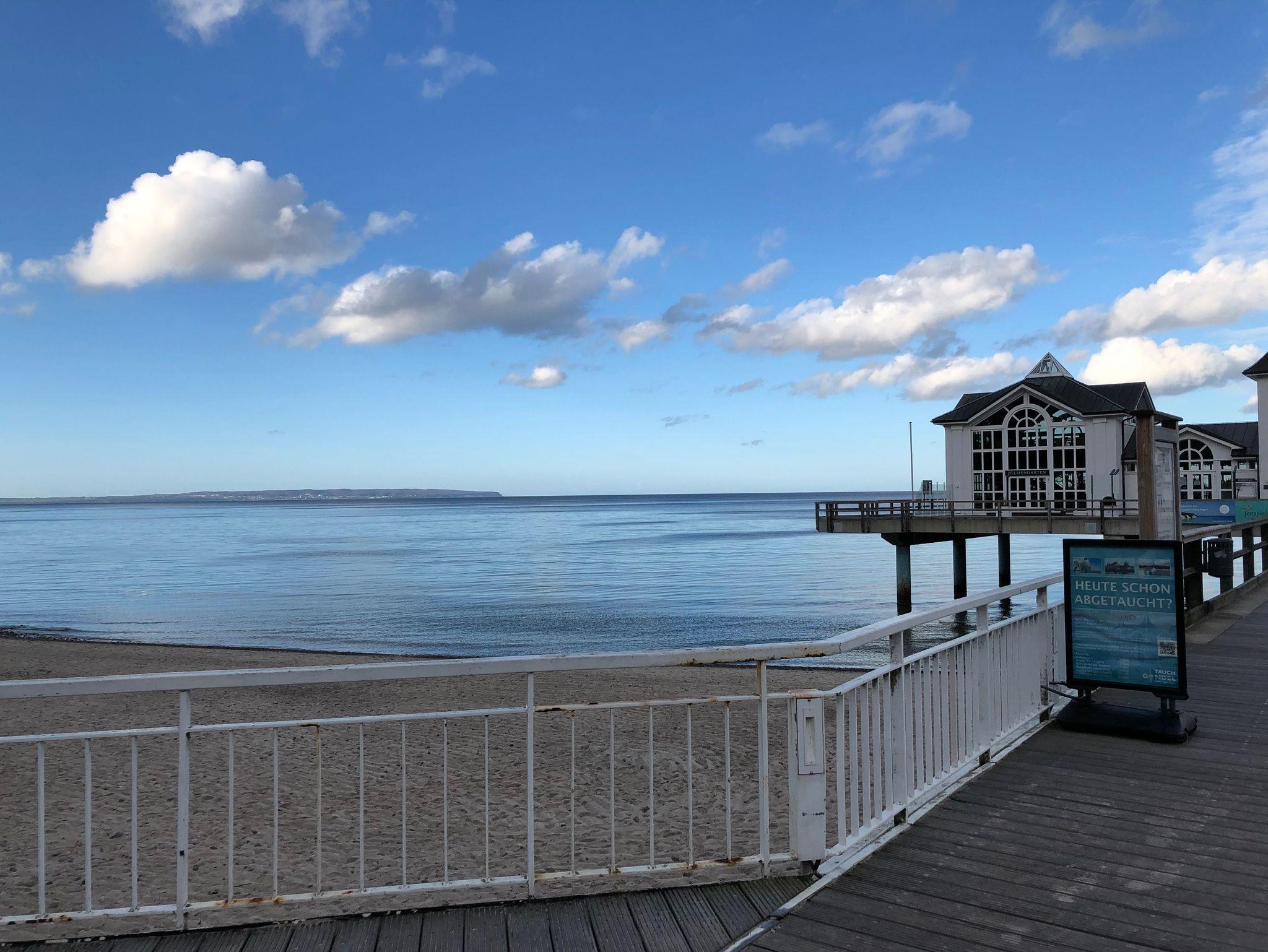Direkt unterhalb der Ferienwohnung verläuft die Seeparkpromenade, die in nordwestlicher Richtung Meer in die Wilhelmstraße, dem Ortszentrum von Sellin, mündet. Endpunkt der Wilhelmstraße bilden das Hochufer und die bekannte Seebrücke.