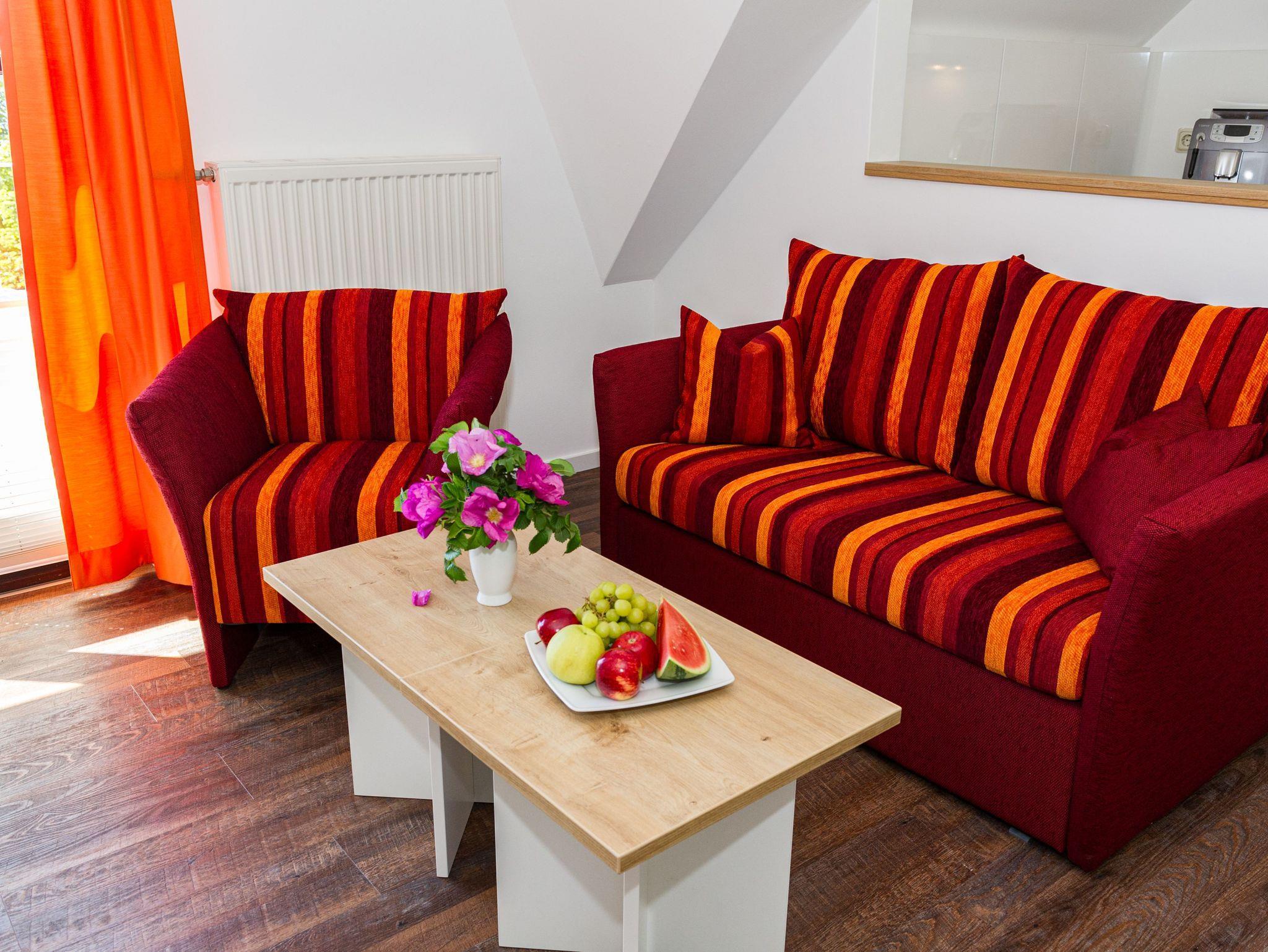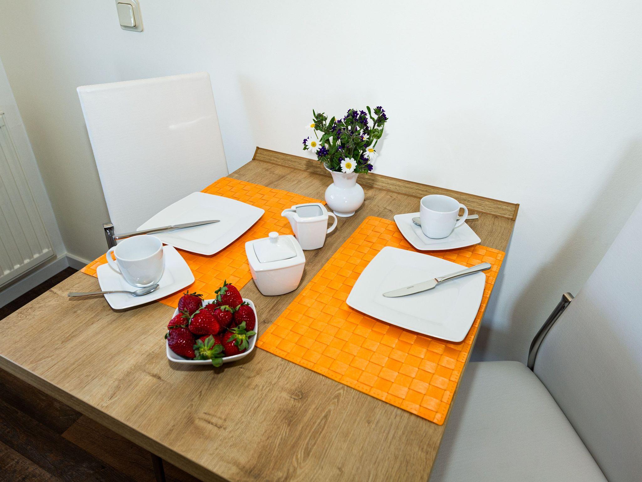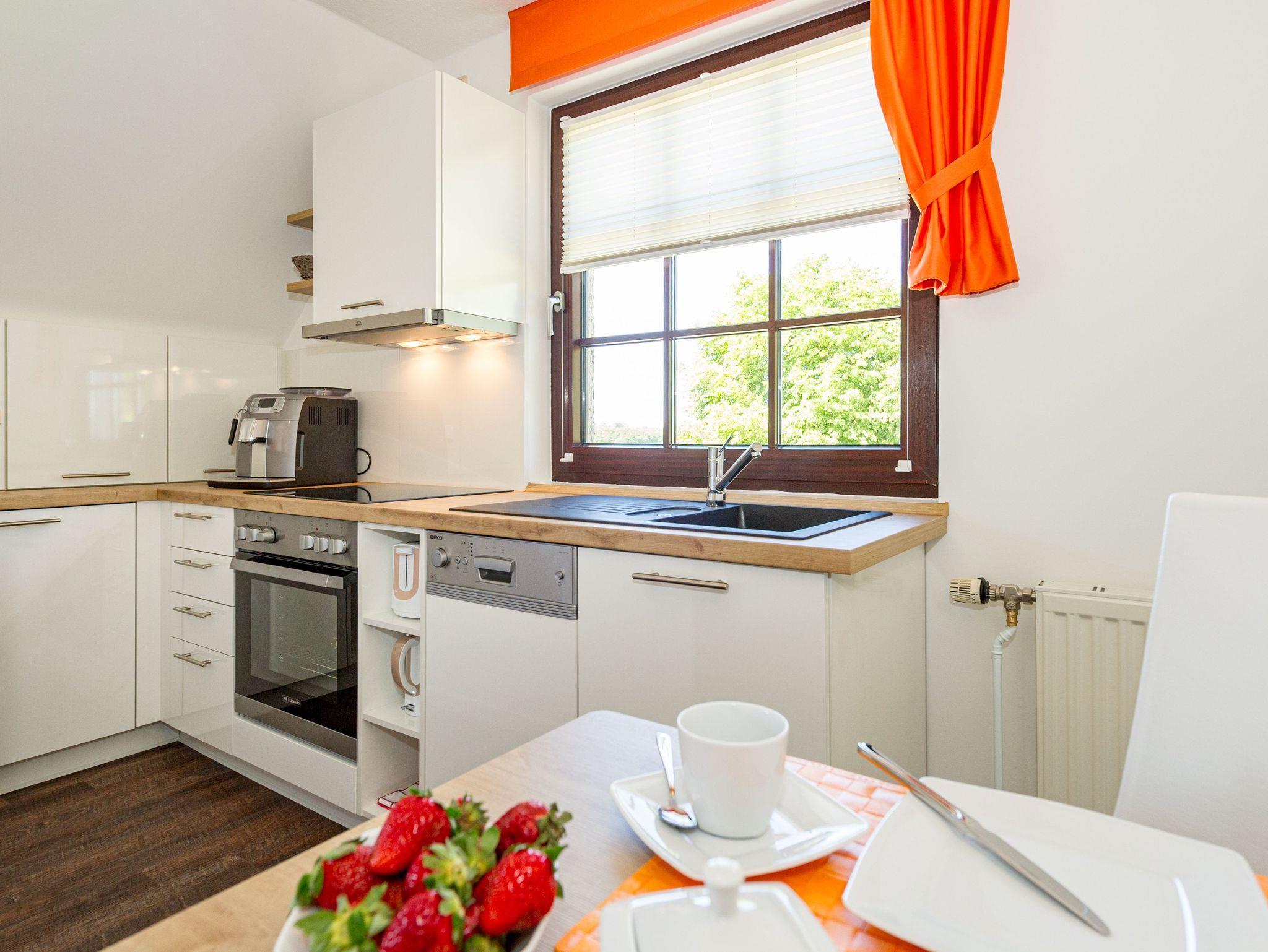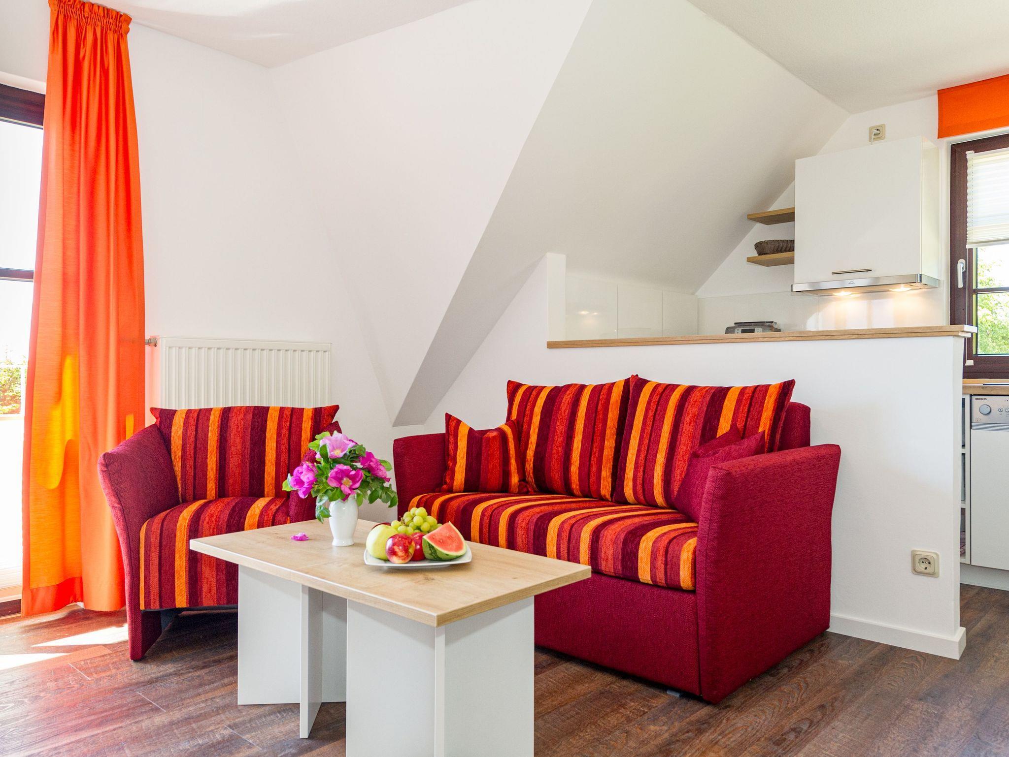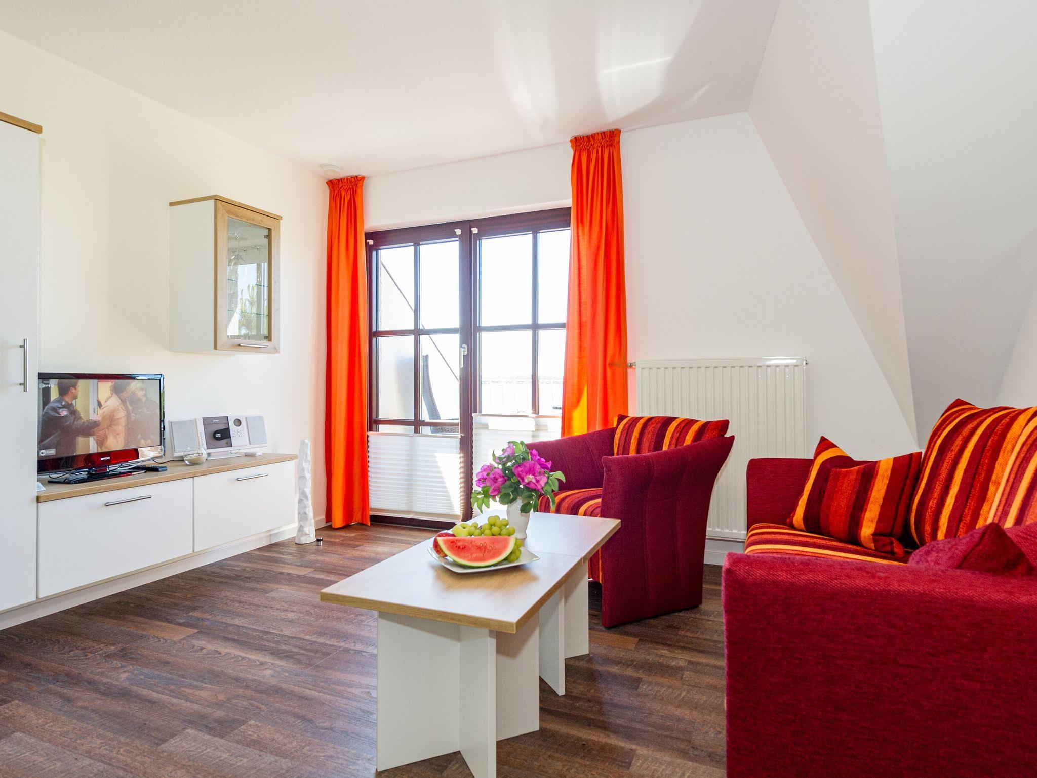 Im Wohnraum befinden sich eine bequeme Sitzcouch mit Tisch und ein modernes Flachbild-TV-Gerät. Hier befindet sich ein Esstisch mit Sitzgelegenheiten. Die moderne offene Küchenzeile ist mit einem Herd, Backofen, Spülmaschine, Wasserkocher, Kaffevollautomat, Toaster und Kühlschrank sowie jeweiliges Zubehör komplett ausgestattet.