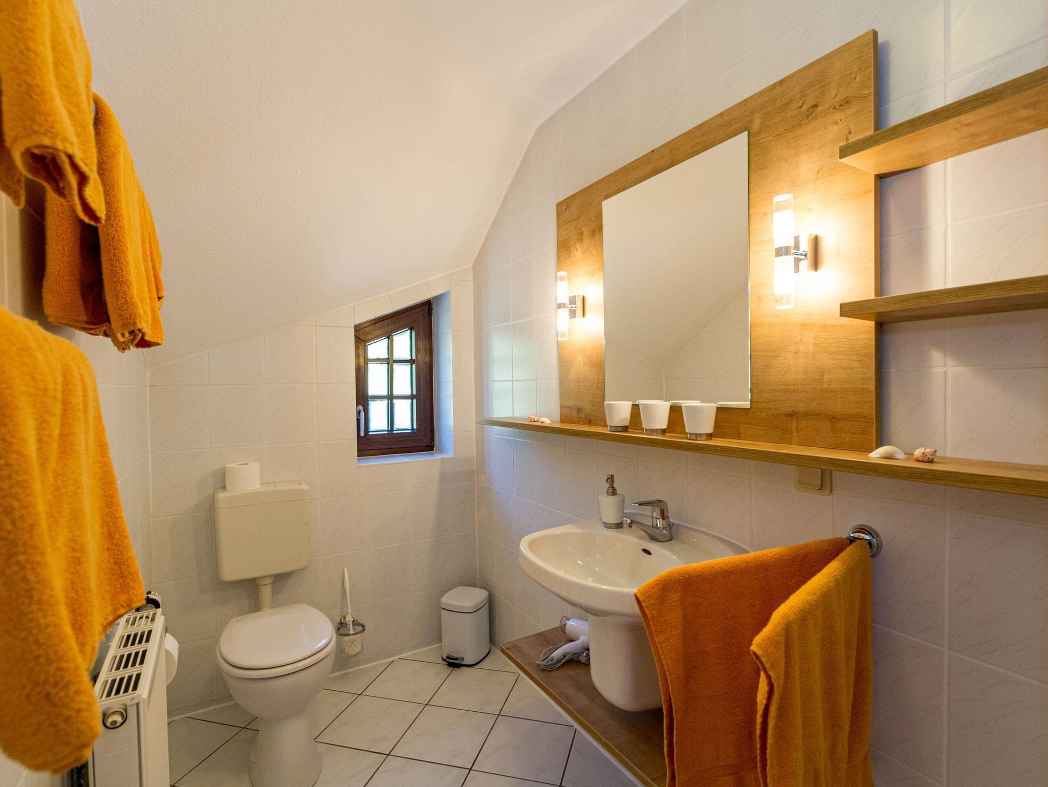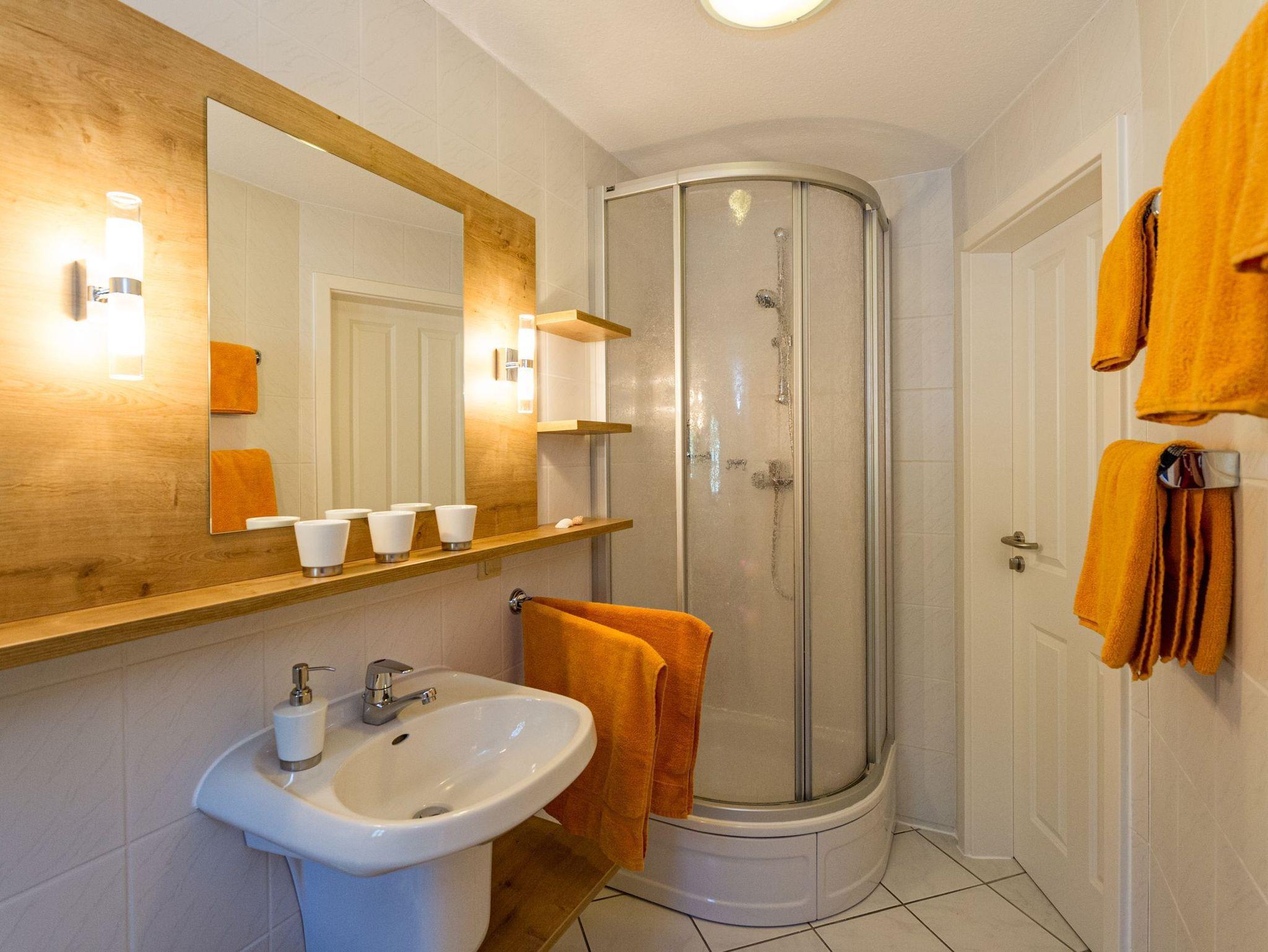 Im Schlafzimmer stehen ein Schreibtisch, ein bequemes Doppelbett mit Nachtschränken und Leselampen sowie ein dreitüriger Kleiderschrank mit Spiegel. Das Schlafzimmer verfügt darüber hinaus auch über ein modernes Flachbild-TV-Gerät. Gegen Aufpreis je Gast liegen für Sie frische Handtücher bereit und sind die Betten bereits mit Bettwäsche bezogen. Das Bad ist mit Dusche, WC und Waschtisch ausgestattet.
