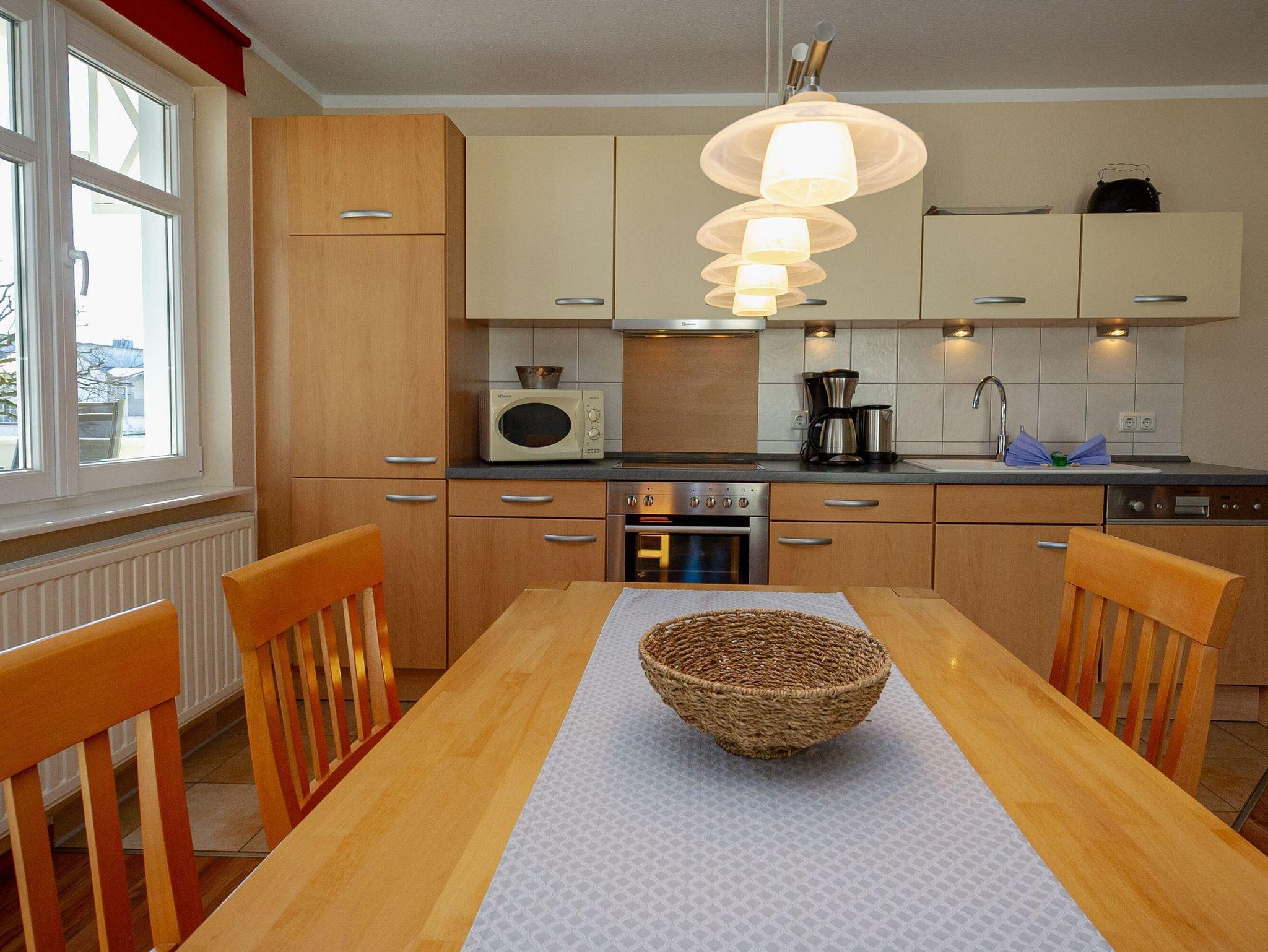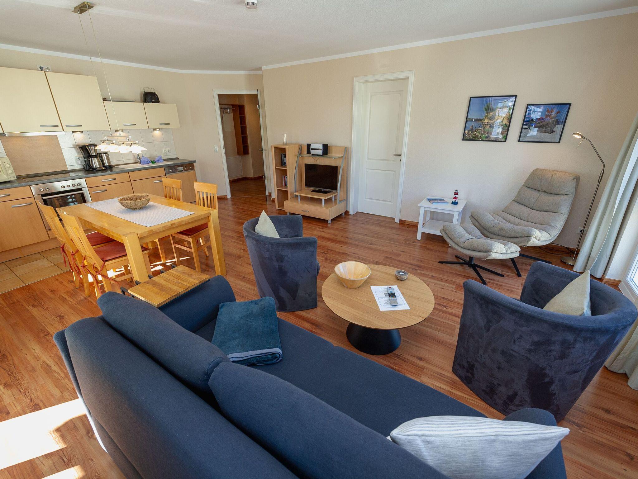 Der helle, freundliche Wohnraum ist mit einer bequemen Schlafcouch (die als Aufbettung für 2 Personen genutzt werden kann), 1 Sessel, 2 Korbsesseln, einem Flachbild-TV, einer Mini-Stereoanlage mit CD-Player und einem Esstisch eingerichtet. Die harmonisch in den Wohnbereich integrierte Küchenzeile ist ausgestattet mit einem Kühlschrank mit Gefrierfach, einem 4-Platten-Cerankochfeld, einem Backofen, einer Geschirrspülmaschine, einer Mikrowelle, Wasserkocher, Kaffeemaschine, Toaster und diversem Kleininventar, das die Küchenausstattung komplettiert.