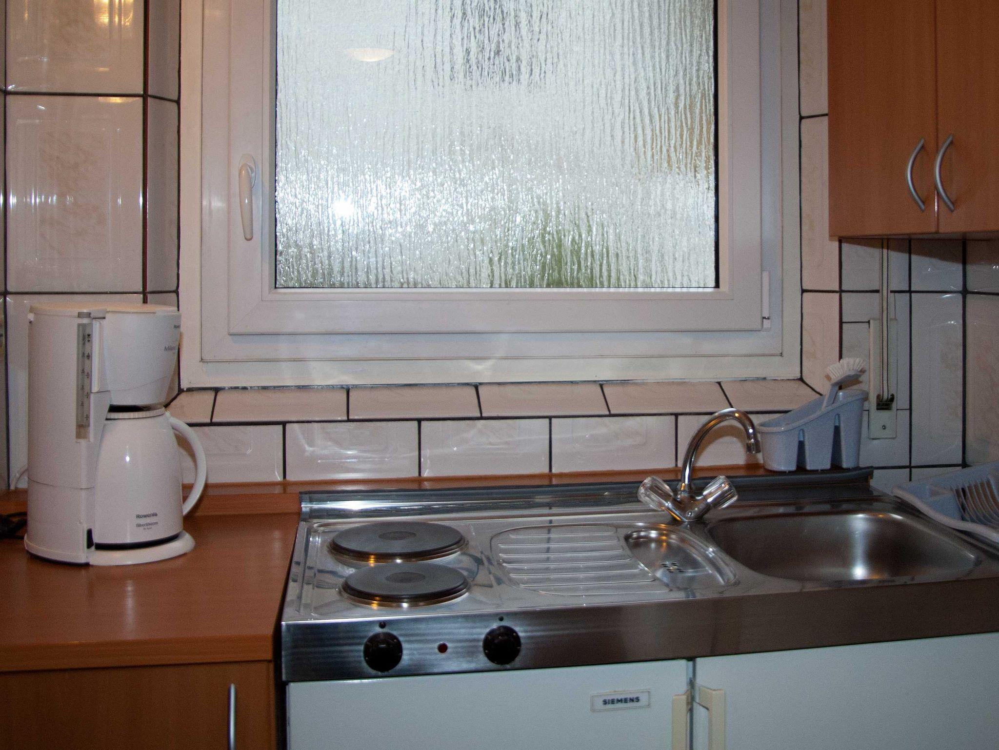 Eine kleine Küche (2-Plattenherd) ist nebenan. Für die kleinen Gäste steht ein Kinderbettchen bereit.