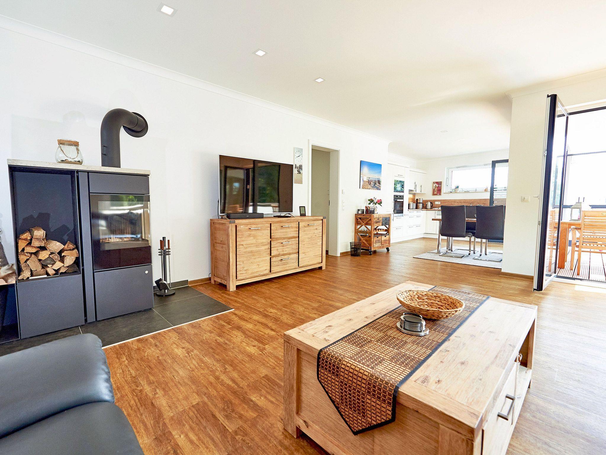 In den kühleren Monaten sorgt die Fußbodenheizung für eine behagliche Atmosphäre. Zusätzlich steht ein Kamin und Feuerholz zur Verfügung