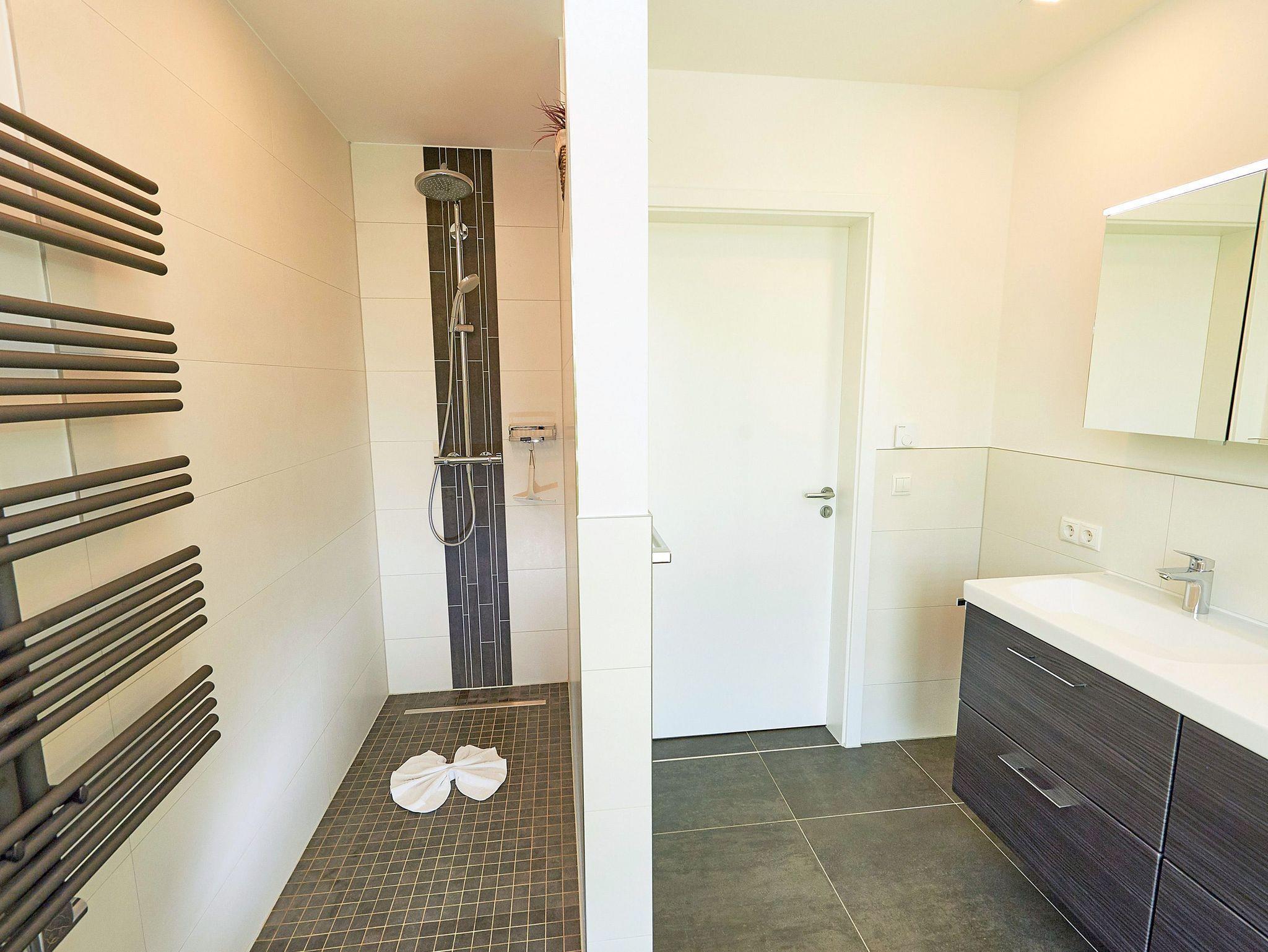 • ein Bad mit Doppelwaschtisch, WC und großer Dusche mit Rain Shower