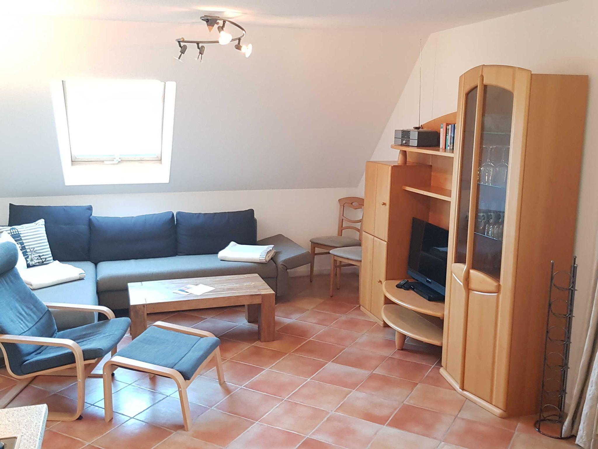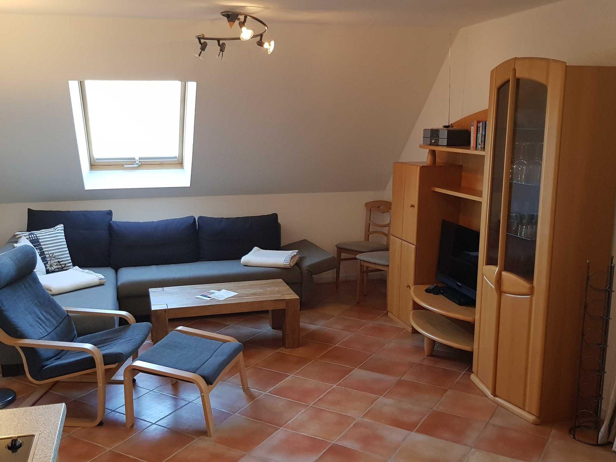 Sie liegt im Ober- und Dachgeschoss, hat eine Größe von 52m² und einen Balkon mit Morgensonne. Im Wohnbereich finden Sie eine Couch und einen Sessel, einen separaten Essbereich, einen Flachbild-TV und eine Stereoanlage.