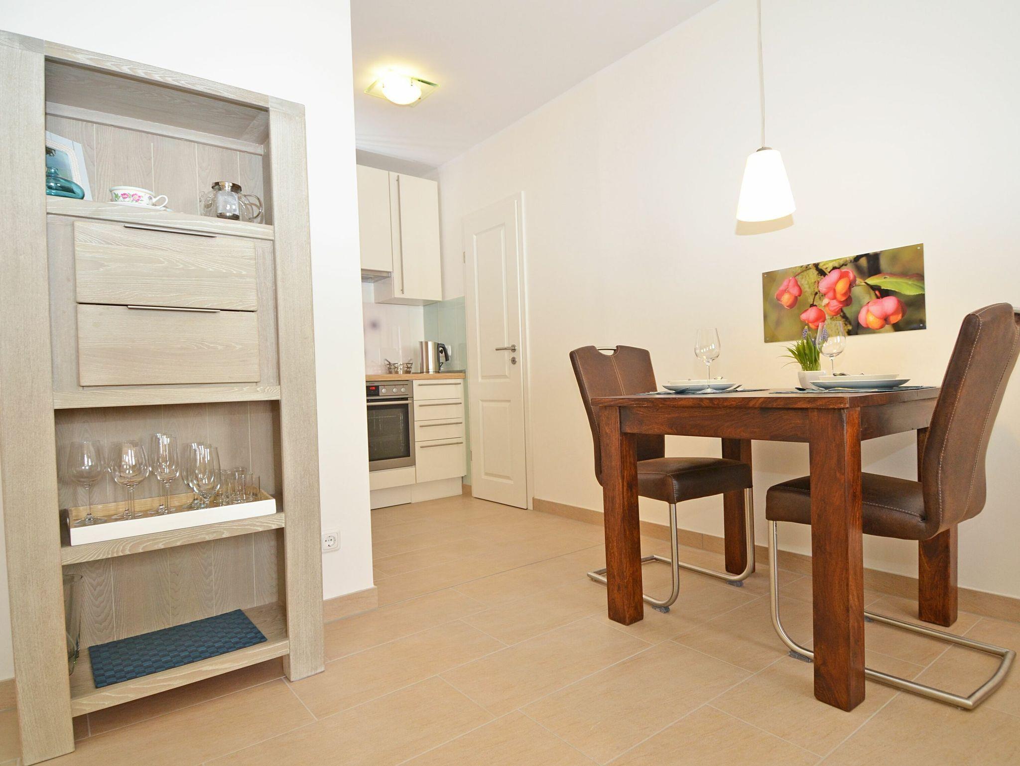 Vom Eingangsbereich gelangen Sie durch den kleinen Flur in den modernen hellen Wohnbereich, der mit hochwertigen Möbeln, einer Essecke mit stabilem Holztisch und zwei bequemen Stühlen ausgestattet ist. Für gute Unterhaltung sorgen der 32-Zoll LED-TV, ein Blue-Ray-Abspielgerät und ein CD-Radio (iPod-Anschluss) mit verschiedenen CDs. Ein W-LAN-Anschluss steht Ihnen kostenfrei zur Verfügung. Vom Wohnbereich gelangen Sie auf den Balkon. Bequeme Flechtsessel laden nach einem spannenden Urlaubstag dazu ein, den Tag entspannt ausklingen zu lassen.