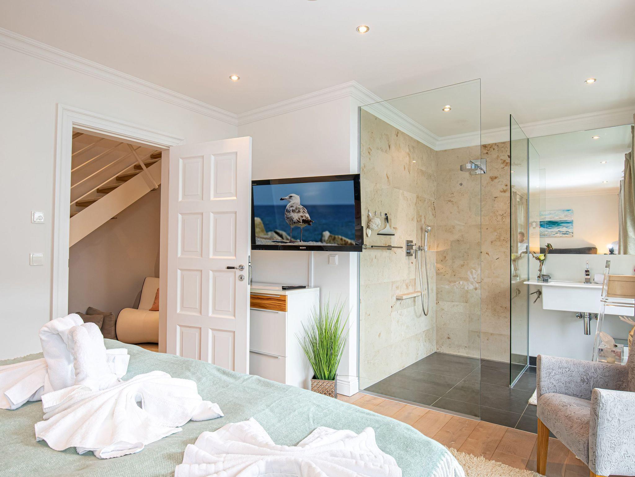Wir freuen uns, Ihnen diese Mitte 2023 frisch renovierte Wohnung in bester Lage von Sellin anbieten zu können. Dieses tolle Domizil wurde mit viel Liebe zum Detail für Ihren perfekten Urlaub geschaffen. Bequem per Aufzug erreichen Sie aus der Tiefgarage das Promenadendeck im 1. Obergeschoss der Villa Paula. Auf insgesamt 2 Etagen erstrecken sich ein Eingangsbereich, ein Gäste-WC, ein Schlafzimmer mit Bad en Suite, ein großer Wohn-, Essbereich, sowie 2 tolle Balkone mit seitlichem Meerblick. Zusätzlich steht allen Gästen des Hauses ein kostenfreier Pool (saisonbedingt) zur Verfügung. Durch die hochwertige Schlafcouch im Wohnbereich können wir Ihnen dieses Domizil für bis zu 4 Personen anbieten.