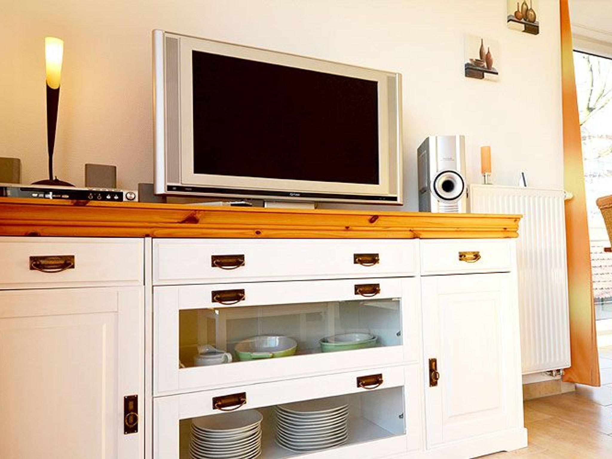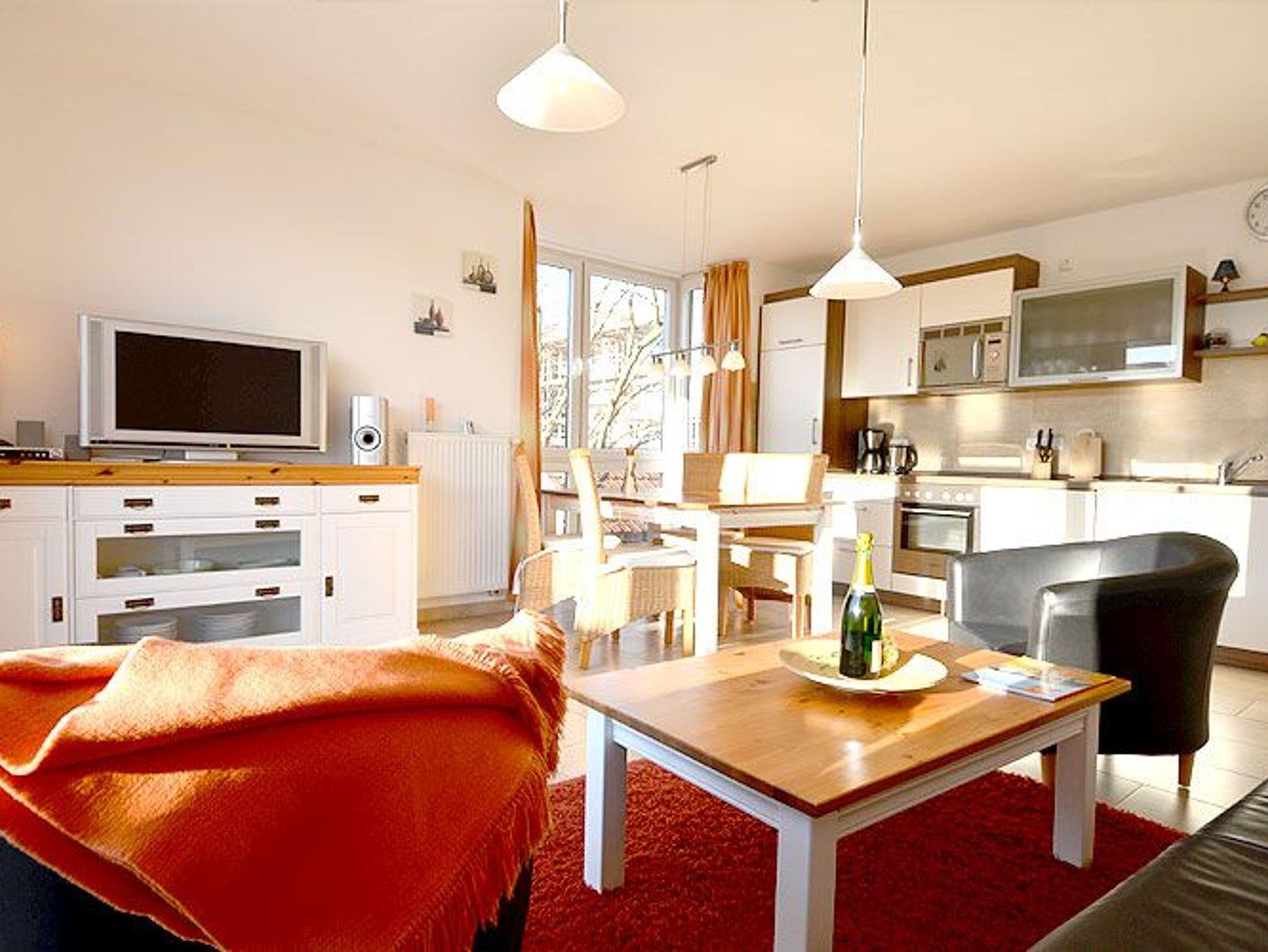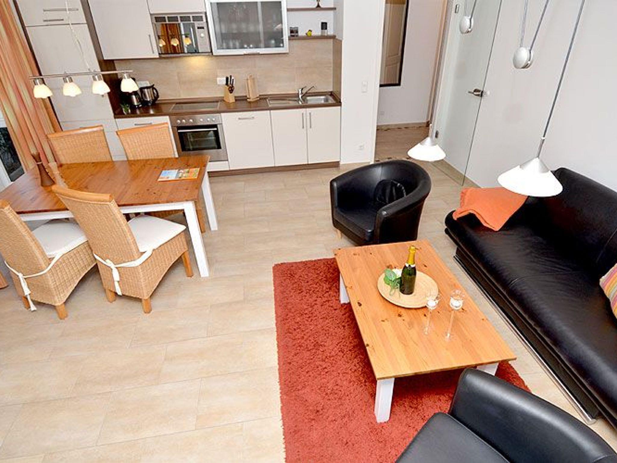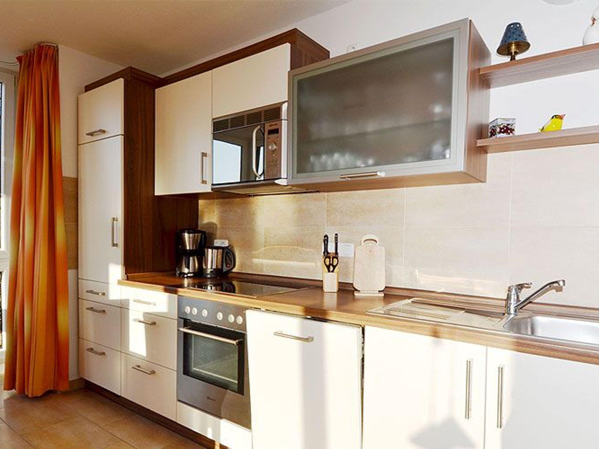 Vom Eingangsbereich aus gelangen Sie über den Flur in den modern ausgestatteten Wohnbereich mit einem LCD-Fernseher mit integrierter Stereoanlage und DVD-Player sowie einem großen Esstisch und integrierter Küchenzeile. In dieser finden Sie einen Kühlschrank mit Gefrierfach, einen Backofen, ein 4-Zonen-Cerankochfeld, eine Spülmaschine sowie Mikrowelle, Toaster, Mixer, einen Eierkocher für das morgendliche Frühstücksei und diverses Kleininventar, das die Küchenausstattung komplettiert.