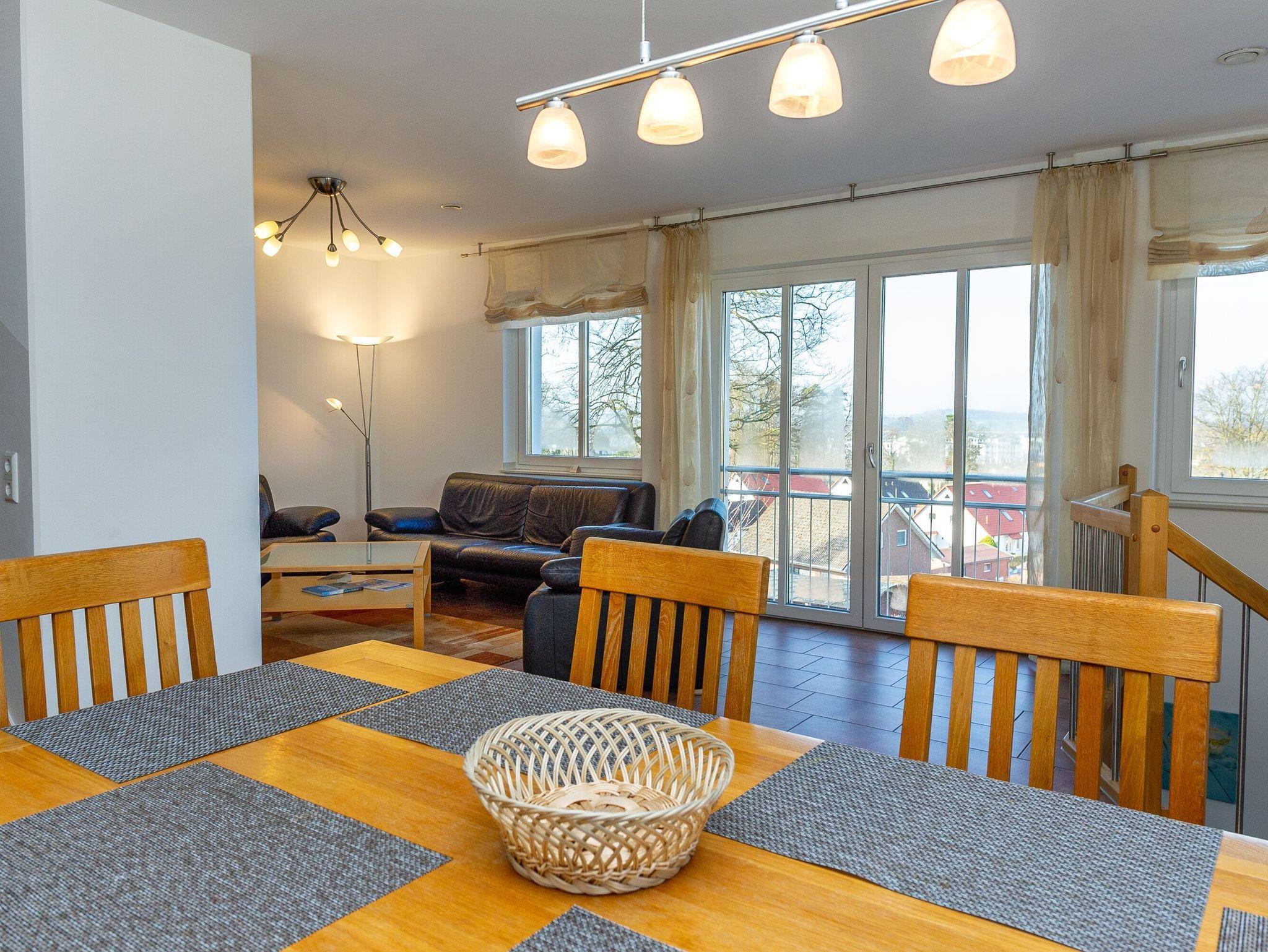 Über den Flur mit Garderobe, Spiegel, Schuhablage, [&] Co. betreten Sie den lichtdurchfluteten Wohn- und Essbereich, der mit seiner modernen und hochwertigen Ausstattung sofort zum Wohlfühlen einlädt. Die gemütliche Ledergarnitur wartet förmlich darauf, dass Sie hier vor dem großen Flachbild-TV Platz nehmen, für den sogar eine PlayStation 4 vorhanden ist. Natürlich gibt es zur medialen Unterhaltung auch ein Radio mit CD-Player und kostenfreies W-LAN.