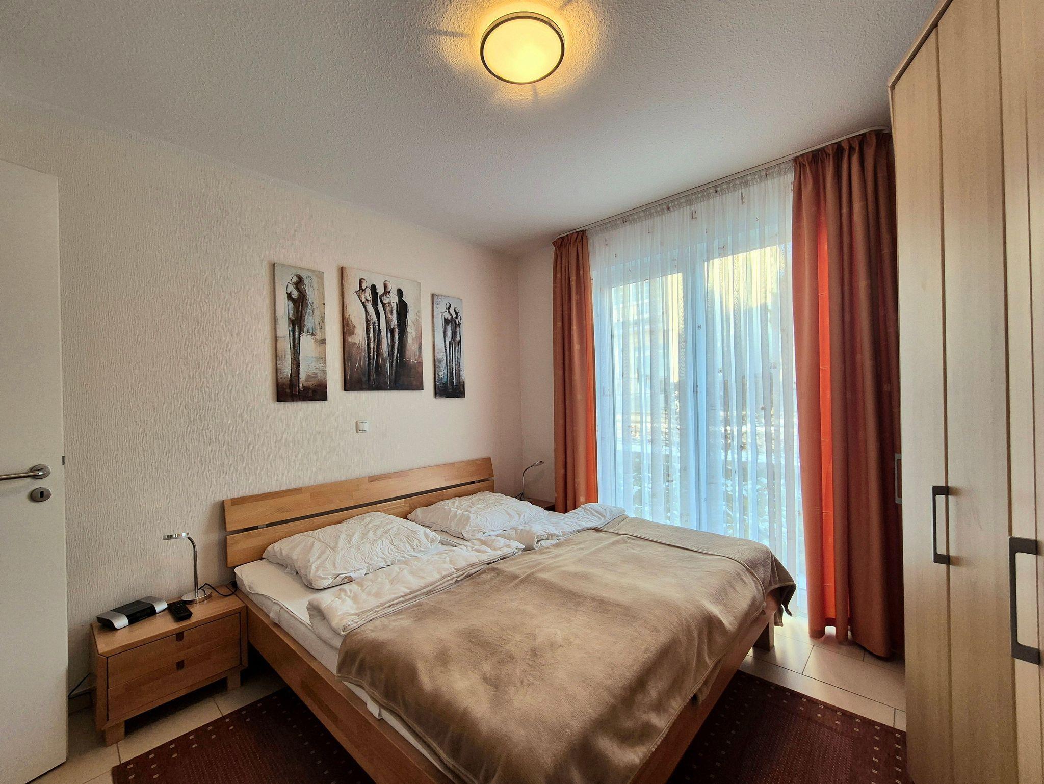 Im Schlafzimmer befindet sich ein Doppelbett, Kleiderschrank und ein Flachbild TV. Das Badezimmer ist mit einer Dusche, WC und Fußbodenheizung ausgestattet.