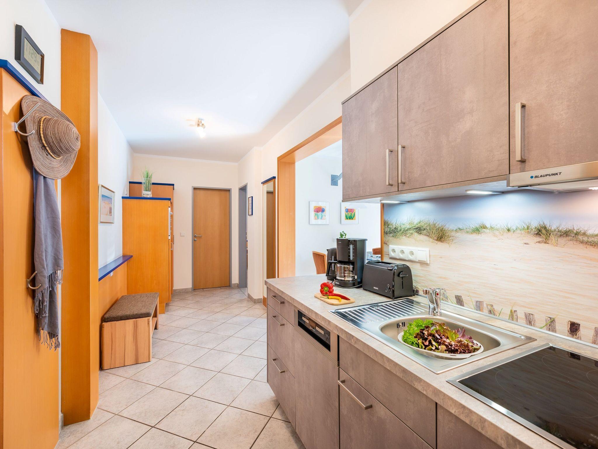 Die Küchenzeile ist mit einem Kühlschrank, einem Ceranfeld, einer Spülmaschine und einem Backofen/Mikrowelle ausgestattet. Ebenso finden sich hier alle nötigen Küchen-Kleingeräte (Wasserkocher, Kaffeemaschine, Toaster..).