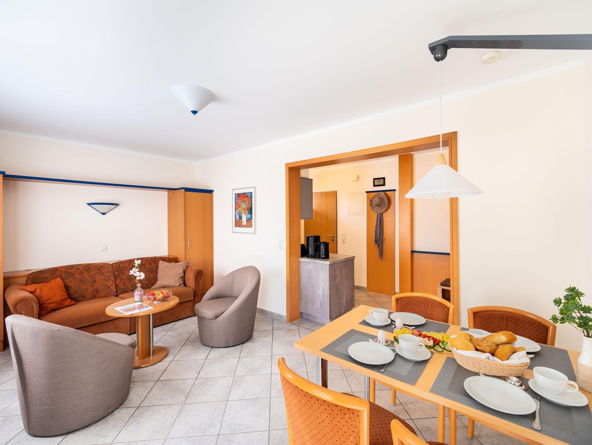 Das helle Wohnzimmer verfügt über eine Couchgarnitur, welche ebenso eine Aufbettung für 2 weitere Personen darstellt. Neben einem TV und einem kostenfreien WLAN-Zugang erreichen Sie von hier aus die sonnige Terrasse inkl. Terrassenmöbel.