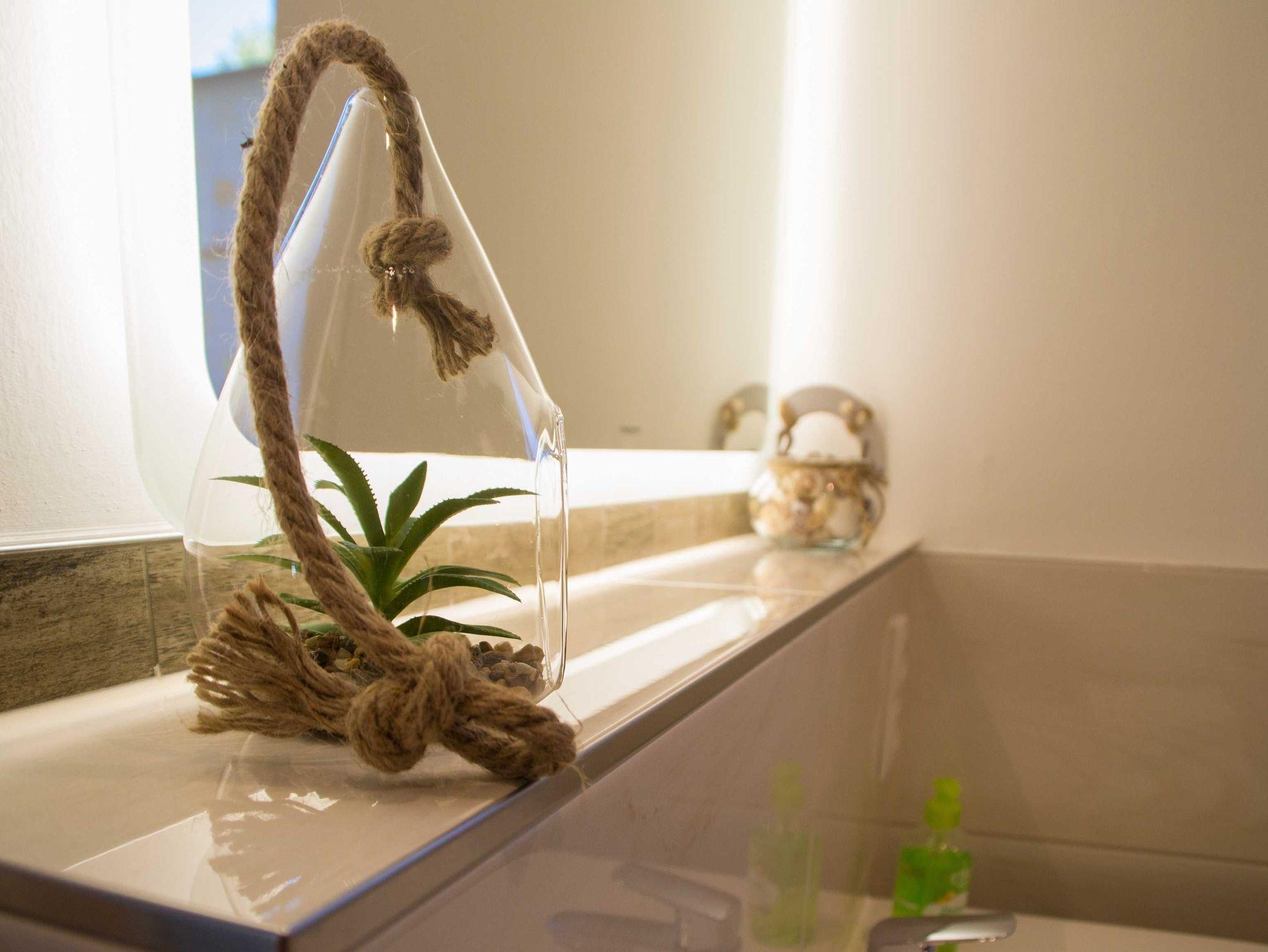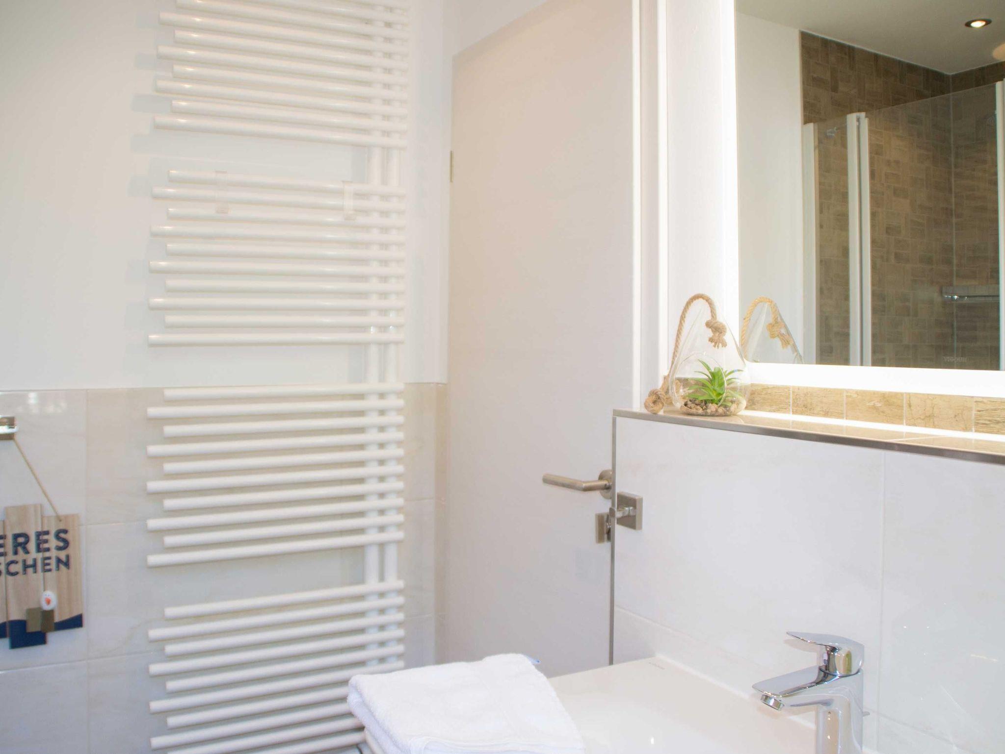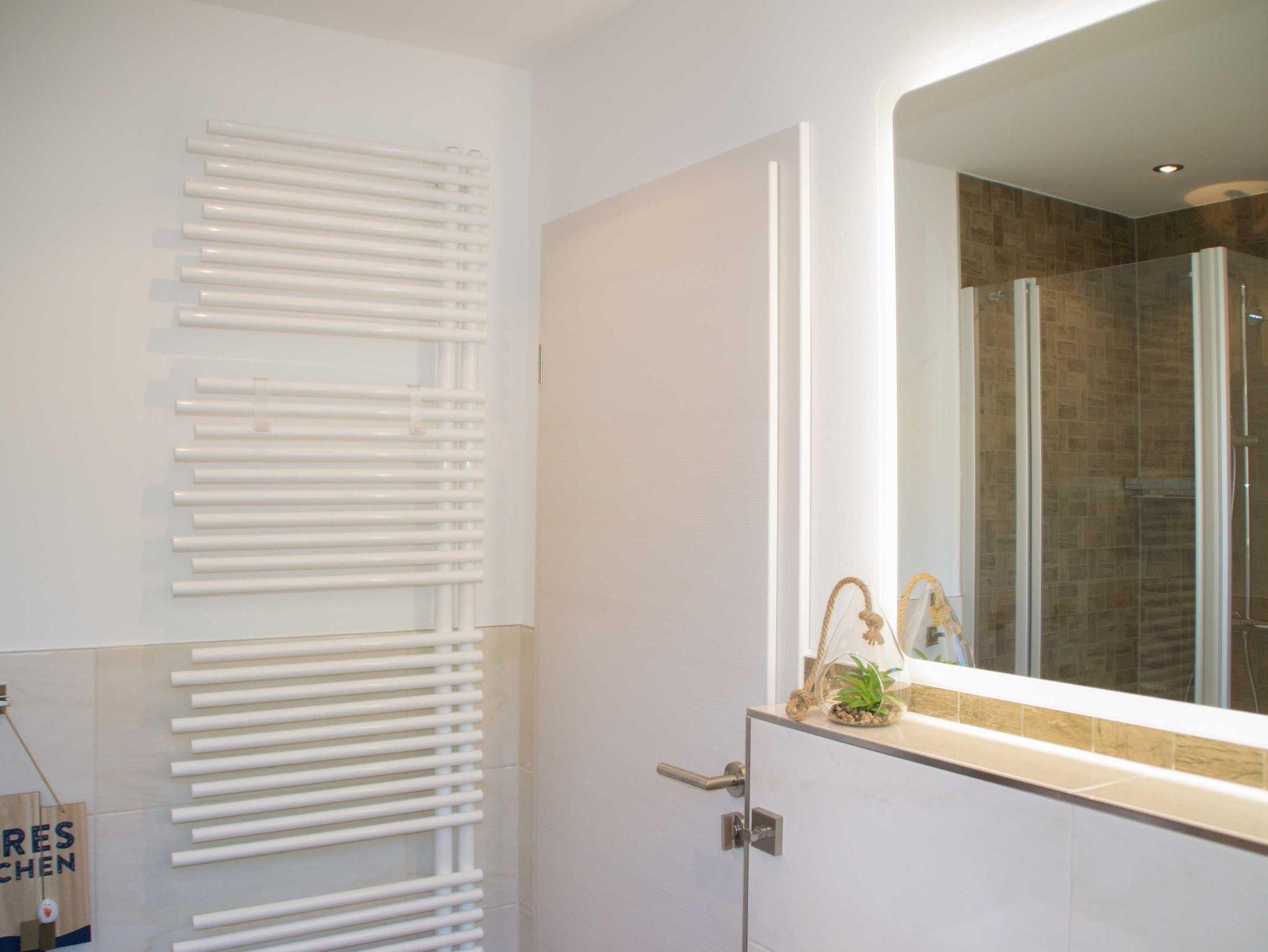 • hochwertiges Bad mit Dusche, großen Waschtisch, WC und Handtuchheizkörper