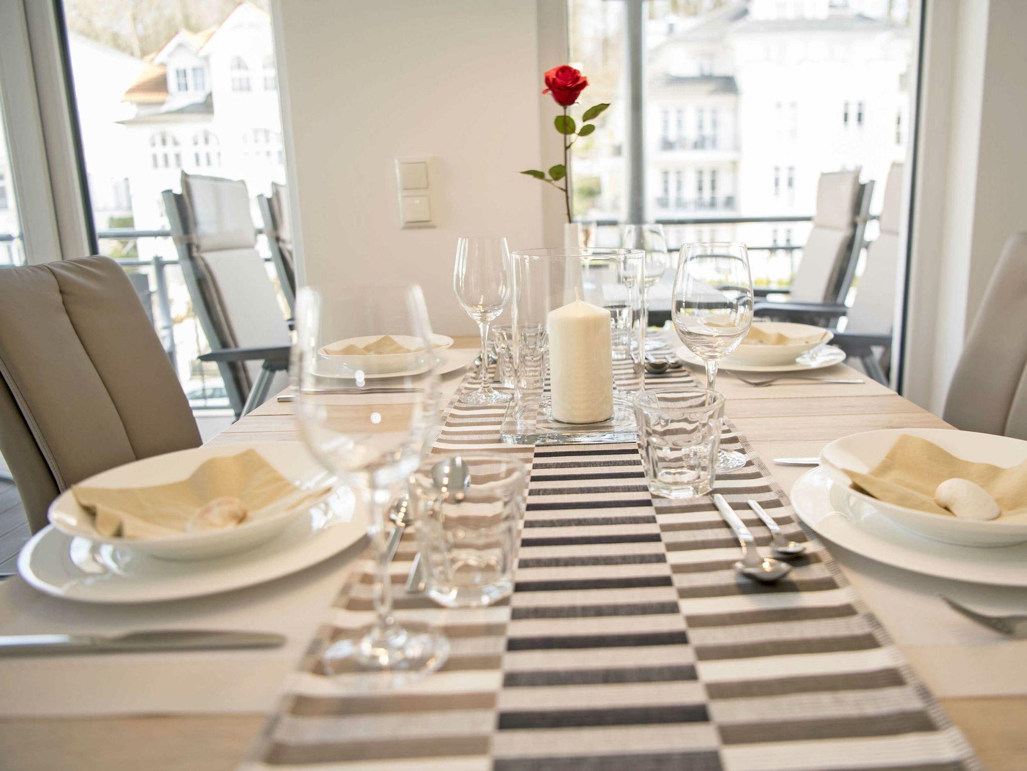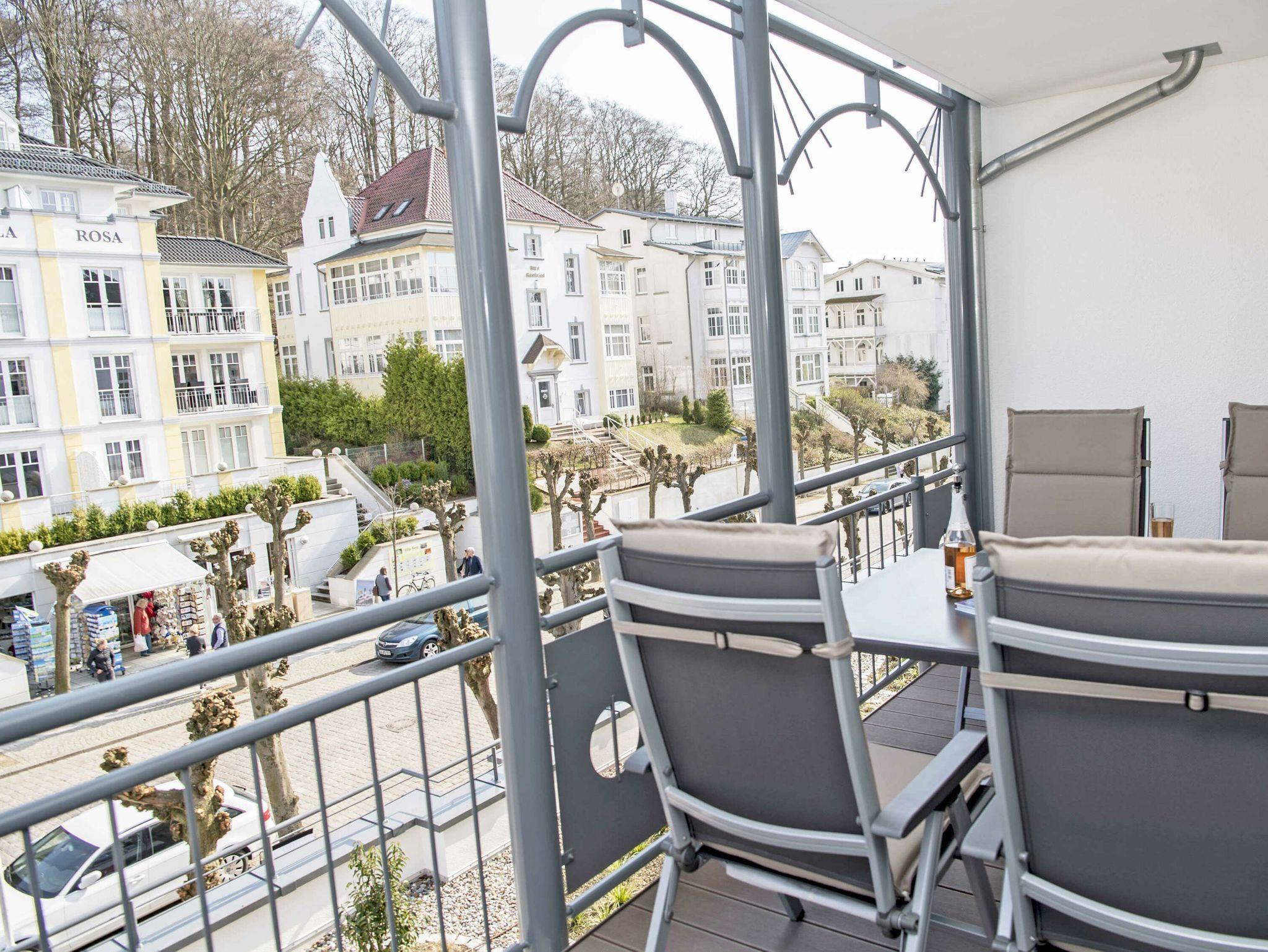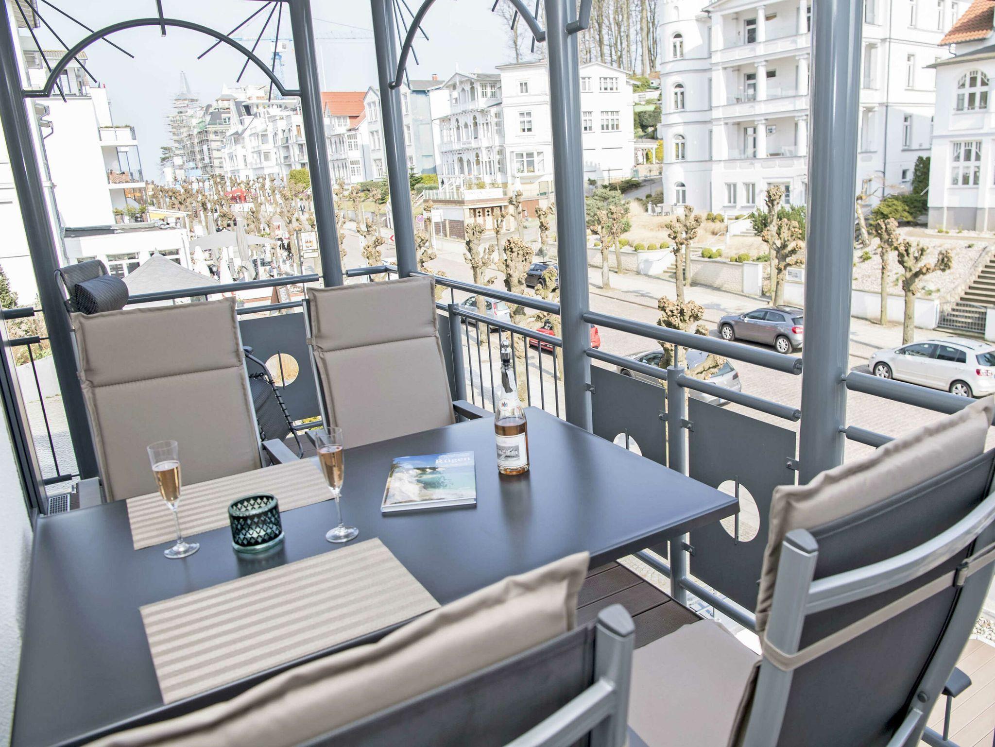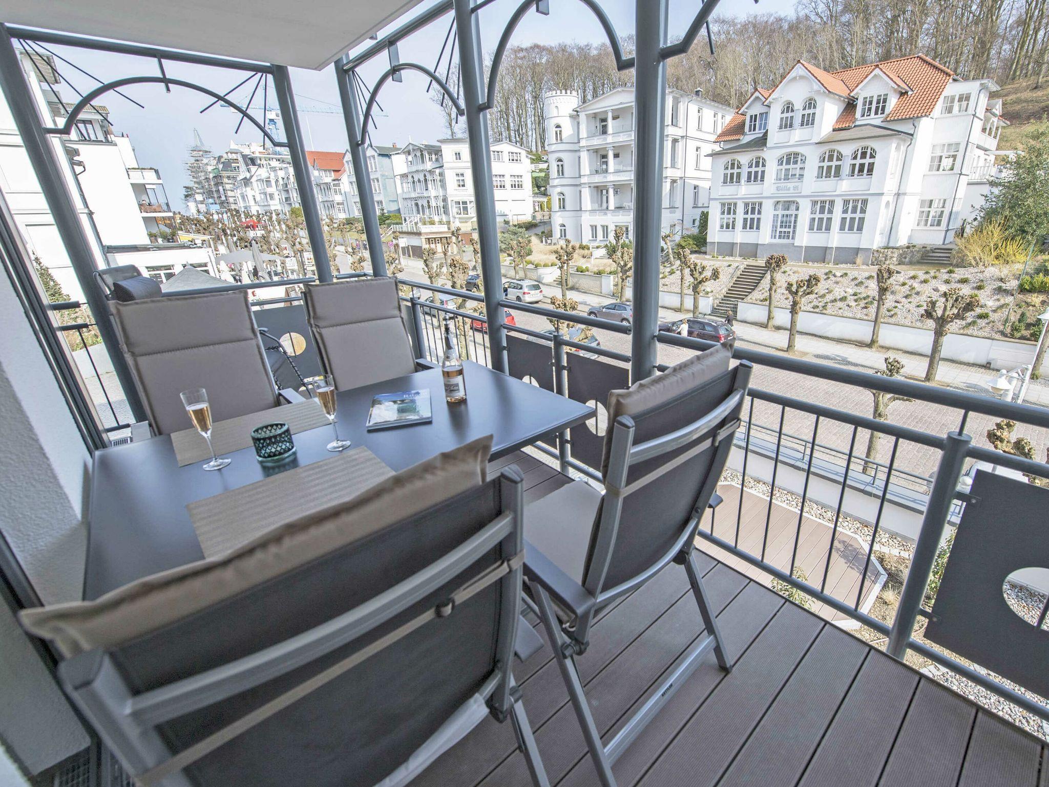 Der schöne, überdachte und mit filigranen Bäderarchitektur-Elementen verzierte Balkon, verfügt über eine elegante Sitzgruppe der Marke Kettler mit Multipositions-Sesseln und -Liegen. Vom Team des benachbarten Café Wilhelm können Sie sich die knackigen Brötchen quasi auf den Frühstückstisch werfen lassen. Probieren Sie unbedingt auch die leckeren Torten.
