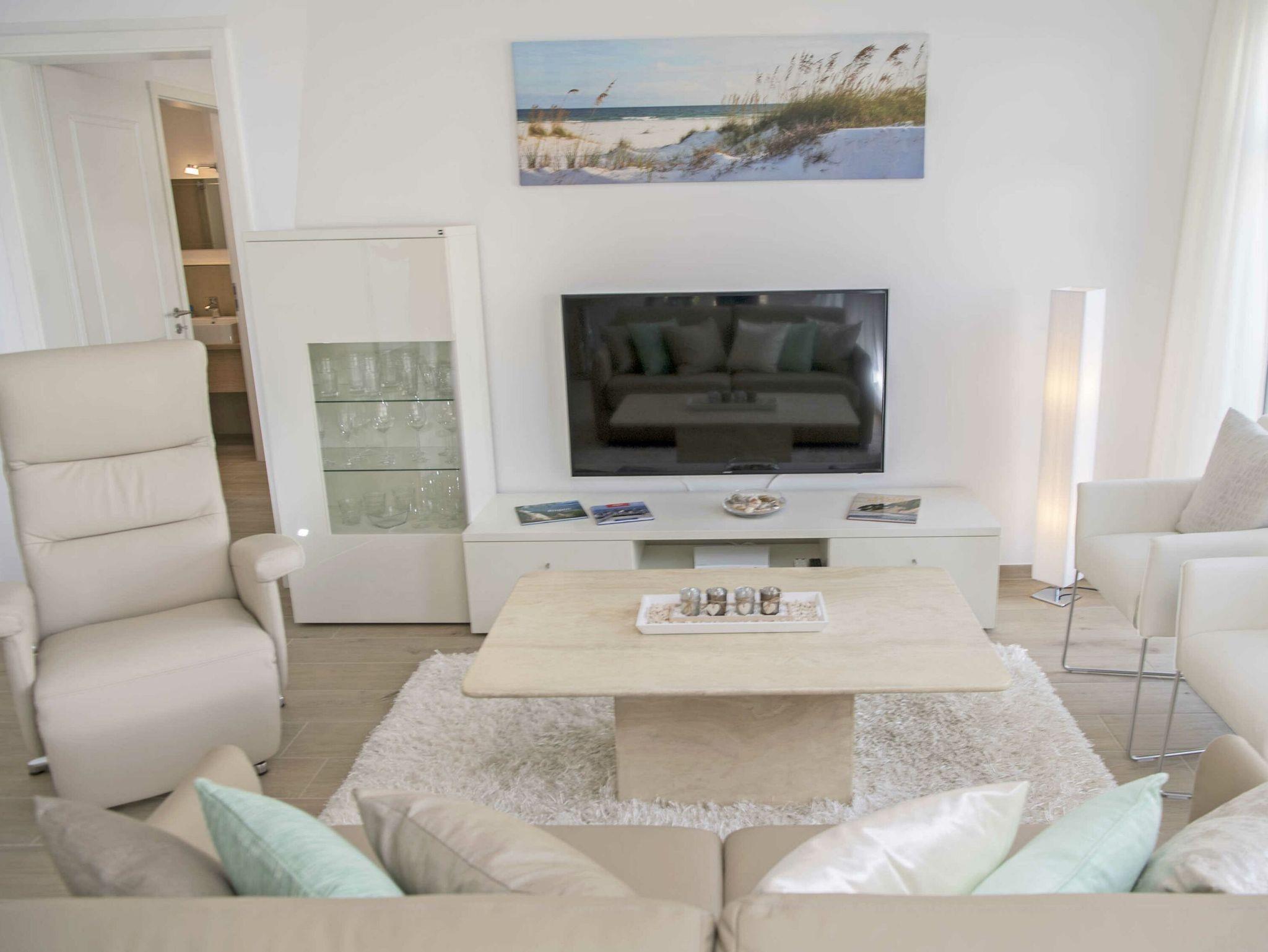 Die 4*-Wohnung verfügt komplett über eine raumweise individuell regulierbare Fußbodenheizung. Die Ausstattung mit hochwertiger Unterhaltungselektronik lässt nichts zu wünschen übrig. Sie nutzen kostenfreies W-LAN. Im Wohn-/Essbereich sowie in den beiden Schlafzimmern erfreuen Sie sich jeweils an großformatigen Samsung-Flachbildfernsehern mit Full-HD neuester Generation, u.a. Internetzugang, zum Teil mit BluRay-DVD-Player. Machen Sie es sich im Wohnzimmer bequem im Relax-Fernseh-Sessel “Movie Star” - wir laden Sie kostenfrei in die Welt der Unterhaltung mit SKY-TV ein. Ein Compact Stereo System von Philips mit Radio/ CD-Player/ iPod-/iPhone-/iPad- und Bluetooth-Schnittstelle sowie USB Anschluss ist ebenfalls für besten Musikgenuß vorhanden.