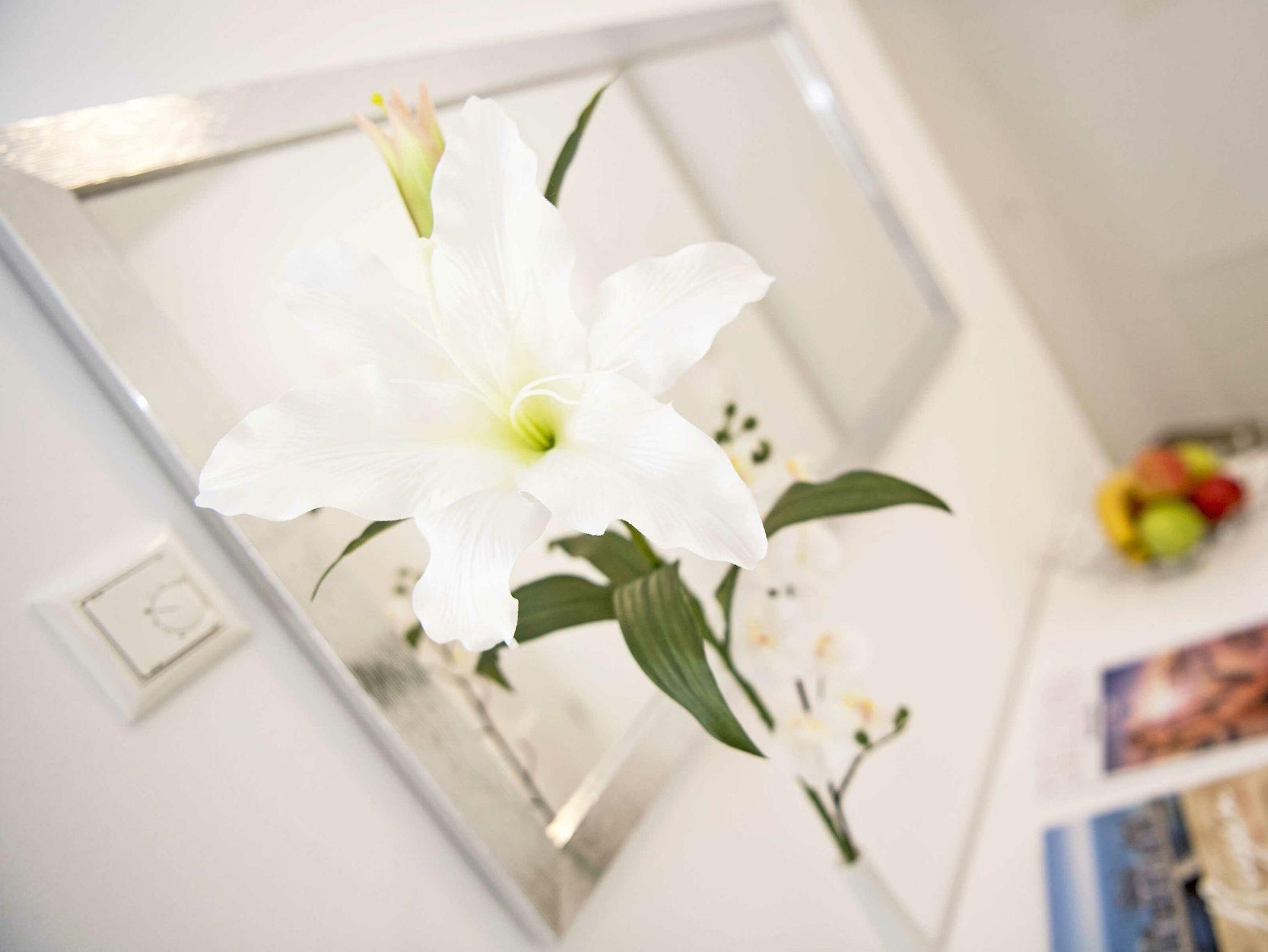 Raumhohe Fenster, Fußbodenheizung, Insektenschutzgitter, kostenfreies W-LAN, SKY-TV, eigene Fahrräder für unsere Gäste, ein Tiefgaragenparkplatz mit Fahrradraum und Hauslift sind nur einige der zahllosen weiteren Annehmlichkeiten.