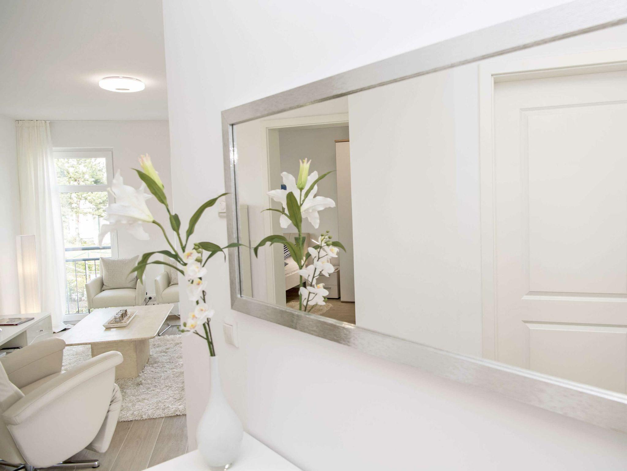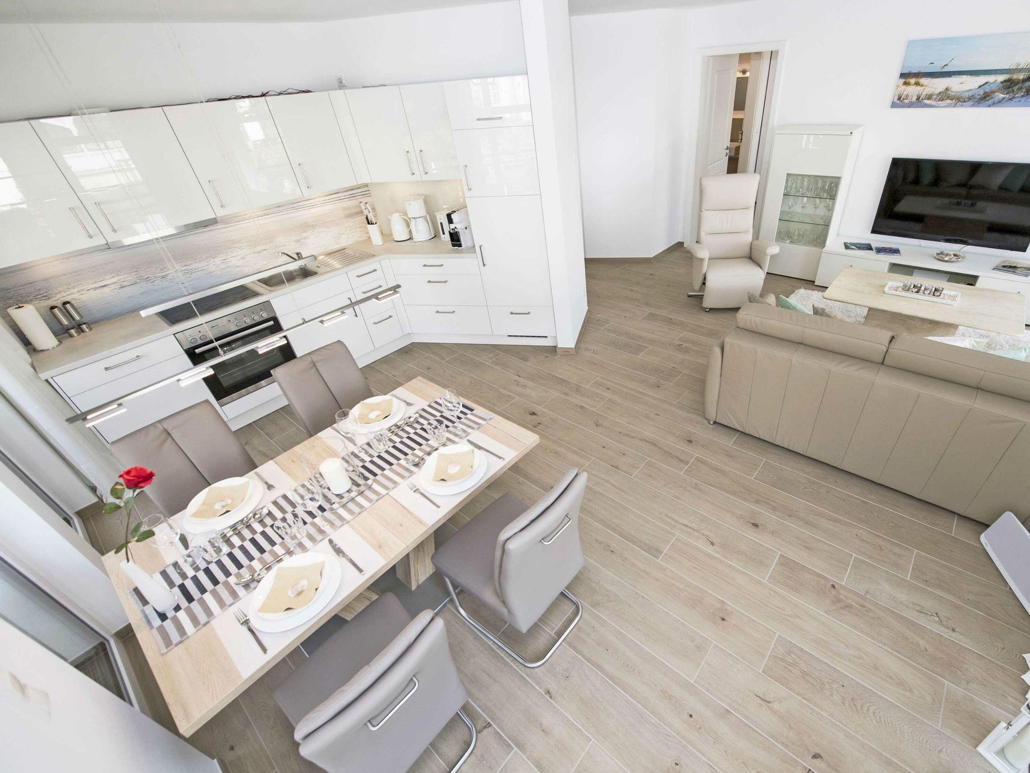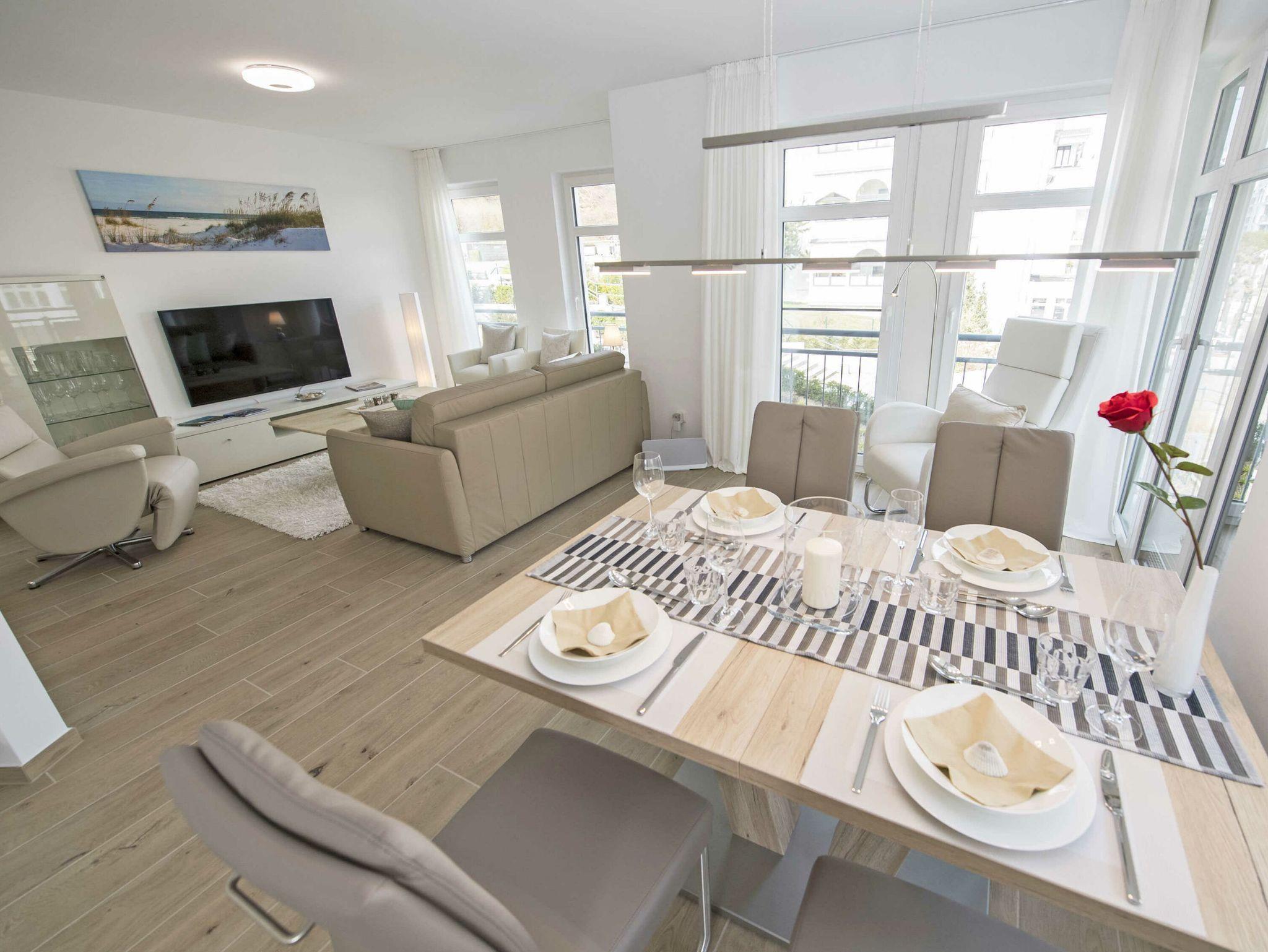 Der offene Wohnungsgrundriss sorgt für ein luftig leichtes Wohngefühl. Einen außergewöhnlichen Charakter erhält der große lichtdurchflutete Wohn-/Essbereich mit dem offenen Küchentresen durch die schöne Bodengestaltung, die raumhohen Fenster zu zwei Seiten und durch den überdachten Balkon. Die Einrichtung ist hochwertig und mit Liebe zum Detail sehr geschmackvoll in dezenten Farben gehalten. Die Farbtöne des blauen Himmels, der grünen Wälder, des klaren blauen Wassers und des herrlichen weißen feinsandigen Selliner Haupt- und Südstrandes stimmen Sie auf die schöne Natur vor Ihrer Haustür ein.