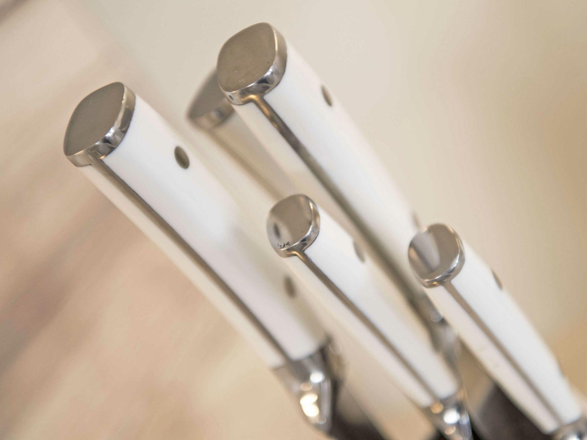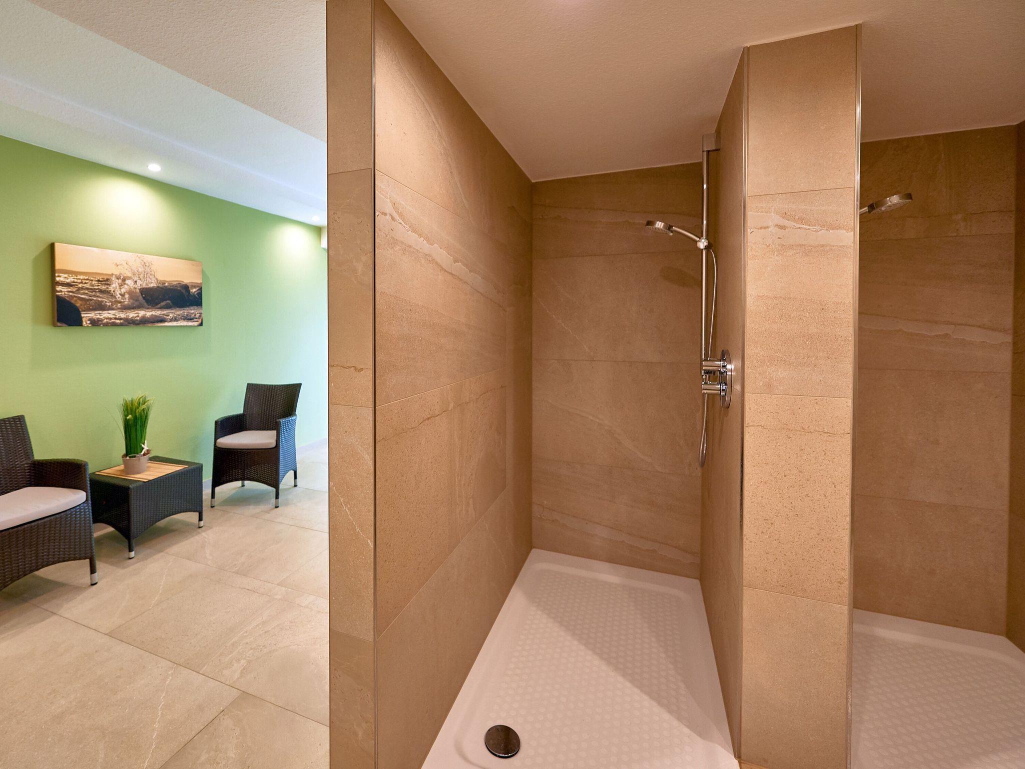 Die beiden Duschbäder sind hochwertig gefliest und verfügen über anspruchsvolle Sanitärobjekte und Armaturen von Grohe und Duravit. Eine Münz-Waschmaschine und -Trockner stehen im Hauswirtschaftsraum im Erdgeschoss für kleines Geld zur Verfügung. Bügelbrett und Bügeleisen sind in der Wohnung vorhanden.