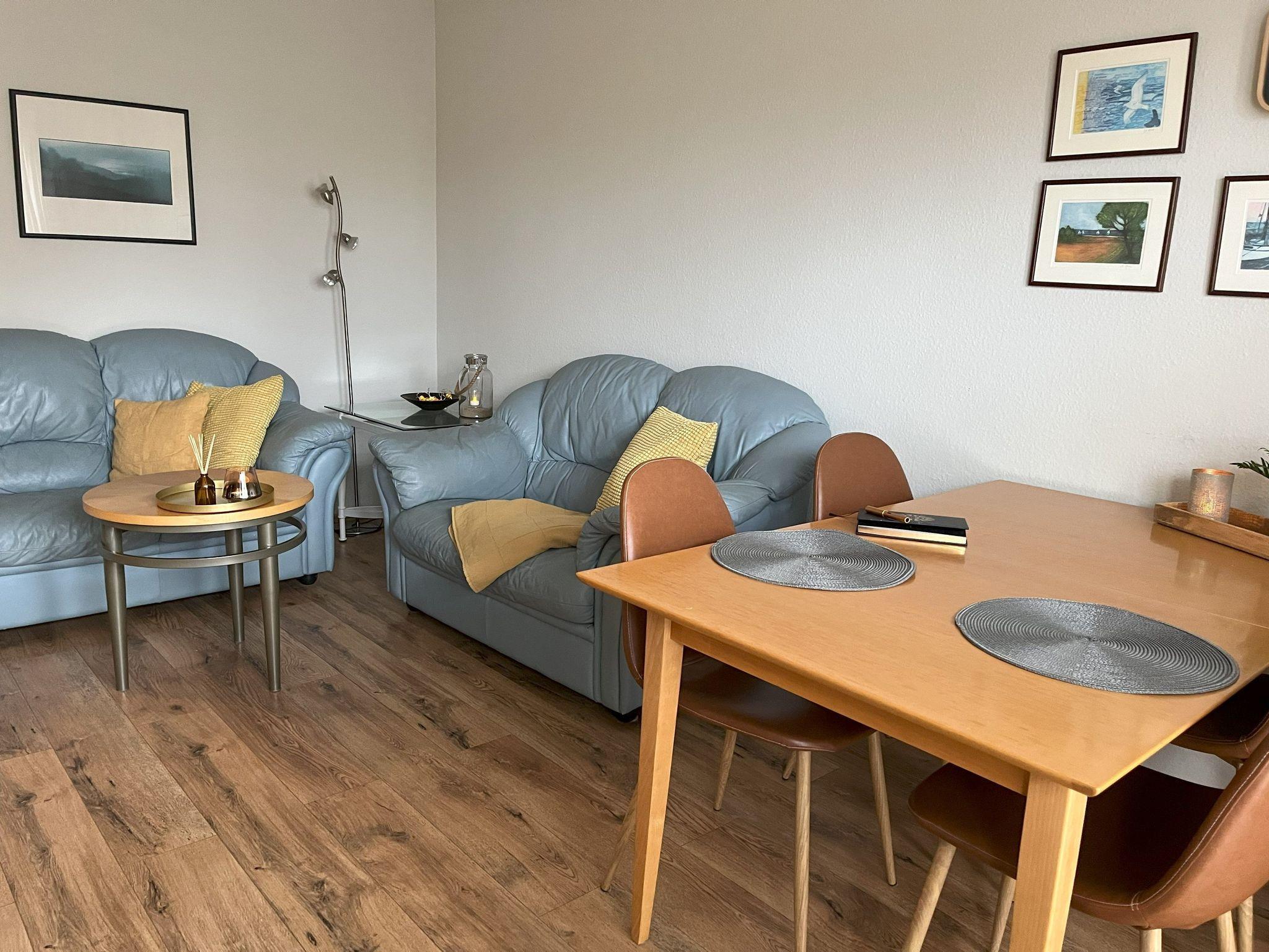 Das Wohnzimmer ist mit 2 gemütlichen Ledercouchen ausgestattet sowie Flachbildschirm und DVD-Player. Einige Gesellschaftsspiele, DVD's und Bücher runden den Wohnbereich ab. Ein Esstisch mit 6 Stühlen und Hochstuhl für ein Kleinkind runden die Ausstattung des Wohnzimmers ab.