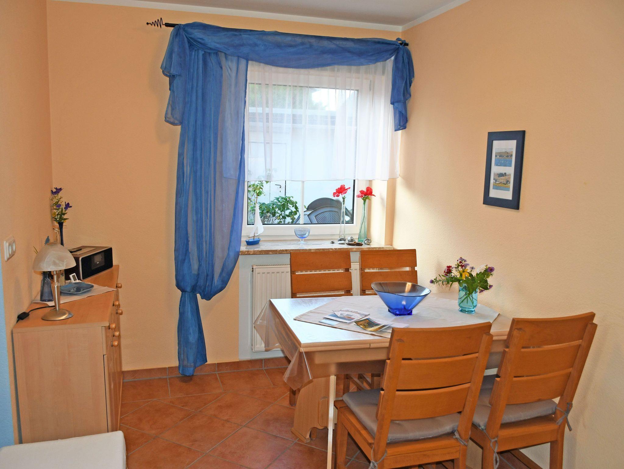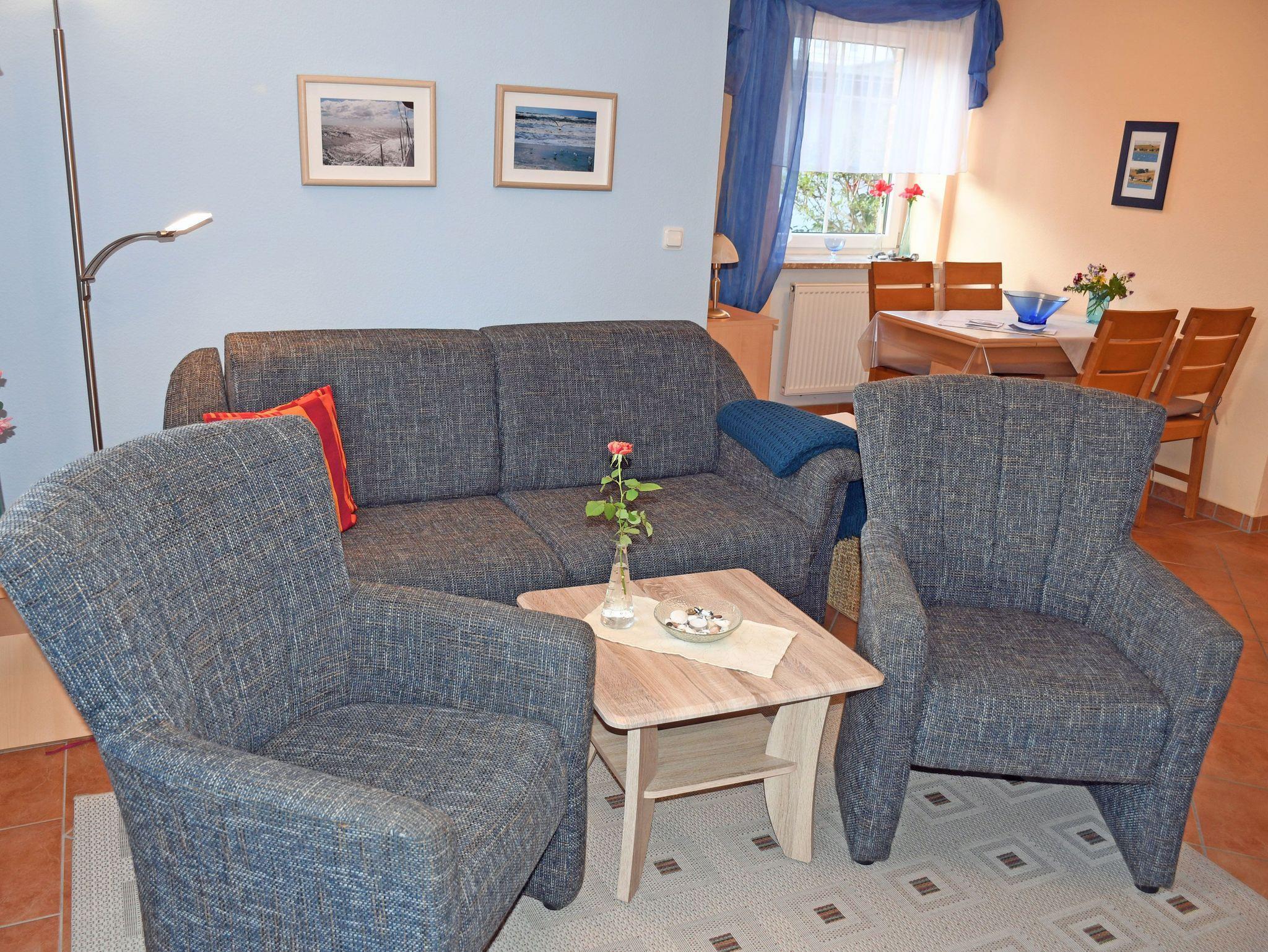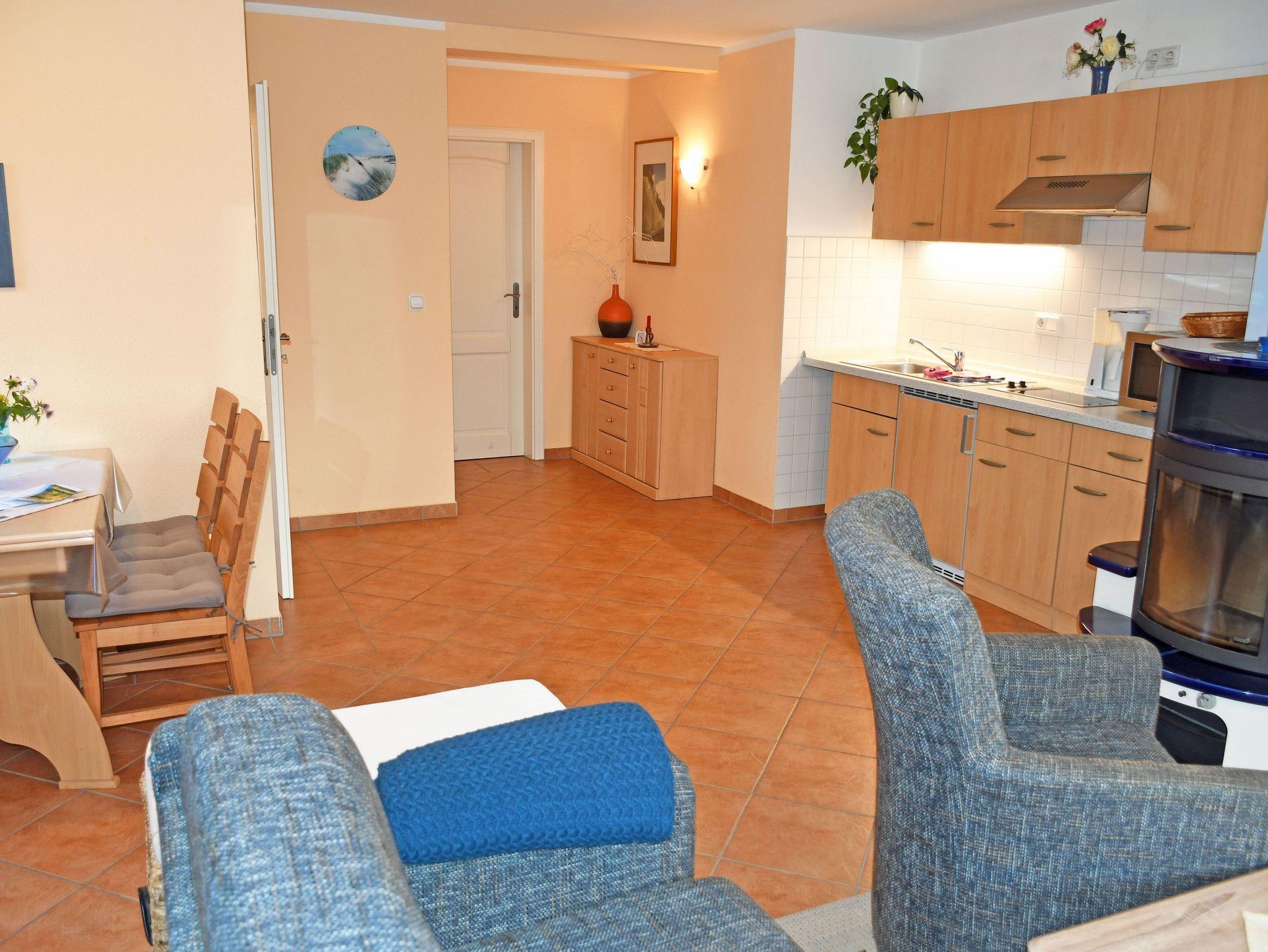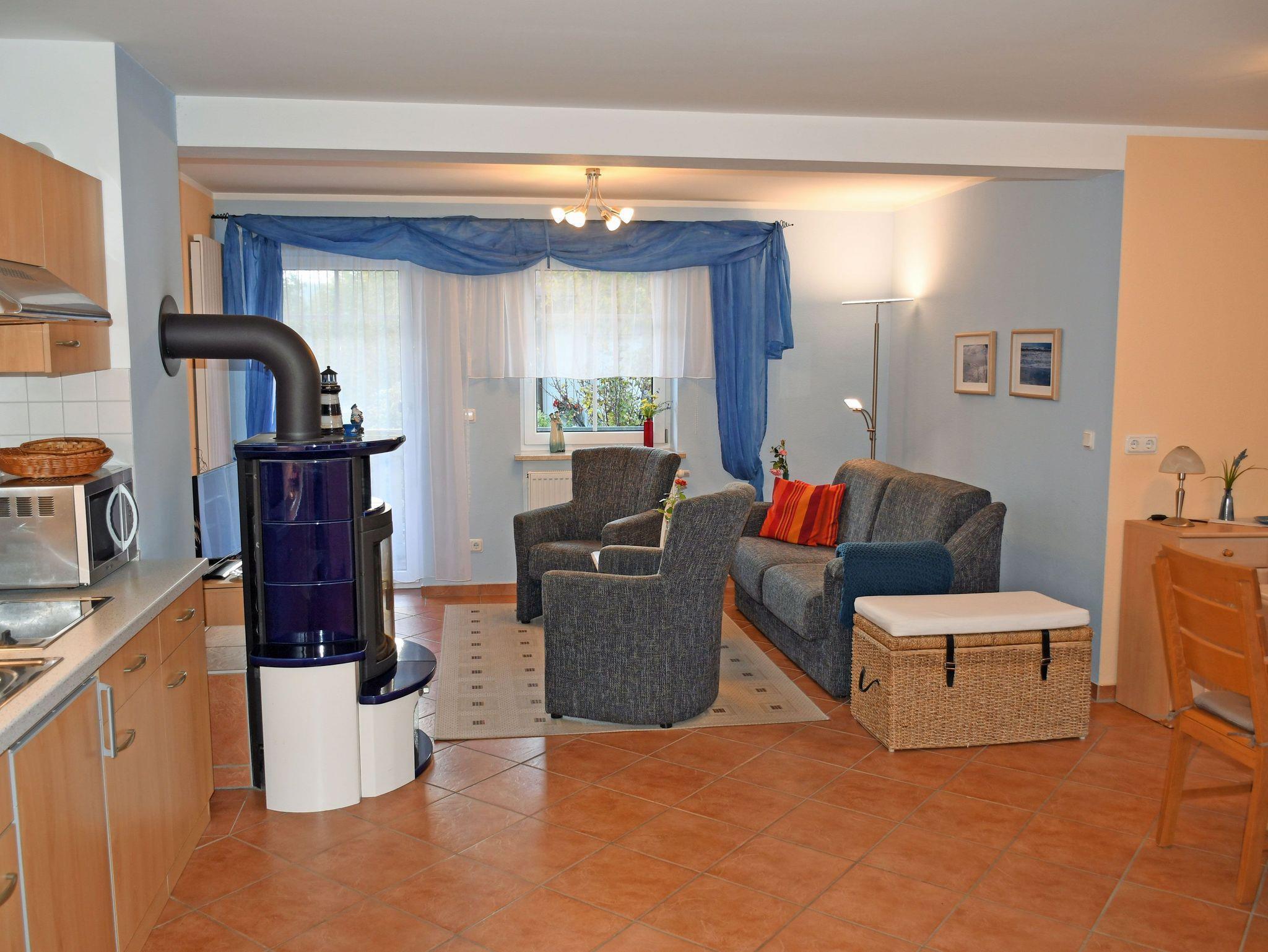 Nach dem Flur betreten Sie den stilvoll eingerichteten Wohnbereich mit bequemen Sitzmöbeln und einem modernen TV-Flachbildschirm. Hier steht auch ein Esstisch mit Stühlen. Daran an schließt sich die Küchenzeile mit Ceranherd, Mikrowelle, Abzugshaube, Wasserkocher, Toaster und Kaffeemaschine an. Für behagliche Wärme in der kälteren Jahreszeit sorgt ein Kamin im Wohnbereich.