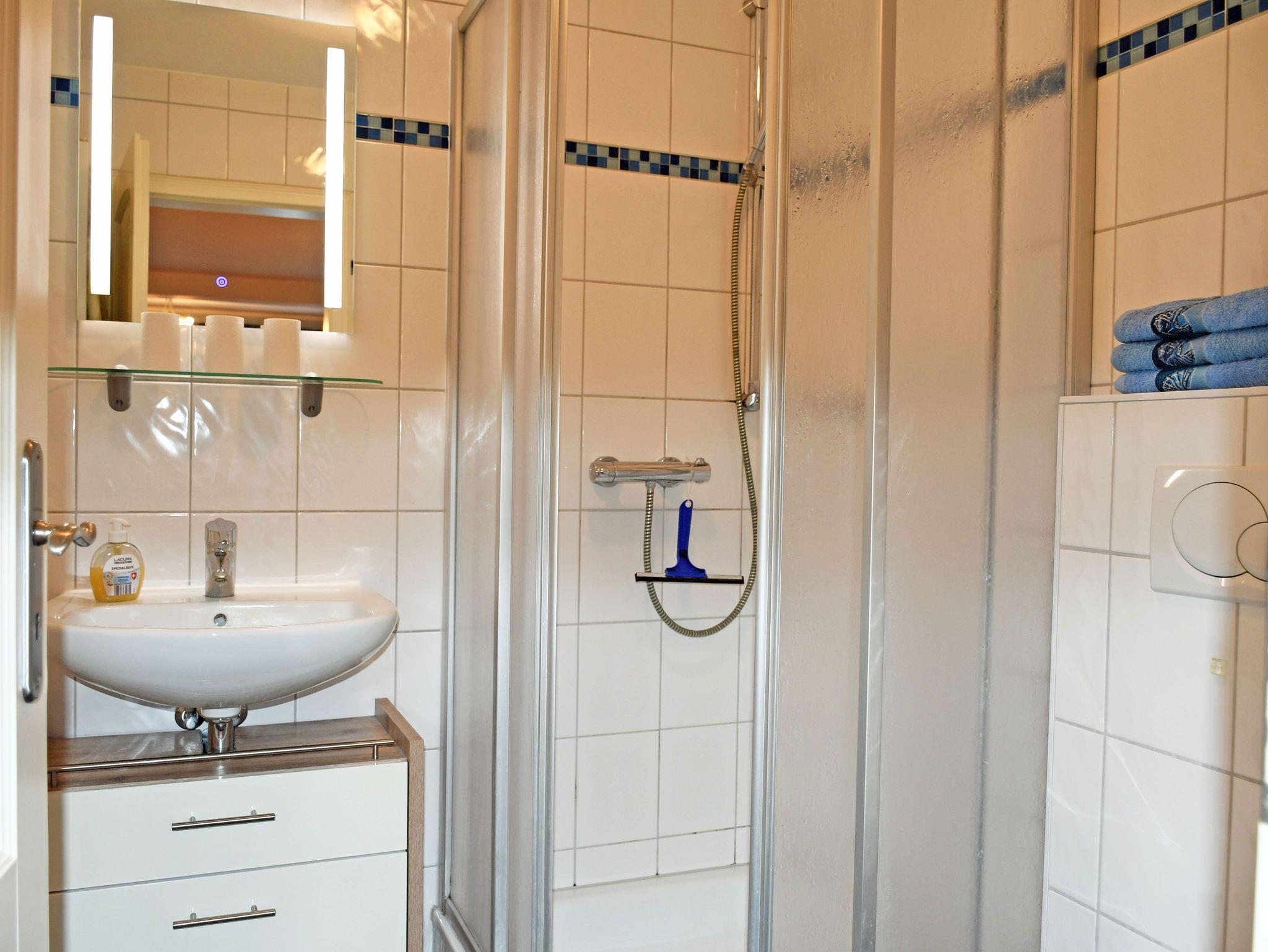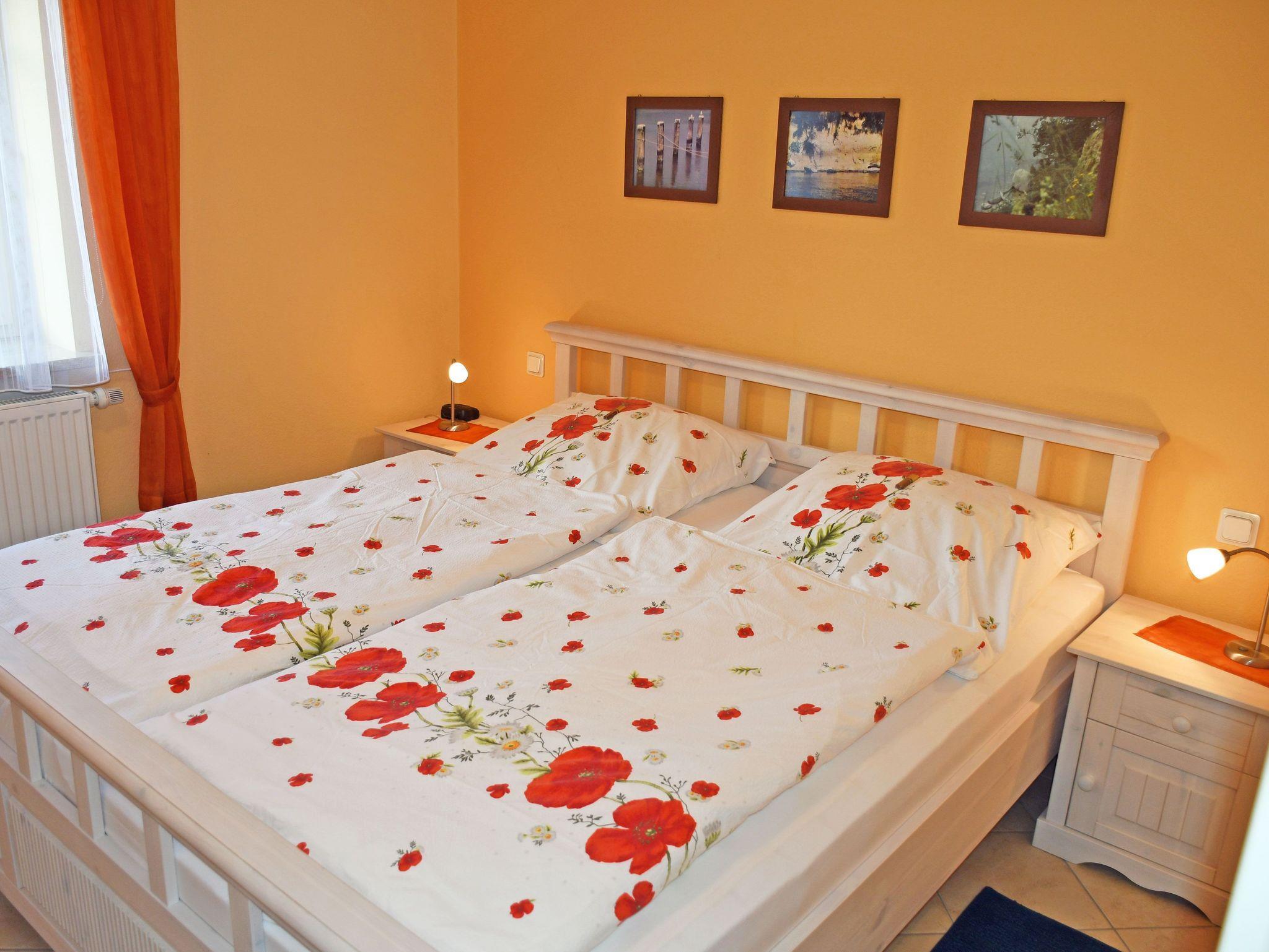 Im Schlafzimmer stehen ein Doppelbett mit Nachttischen und Leselampen sowie ein Schrank. Das Bad ist mit Dusche, WC und Waschbecken ausgestattet. Die Schlafcouch im Wohnzimmer kann für zwei Aufbettung genutzt werden (nicht für Kinder unter 5 Jahren geeignet). Es kann kein Kinderbett aufgsetellt werden.