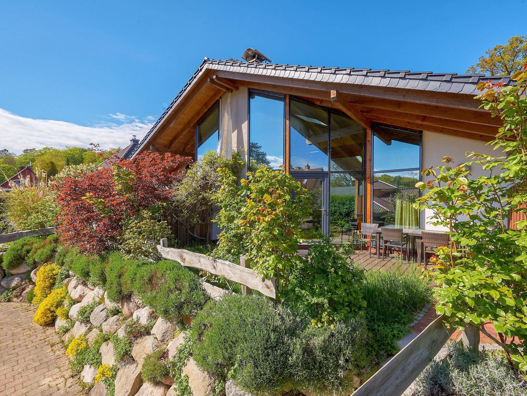 Die ca. 80 m² große 4-Raum-Maisonettewohnung verfügt im Erdgeschoss über ein modernes Wohnzimmer, das durch die großzügige Glasfassade sonnig und hell ist. Es ist komplett mit Fußbodenheizung ausgestattet und verfügt über eine überdachte Terrasse zur Südseite mit Sonnenliegen und Sitzgruppe.