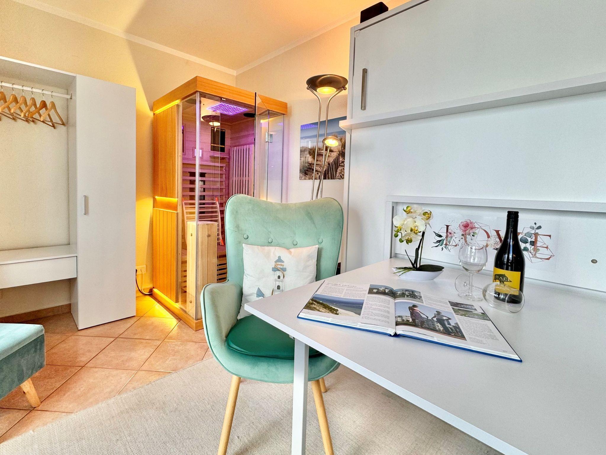 Willkommen in der Ferienwohnung Fewo 611 im Seepark Sellin! Unsere gemütliche Unterkunft bietet Platz für maximal 2 Personen und verfügt über ein Schlafzimmer und ein Badezimmer. Die Wohnung befindet sich in Haus Mönchgut und liegt in der 1. Etage. Als besonderes Highlight finden Sie in der Wohnung 611 Ihre eigene Infrarot - Sauna.